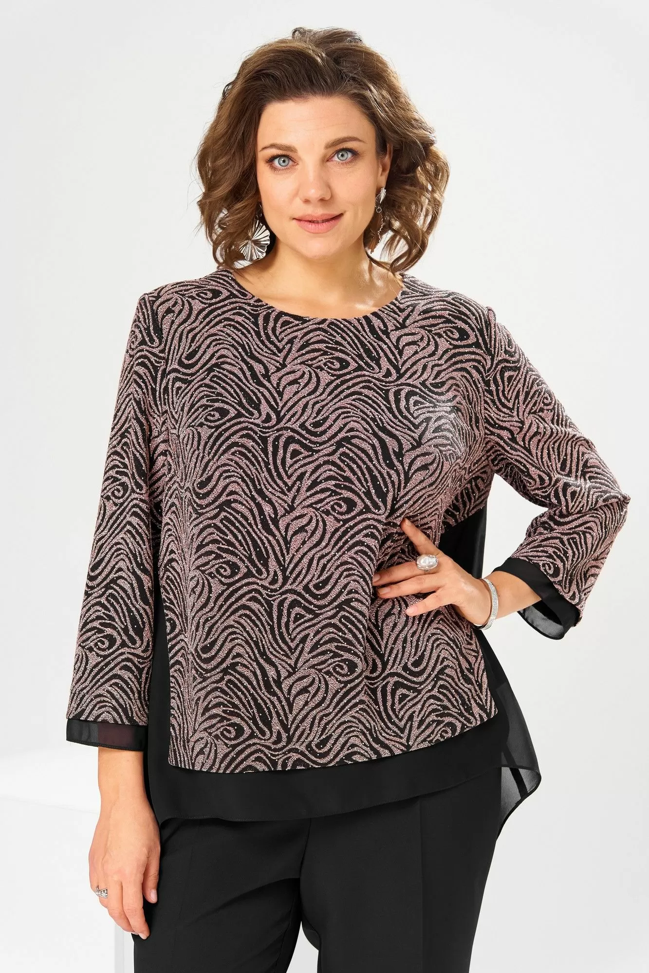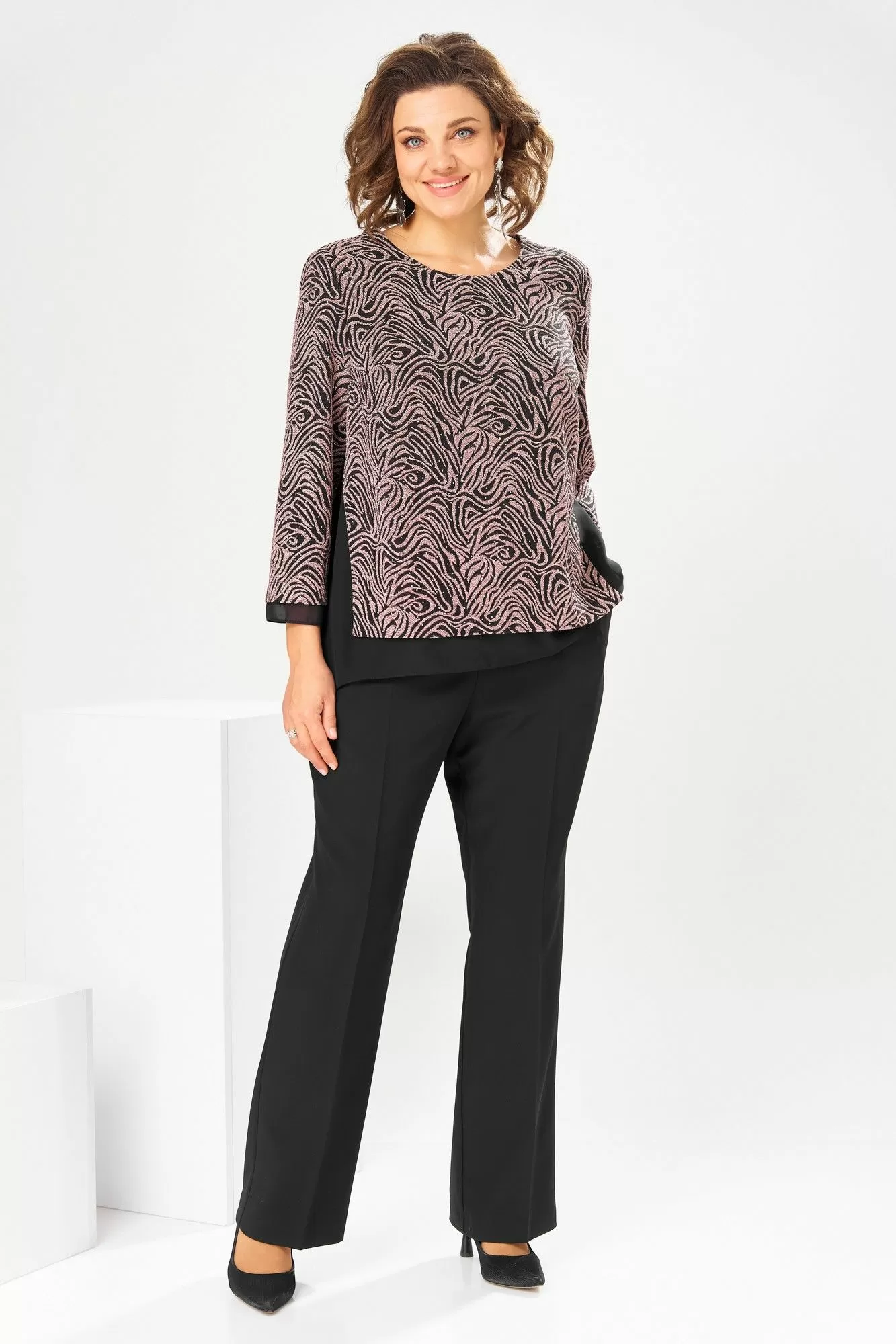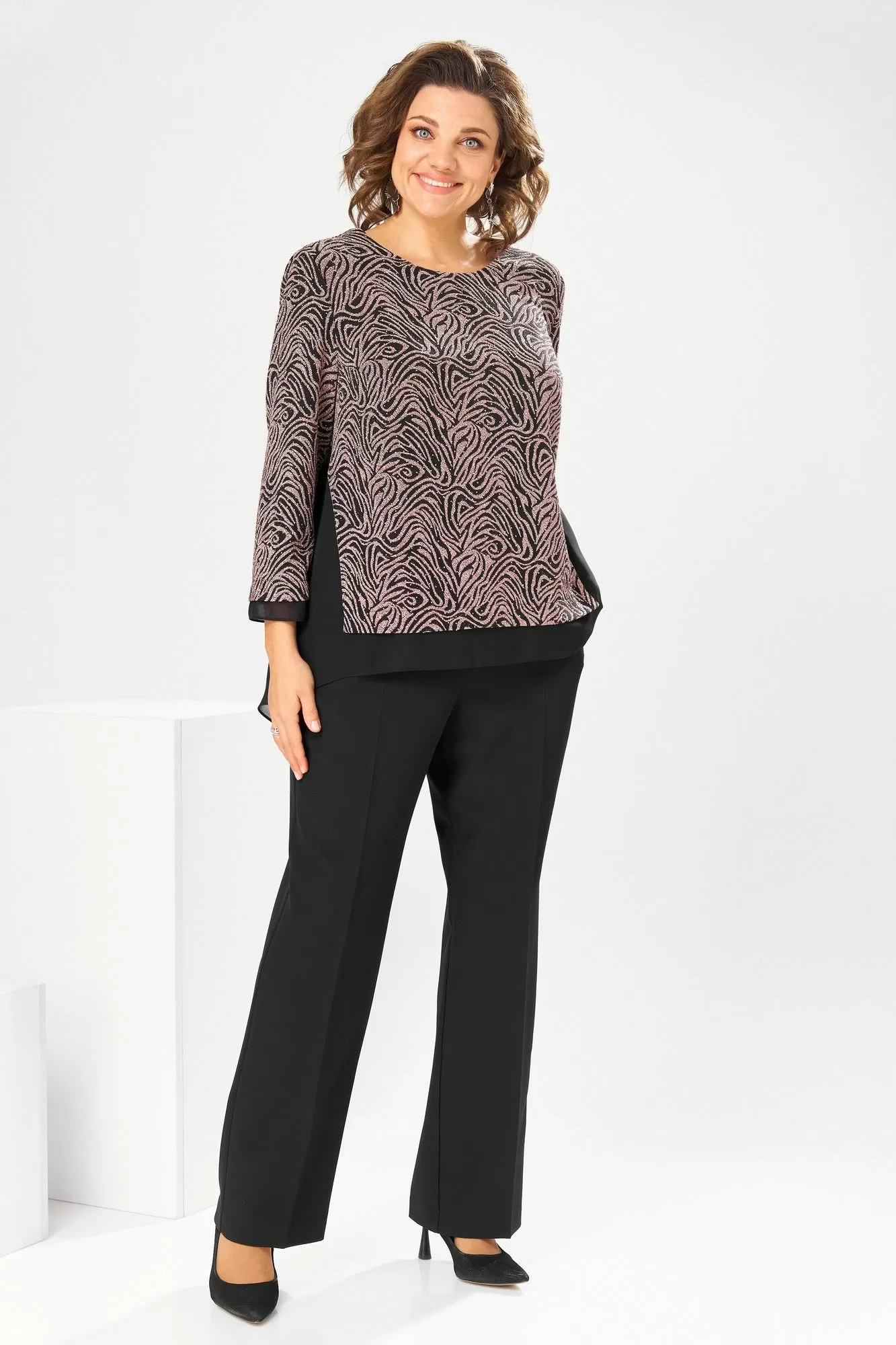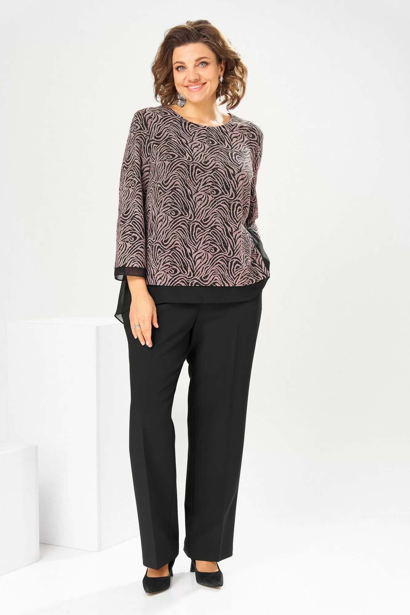 Костюм женский предназначен для торжественной носки: блузон и брюки. Блузон прямого силуэта, длиной до линии бедер с фигурным низом. Перед с двумя нагрудными вытачками. Спинка с отрезной кокеткой со средним швом, с бантовой складкой, переходящая на перед. Горловина круглая, обтачная, без воротника. Застежка на среднем шве кокетки спинки на одну навесную петлю и одну пришивную пуговицу. Рукав одношовный, длиной 7/8 с притачной отделочной деталью. Блузон с плечевыми накладками. Брюки прямые, слегка заужены книзу. Передние и задние половинки с талиевыми вытачками. Застежка на тесьму-молнию в среднем шве брюк. Верхний срез с притачным поясом, застегивающийся на одну обметанную петли и одну пришивную пуговицу. Длина спинки 77 см. Длина рукава 50 см. Длина брюк 103,5 см