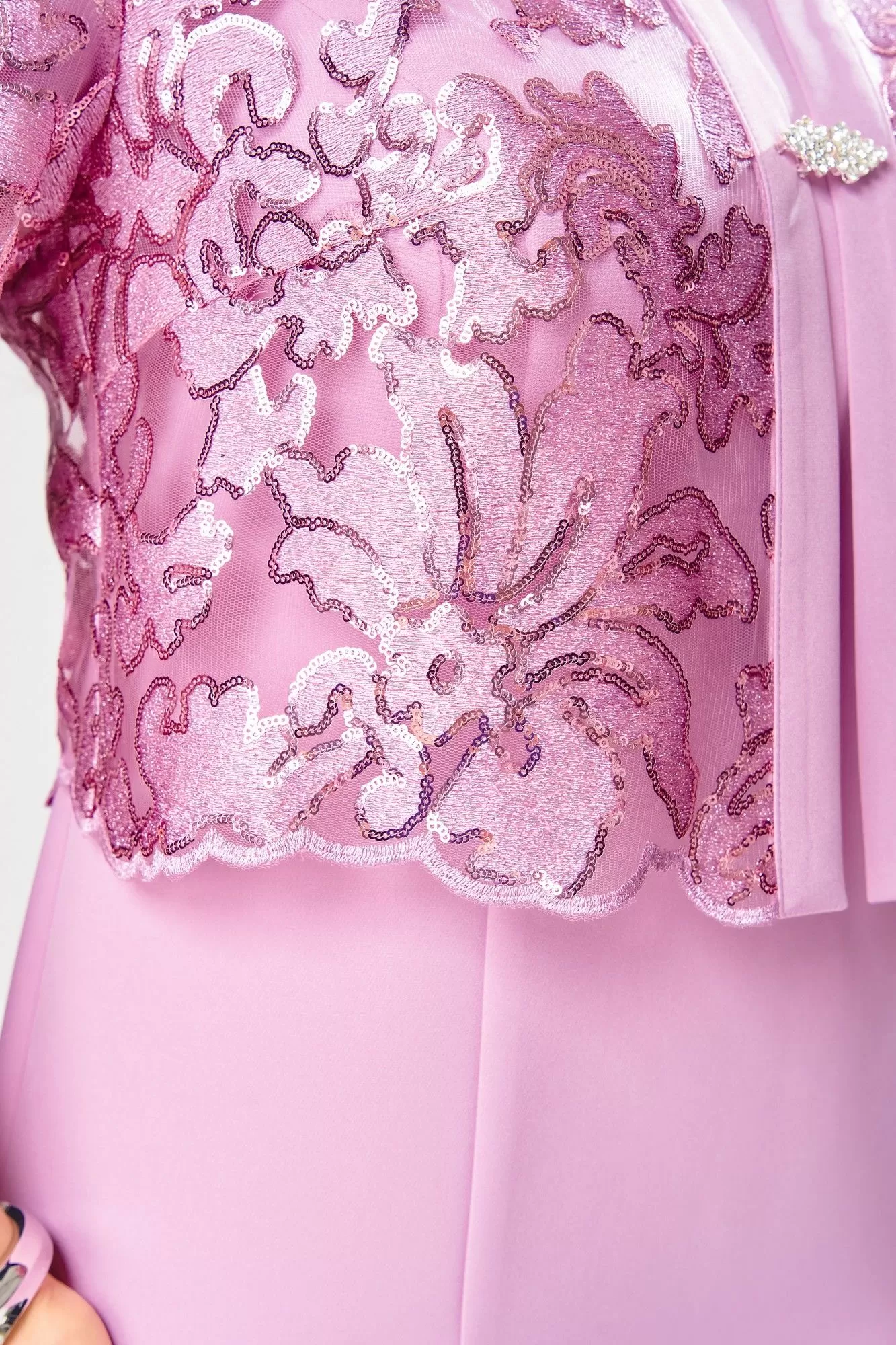 Комплект женский, относится к торжественно-нарядной одежде. Комплект женский, 2-х предметный, жакет и платье. Жакет женский прямого силуэта, длиной до линии талии, выполнен из кружевного полотна. Перед с 2-мя нагрудными вытачками, с 2-мя притачными вертикальными планками, с притачными планками по горловине. Спинка с притачной планкой по горловине. Горловина круглая, обточная, без воротника. Застёжка на декоративный пришивной крючок. Рукав втачной одно шовный, длиной 3/4 с притачной манжетой. Жакет без плечевых накладок. Платье женской длиной за колено, полу прилегающего силуэта. Перед с 2-мя отрезными бочками. Спинка с 2-мя таллиевыми вытачками, со средним швом, заканчивающимся шлицей. Горловина круглая, обточная, без воротника. Застёжка на потайную тесьму-молнию в среднем шве спинки. Рукав втачной, короткий, одно шовный. Платье с плечевыми накладками. Длина спинки жакета 45 см, длина рукава 41 см. Длина спинки платья 100 см, длина рукава 19 см.