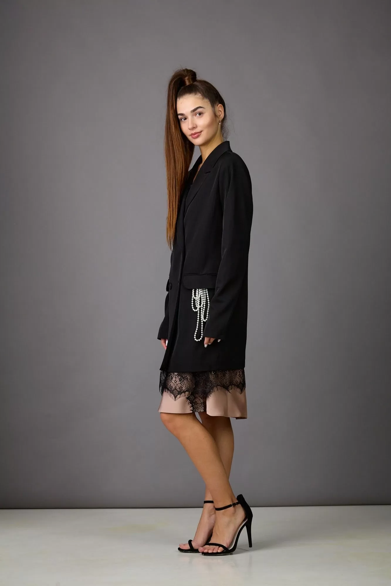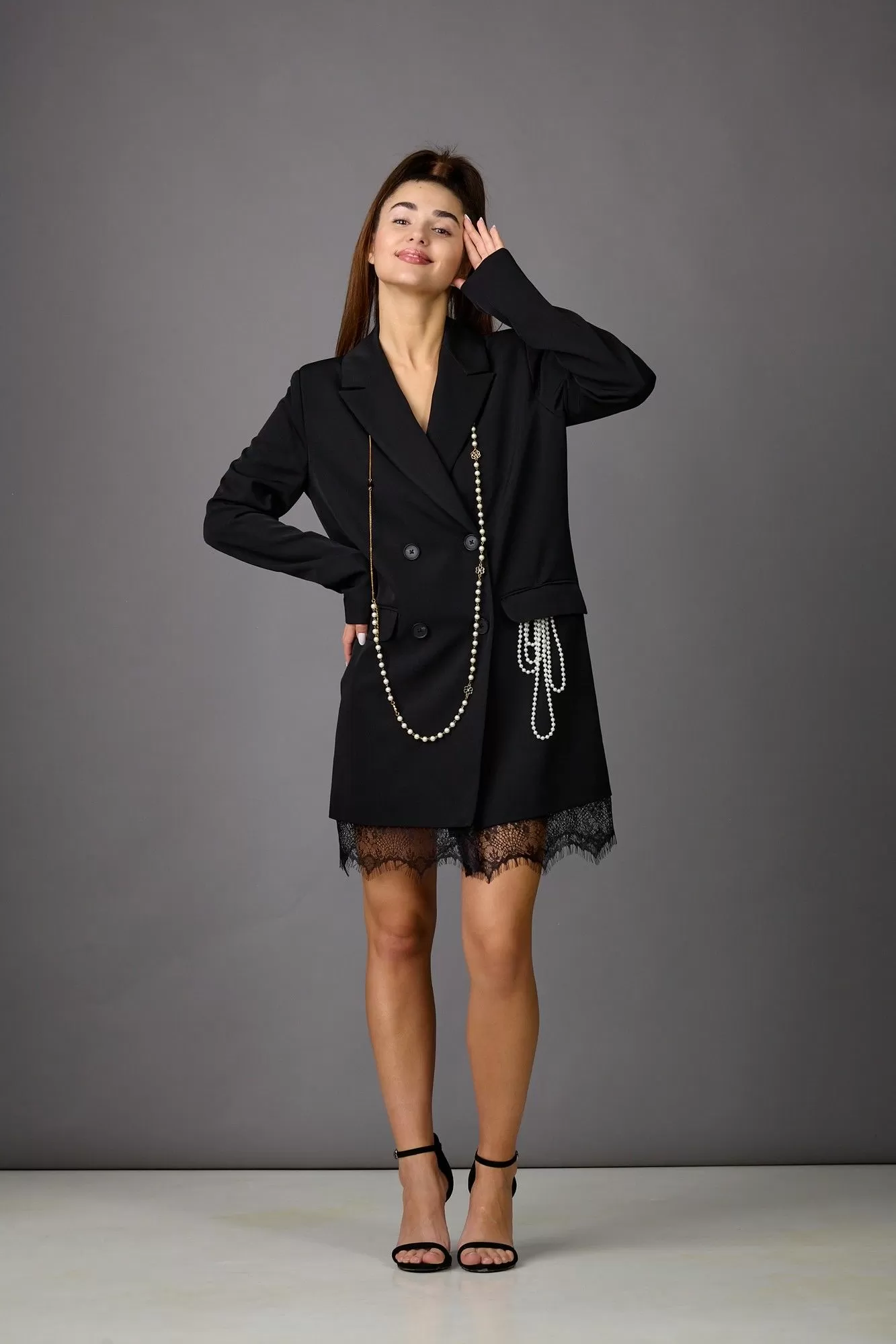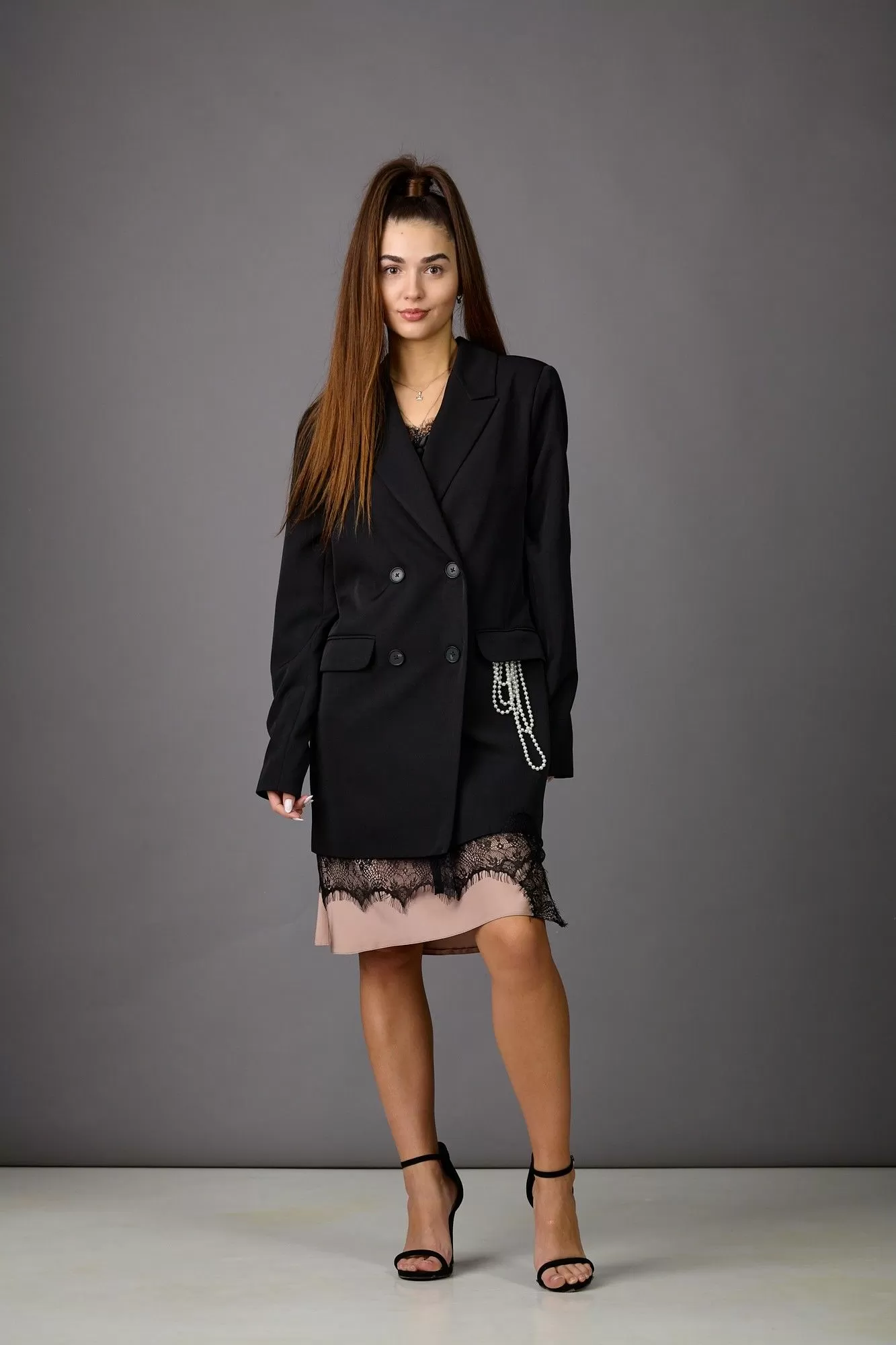 Представляем жакет женский из костюмной ткани на подкладке,который станет незаменимым спутником в вашей жизни. Лаконичный прямой силуэт жакета с двубортной застежкой прекрасно сочетается с нежным кружевом шантильи по низу. По переду- прорезные карманы с клапанами. В левом кармане брошь, имитирующая горсть жемчуга, выпадающего из кармана. Брошь сьемная, входит в комплект с жакетом. Воротник-с отложными лацканами пиджачного типа. Рукава двухшовные, длинные. Жакет можно носить, как самостоятельно, так и в сочетании с платьями- комбинациями, юбками, брюками. Длина жакета 44-48р - 82см +5см кружево, 50-54р- 84см+5см кружево