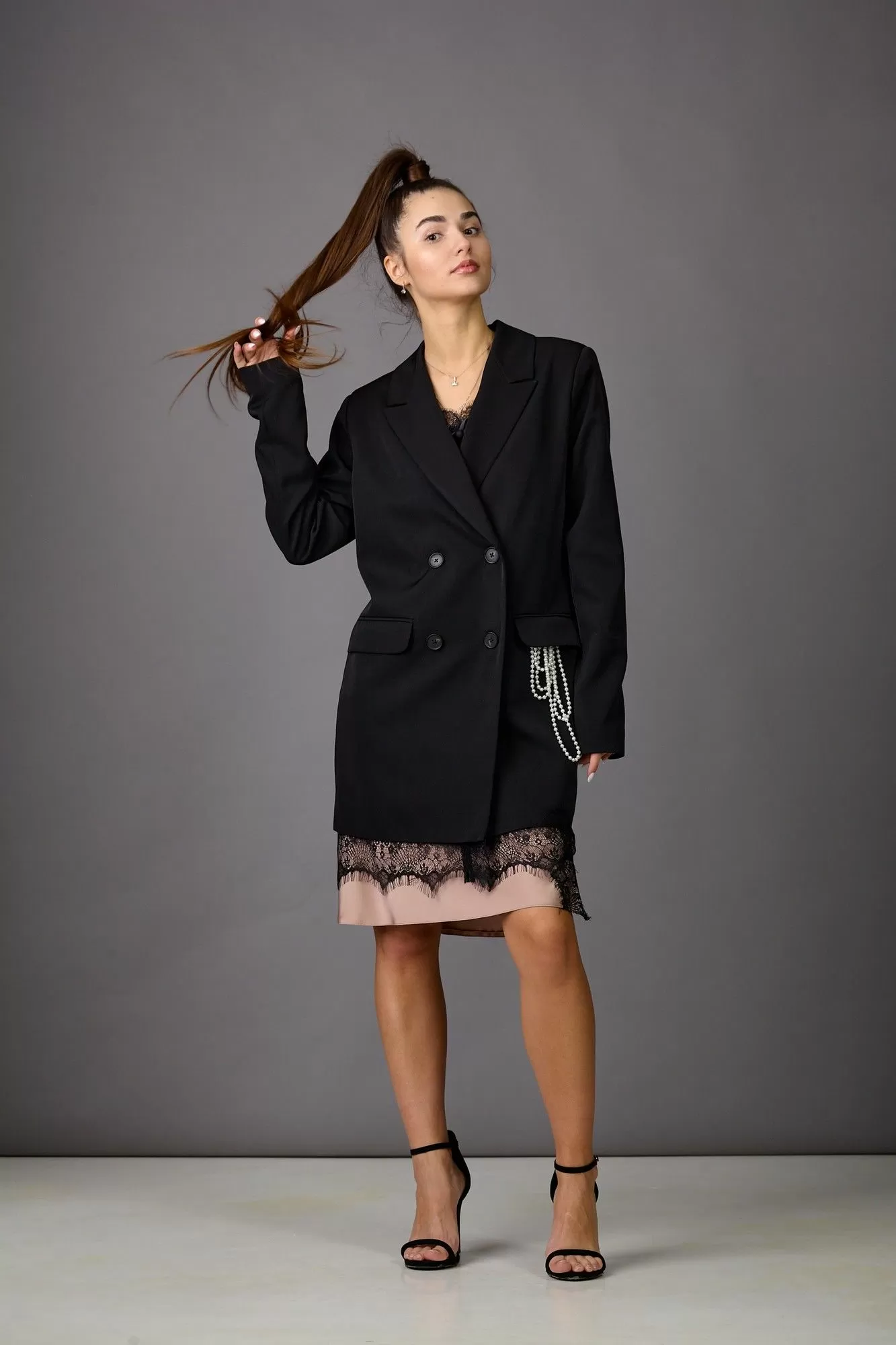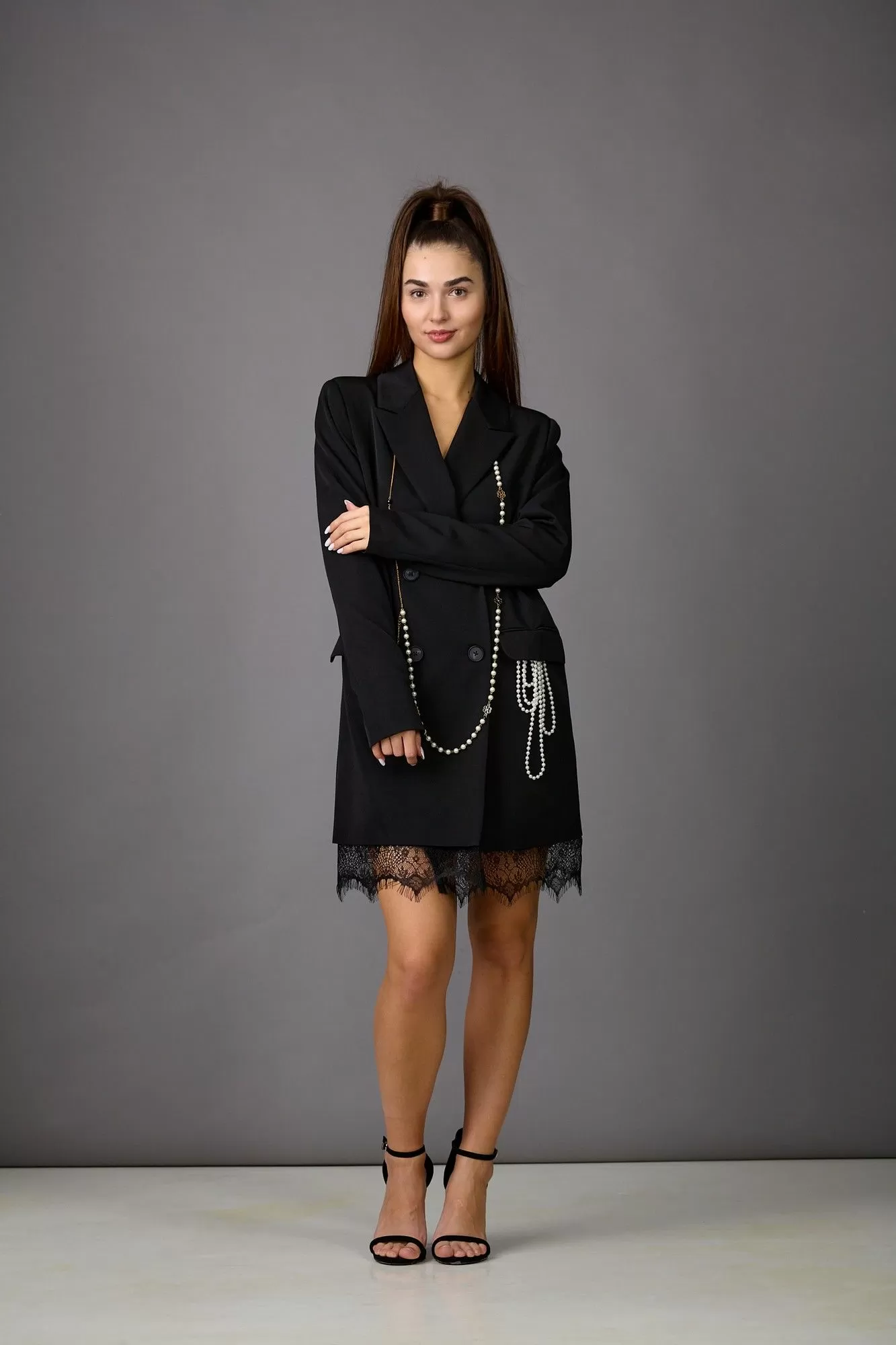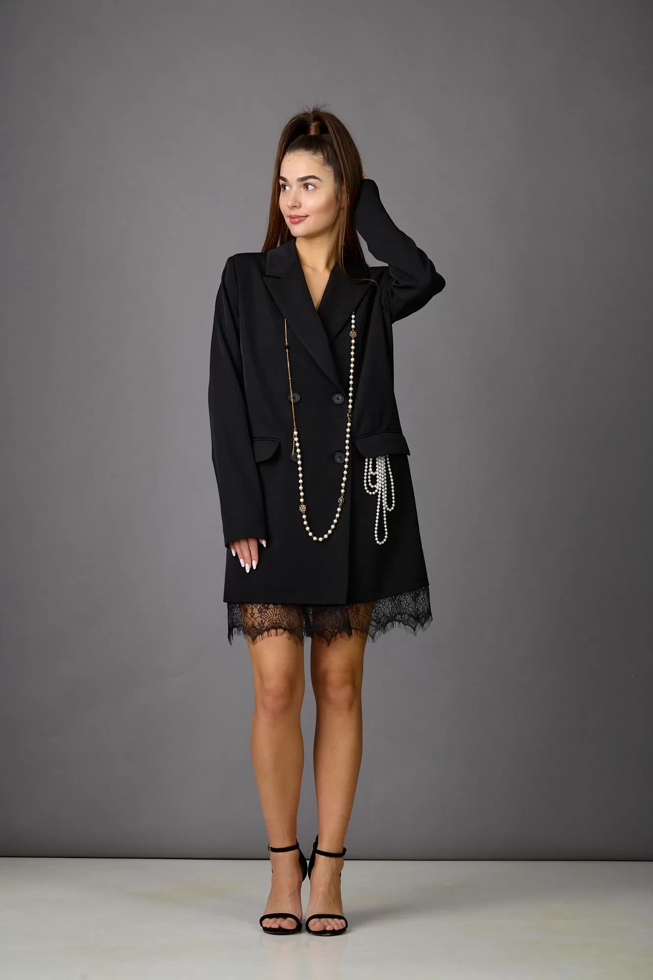 Представляем жакет женский из костюмной ткани на подкладке,который станет незаменимым спутником в вашей жизни. Лаконичный прямой силуэт жакета с двубортной застежкой прекрасно сочетается с нежным кружевом шантильи по низу. По переду- прорезные карманы с клапанами. В левом кармане брошь, имитирующая горсть жемчуга, выпадающего из кармана. Брошь сьемная, входит в комплект с жакетом. Воротник-с отложными лацканами пиджачного типа. Рукава двухшовные, длинные. Жакет можно носить, как самостоятельно, так и в сочетании с платьями- комбинациями, юбками, брюками. Длина жакета 44-48р - 82см +5см кружево, 50-54р- 84см+5см кружево