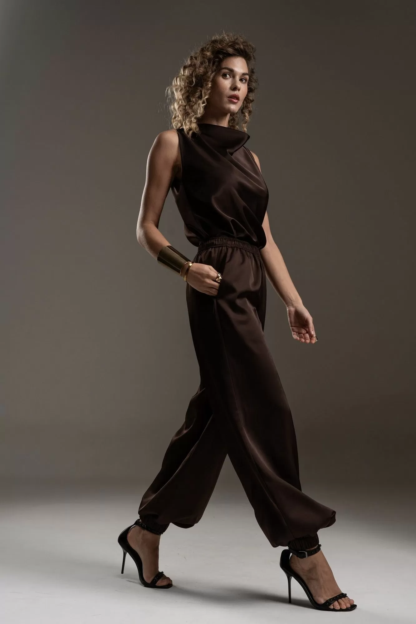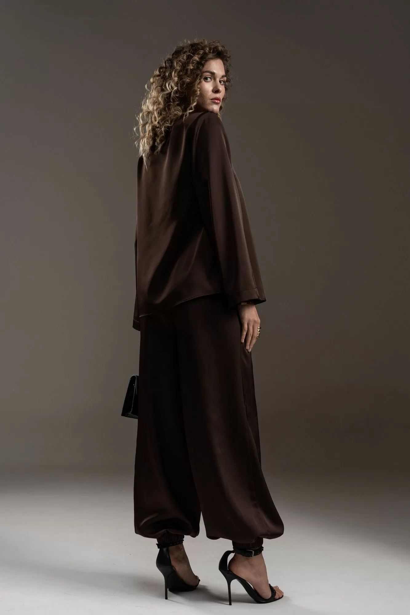 Брюки - "алладины", широкие, с поясом на резинке. Низ брюк собран на резинку. Карманы в боковых швах. Шелковистая ткань делает образ стильным и завораживающим. Брюки "алладины"- современный тренд благодаря сочетанию комфорта и стиля. Длина брюк с поясом +- 106 см Ширина брюк по низу до резинки в 44 р.+- 69 см. Обхват резинки по низу брюк в 44 р.: +-25 см. Параметры брюк в готовом виде в 44 р.: обхват талии 68 см, обхват бедер 102 см.
