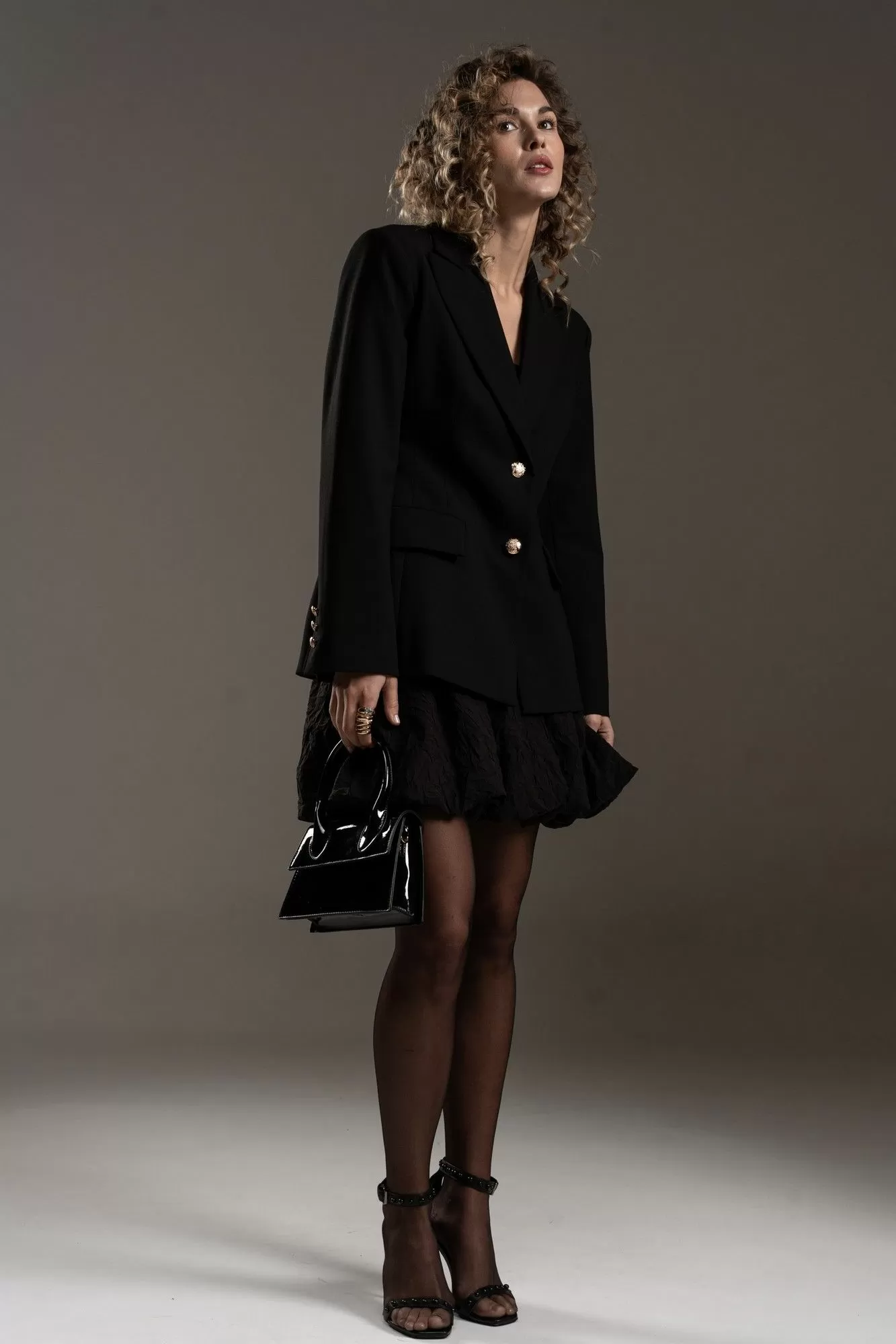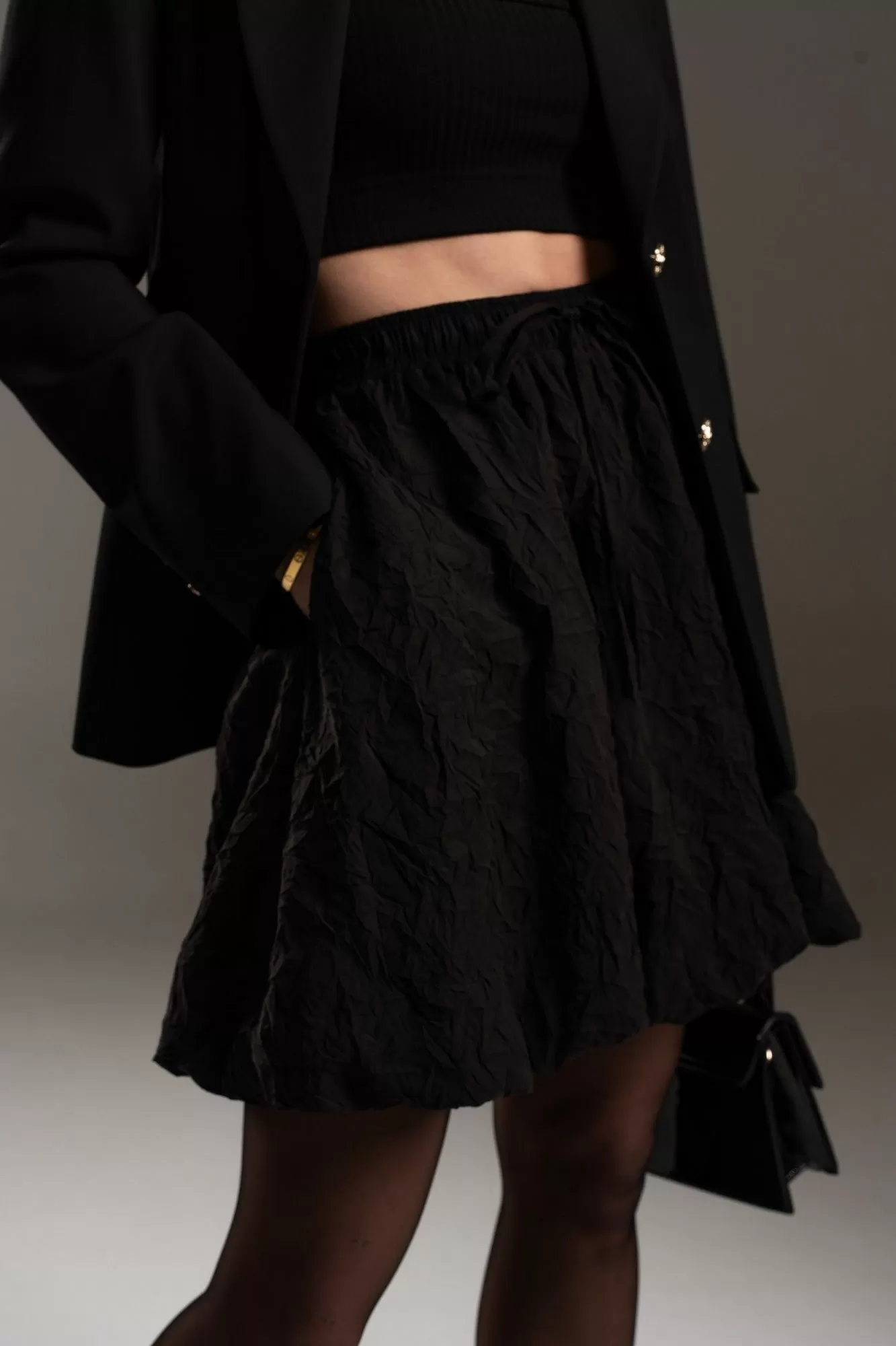 Стильная мини юбка баллон на подкладке из эффектной "жатой" вискозы. Силуэт А-образный, отрезной пояс на резинке с кулисой. В боковых швах карманы. Длина юбки с поясом по боковому шву 47 см.