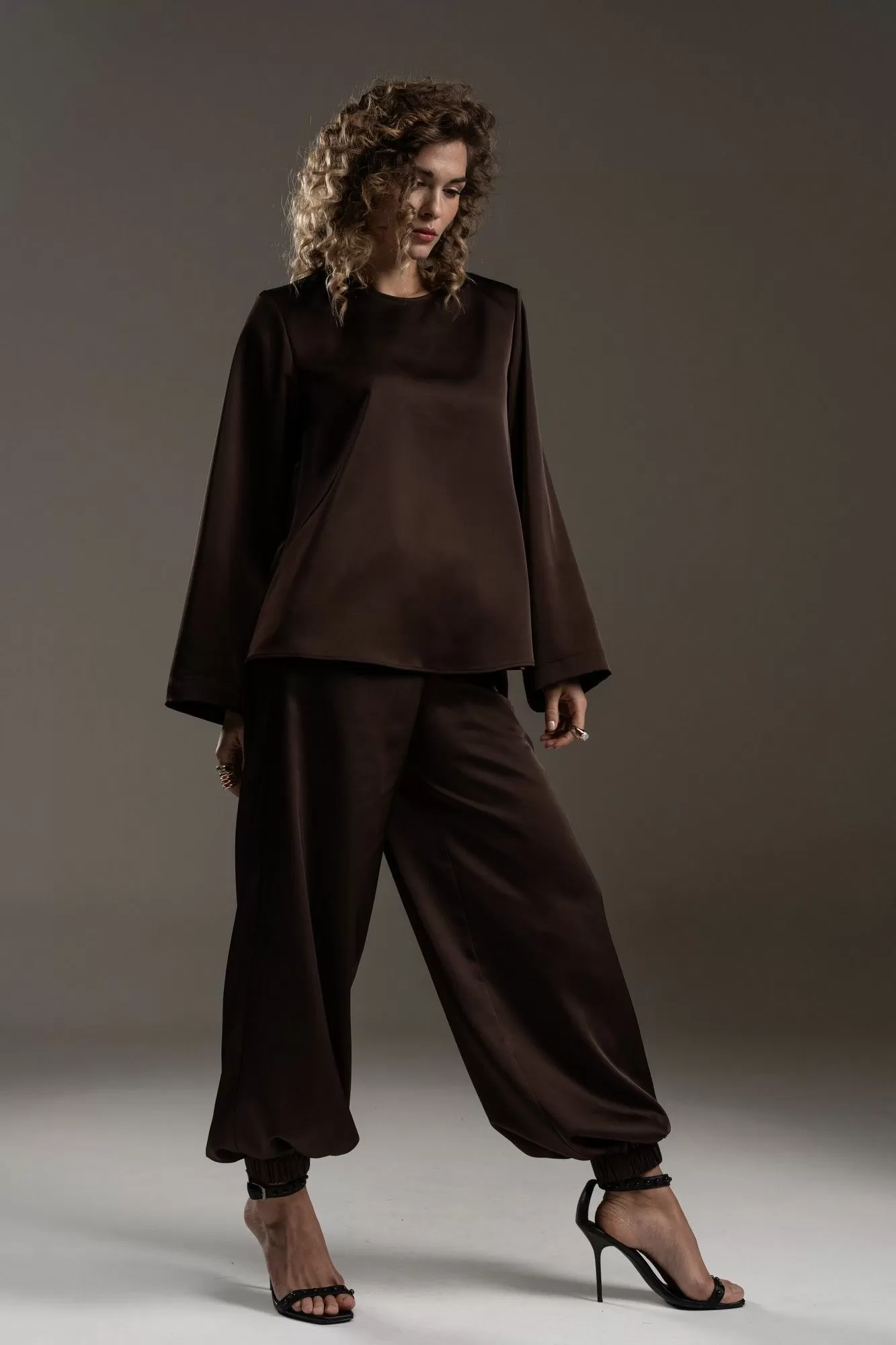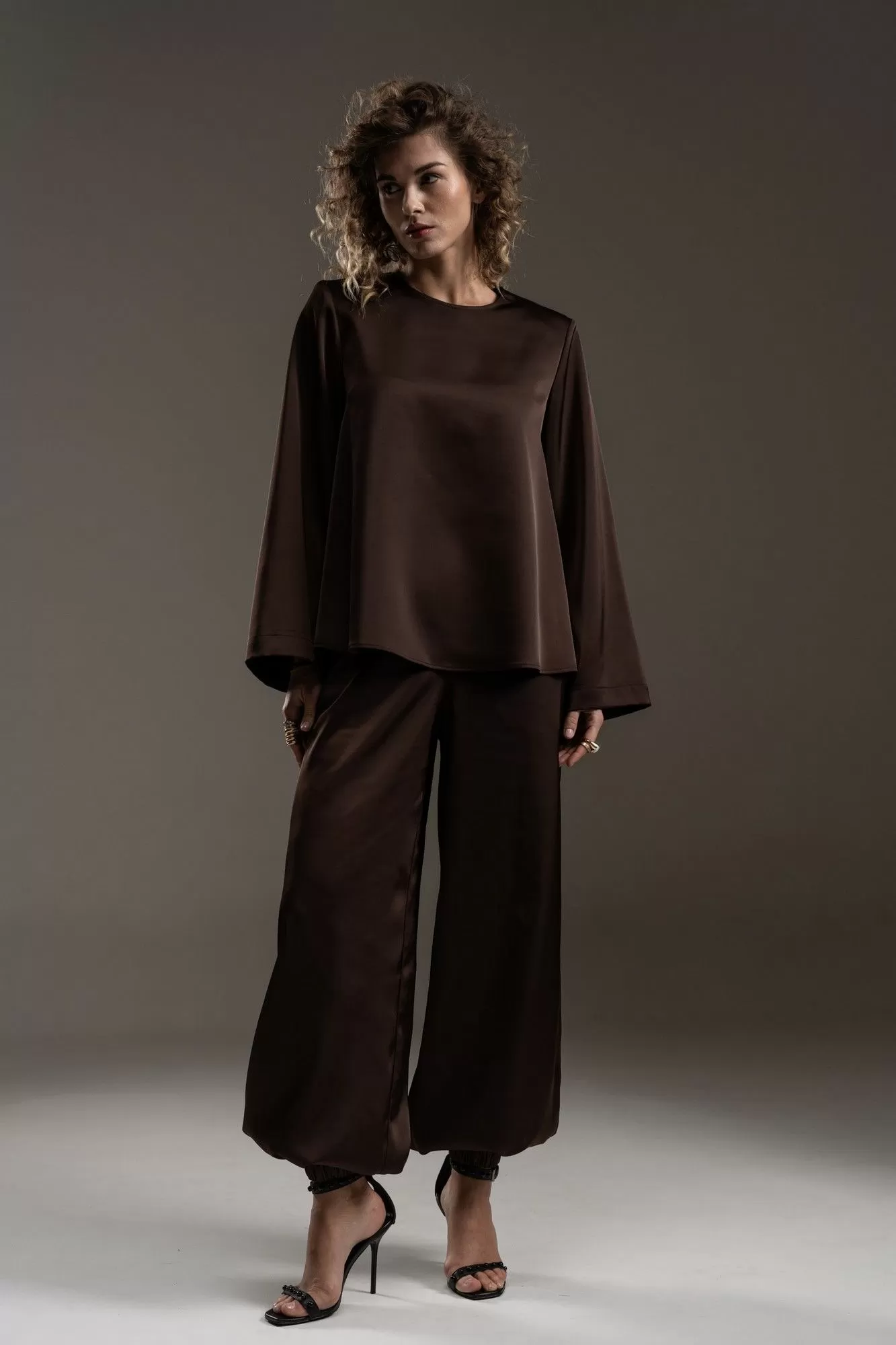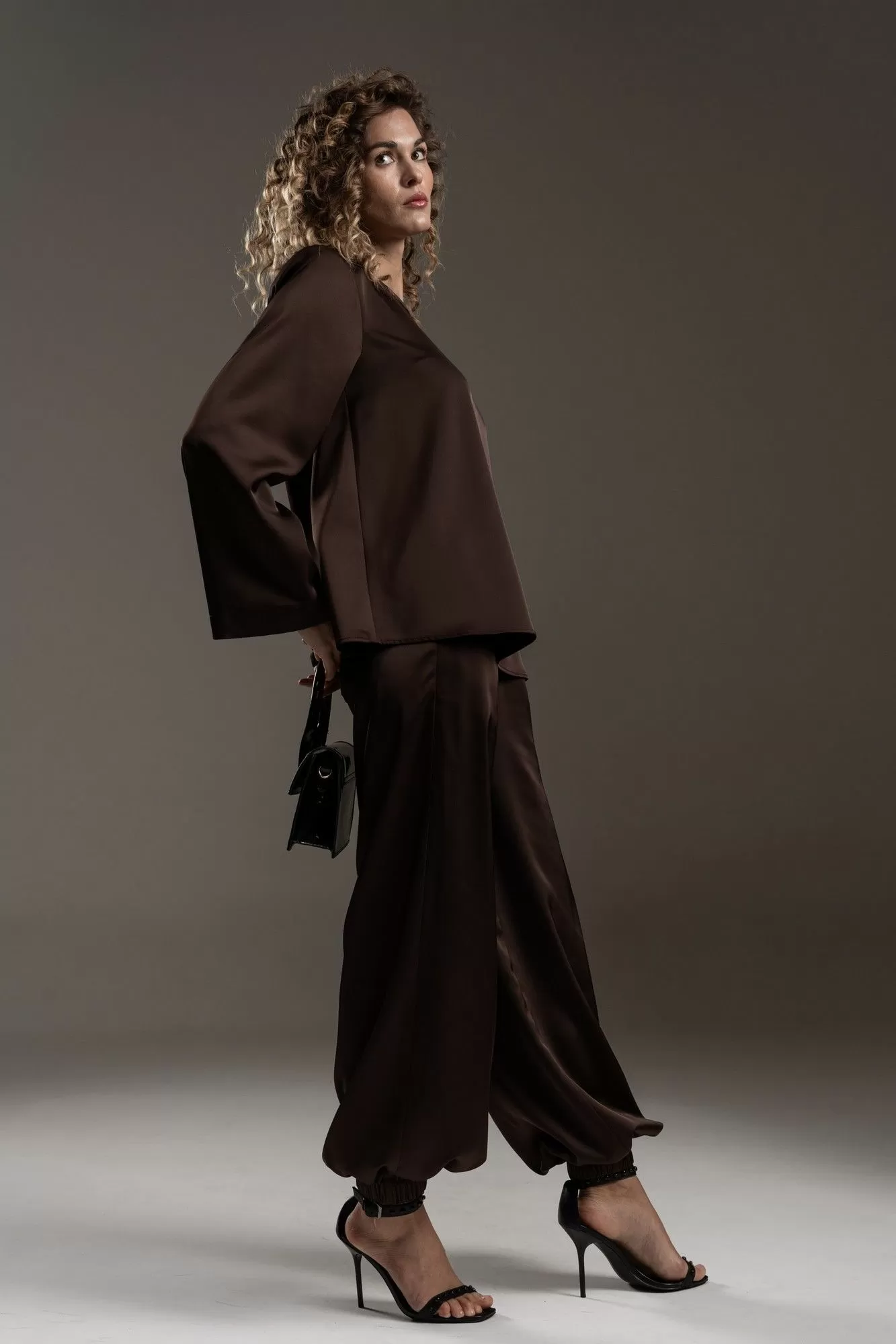 Блузка свободного силуэта, с подплечниками, в глубоком шоколадном оттенке с деликатным сатиновым блеском. Рукав втачной, прямой. По центру спинки обработана застежка на навесную петлю с пуговичкой. Длина по центру спинки 66 см. Длина рукава 61 см. Ширина блузки в области груди, под проймой (в полуобхвате) в 44 размере - 49 см. Ширина по низу изделия (в полуобхвате) в 44 размере 61см. Ширина по низу рукава ( в полуобзвате) в 44 размере 20,5 см.