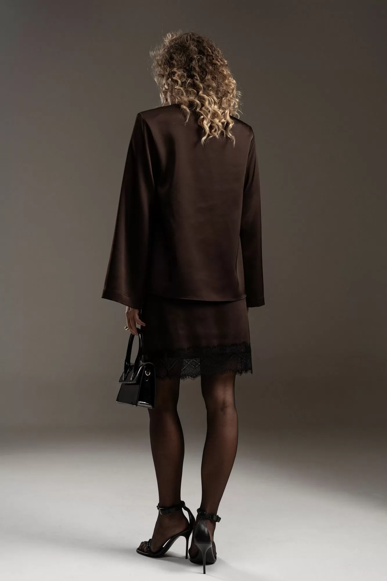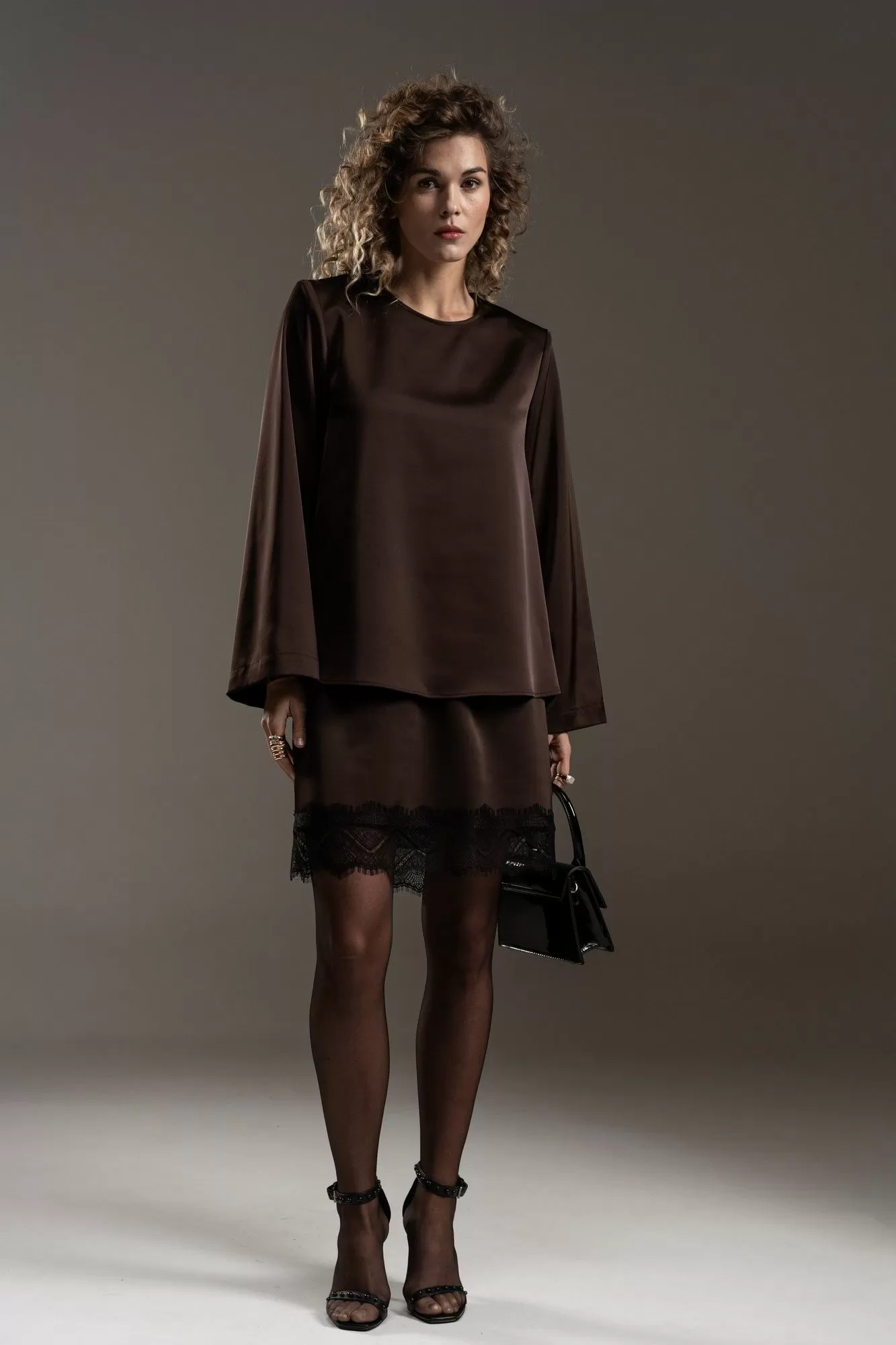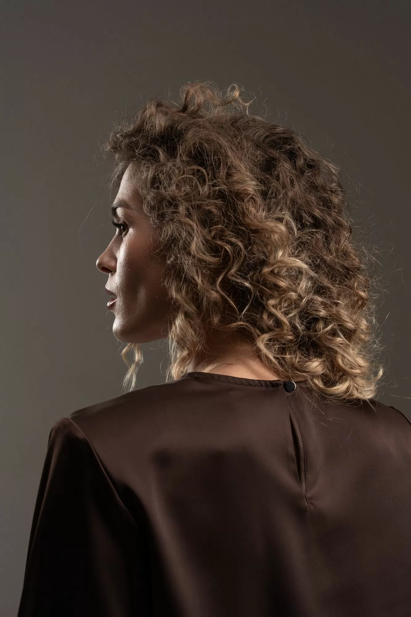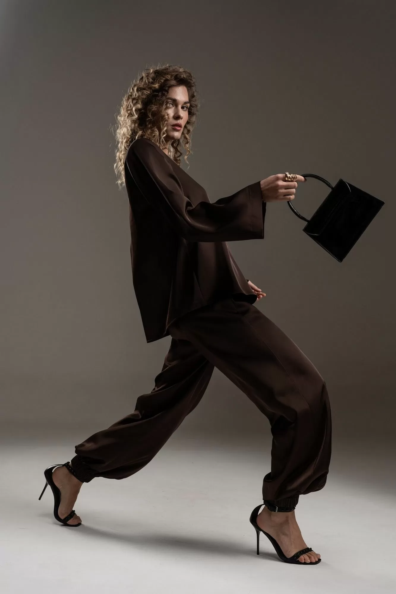 Блузка свободного силуэта, с подплечниками, в глубоком шоколадном оттенке с деликатным сатиновым блеском. Рукав втачной, прямой. По центру спинки обработана застежка на навесную петлю с пуговичкой. Длина по центру спинки 66 см. Длина рукава 61 см. Ширина блузки в области груди, под проймой (в полуобхвате) в 44 размере - 49 см. Ширина по низу изделия (в полуобхвате) в 44 размере 61см. Ширина по низу рукава ( в полуобзвате) в 44 размере 20,5 см.