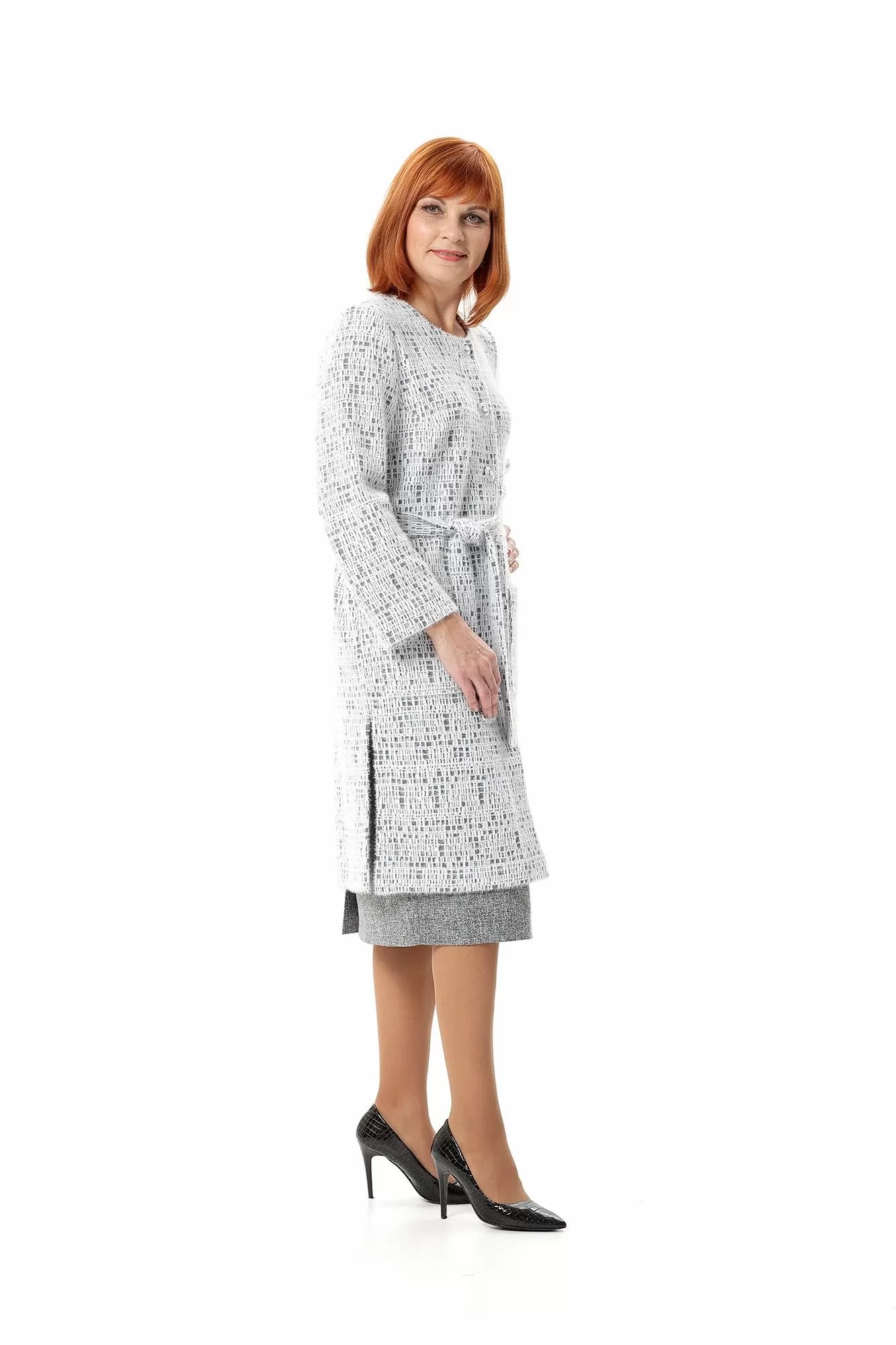 Кардиган женский, прямого силуэта. Перед с нагрудной вытачкой из проймы и накладными карманами. В боковых швах - разрезы. Центральная застежка на петли и пуговицы. Рукав втачной, без плечевых накладок. Тканеый пояс в комплекте. Длина рукава - 58 см, длина изделия по спинке - 102 см.