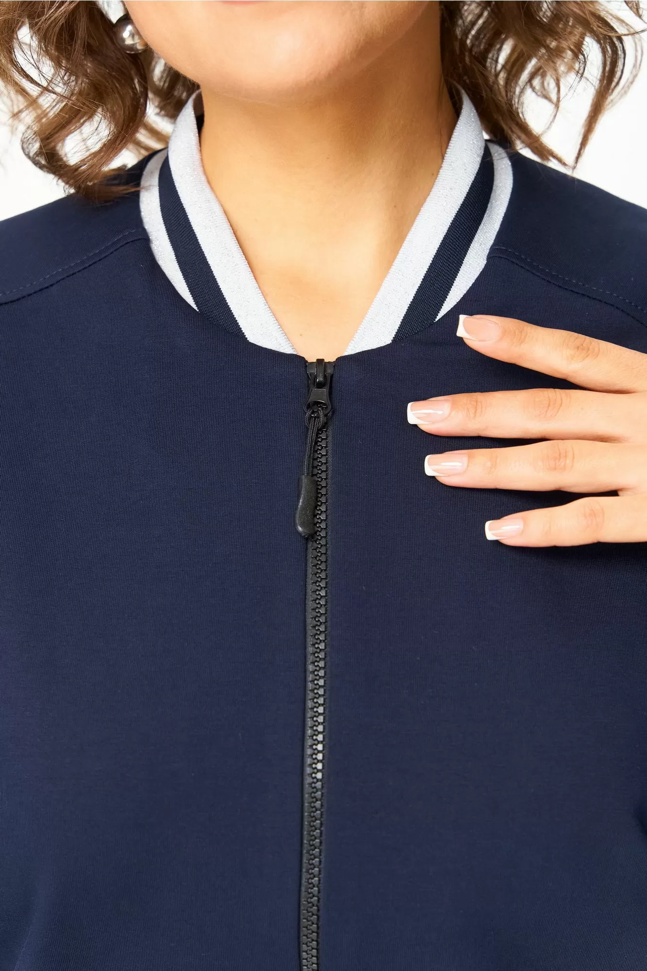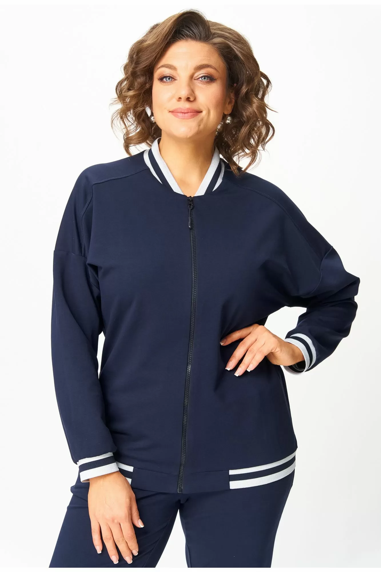 Комплект женский, двухпредметный, состоящий из свитшота и брюк. Свитшот со спущенным рукавом, с довязами-резинкой по горловине и по низу. Рукав с довязом-резинкой по низу, свитшот с застежкой-молнией по переду. Брюки зауженные к низу, в боковых швах карманы, пояс на резинке.