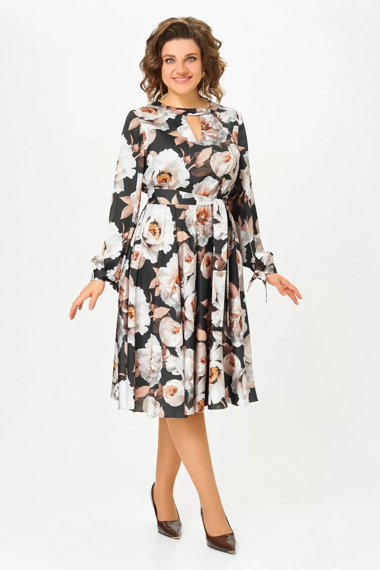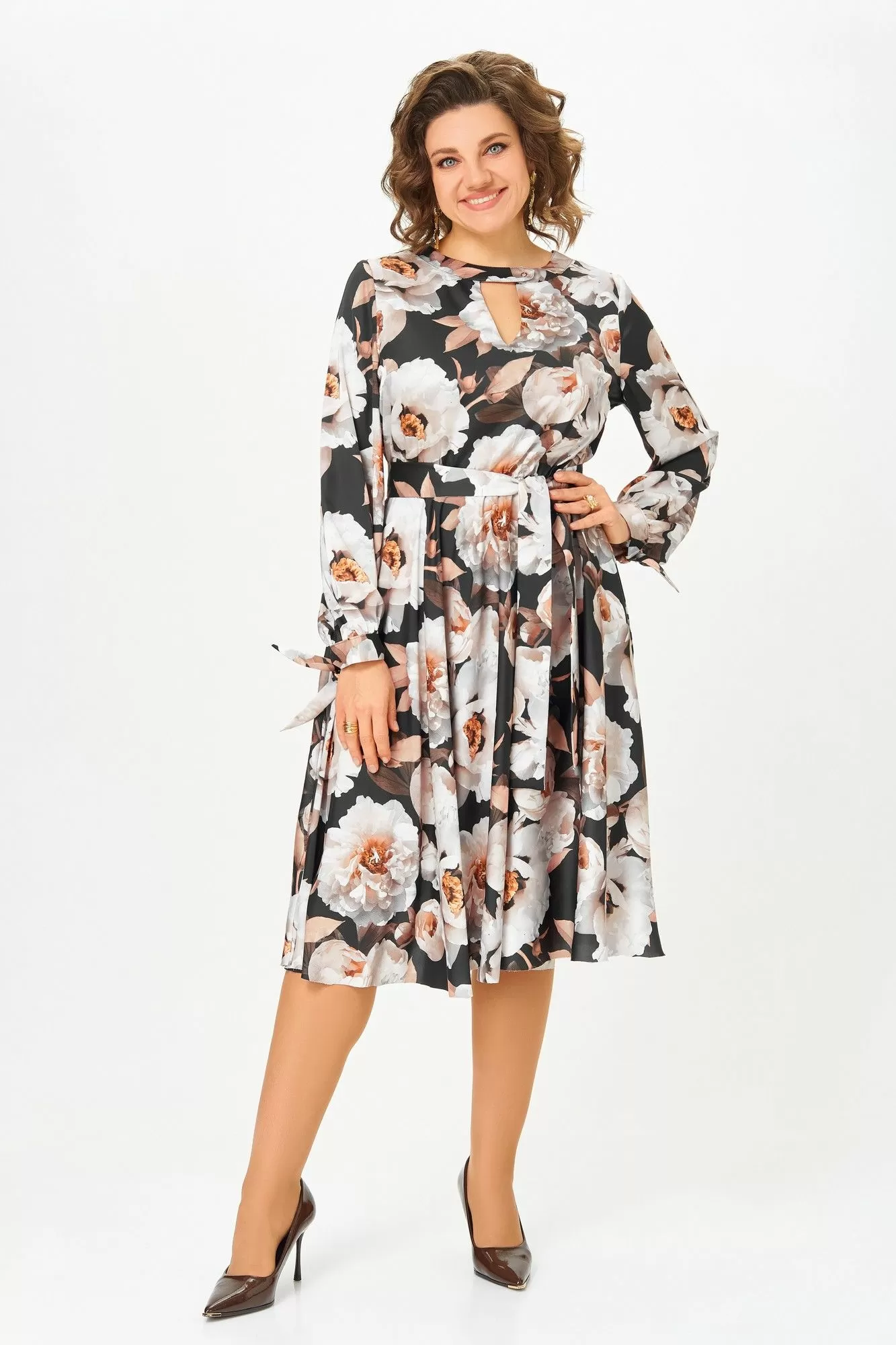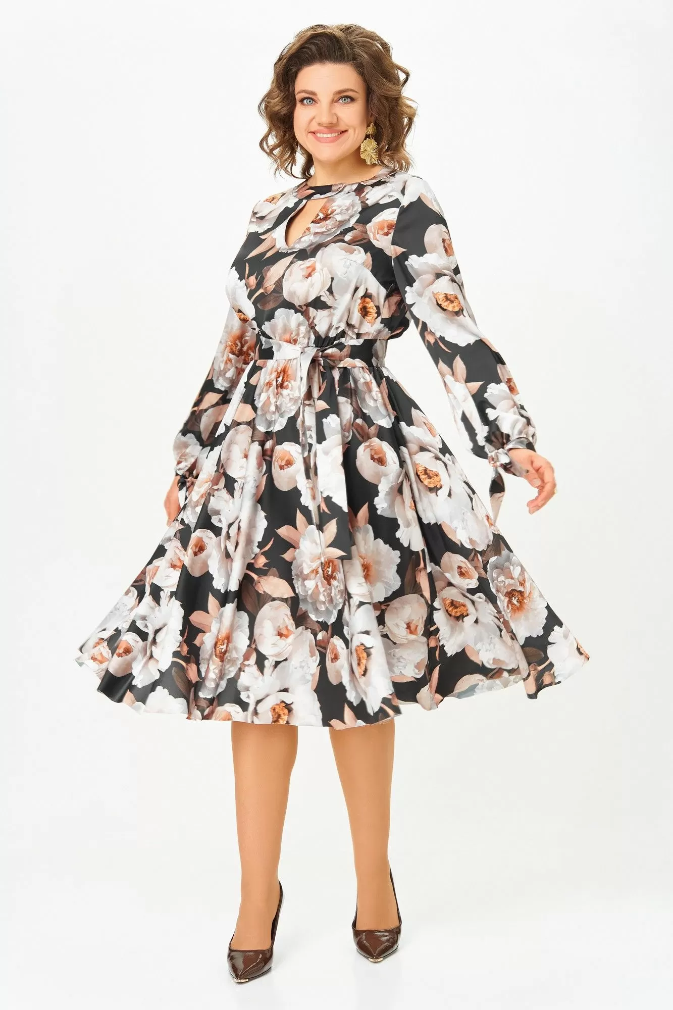 Платье из нежной ткани, имитирующей шёлк, Х-образного силуэта, отрезное по линии талии.