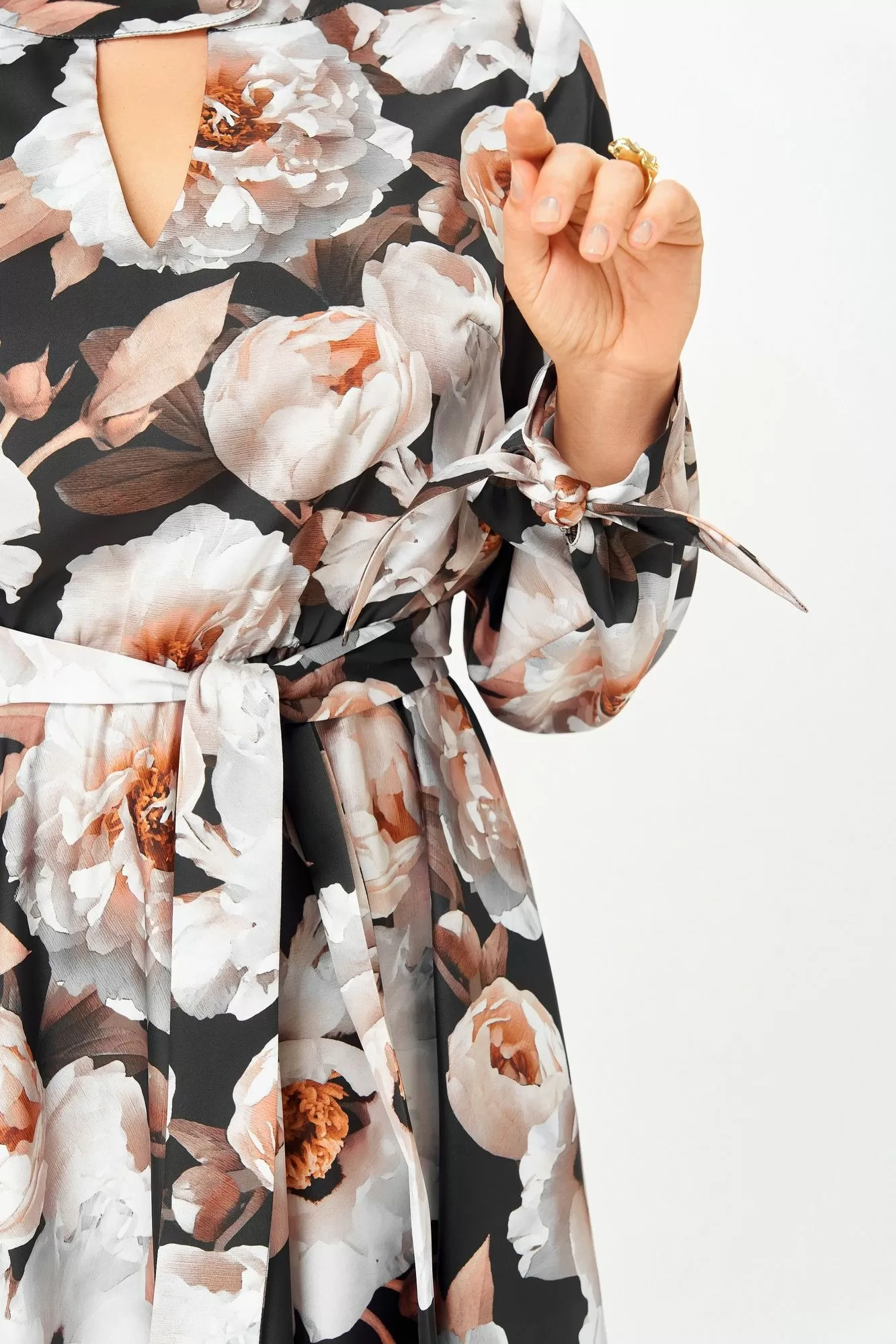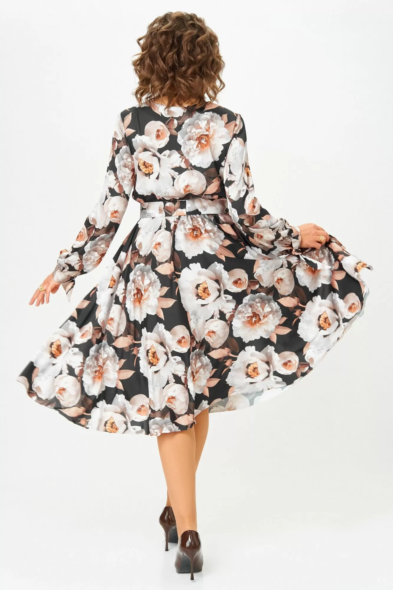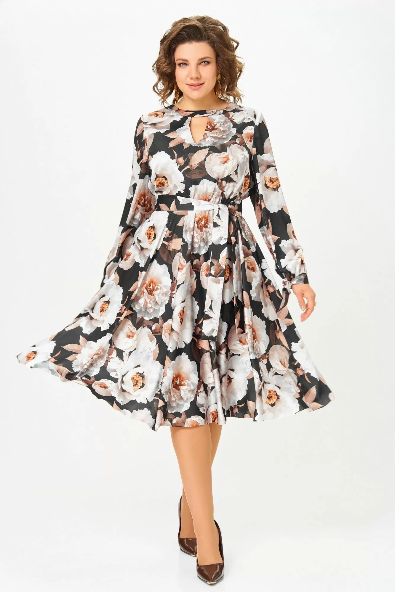 Платье из нежной ткани, имитирующей шёлк, Х-образного силуэта, отрезное по линии талии.