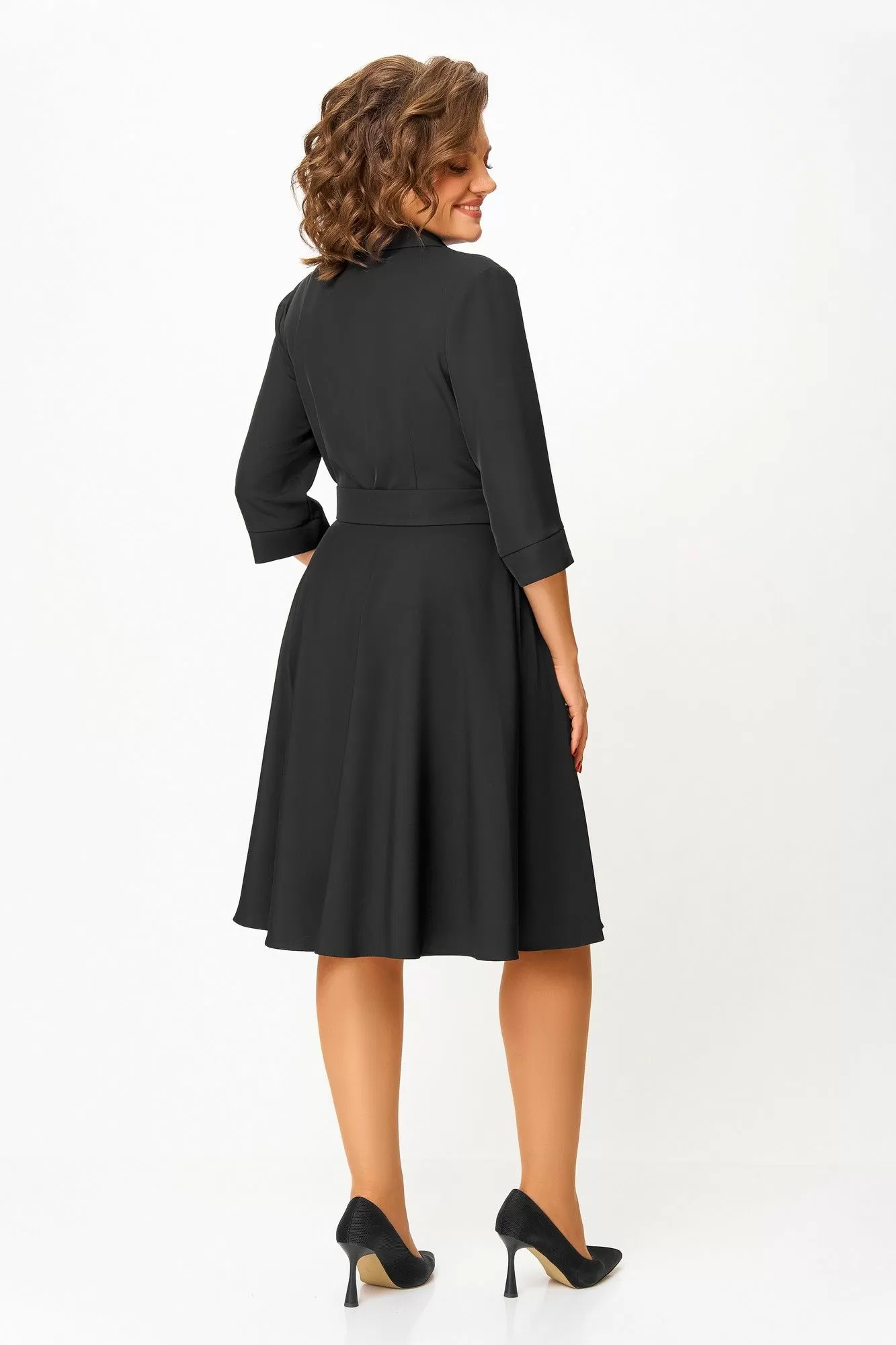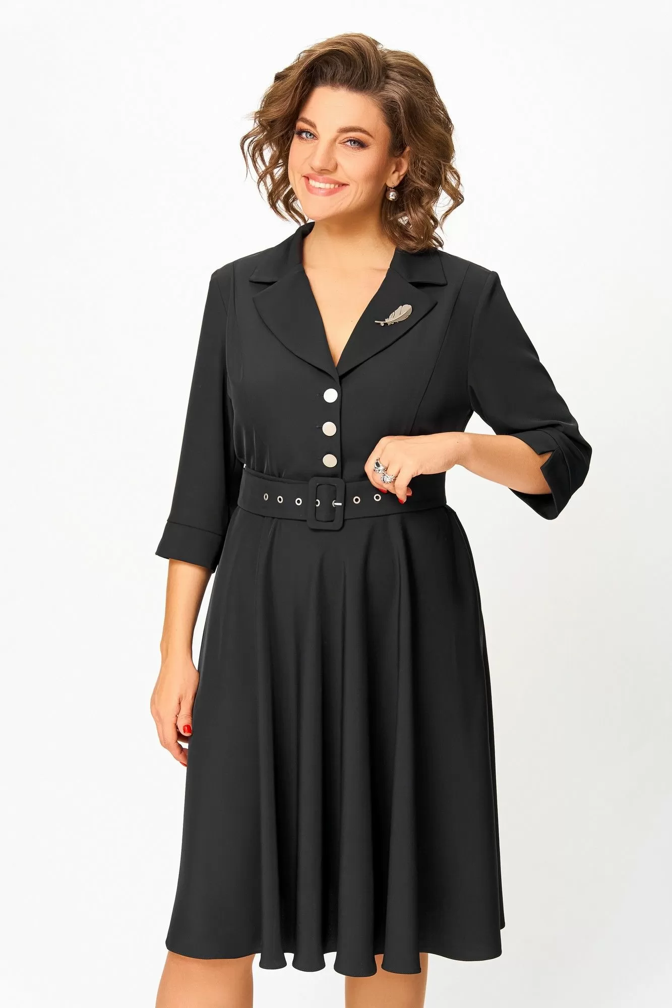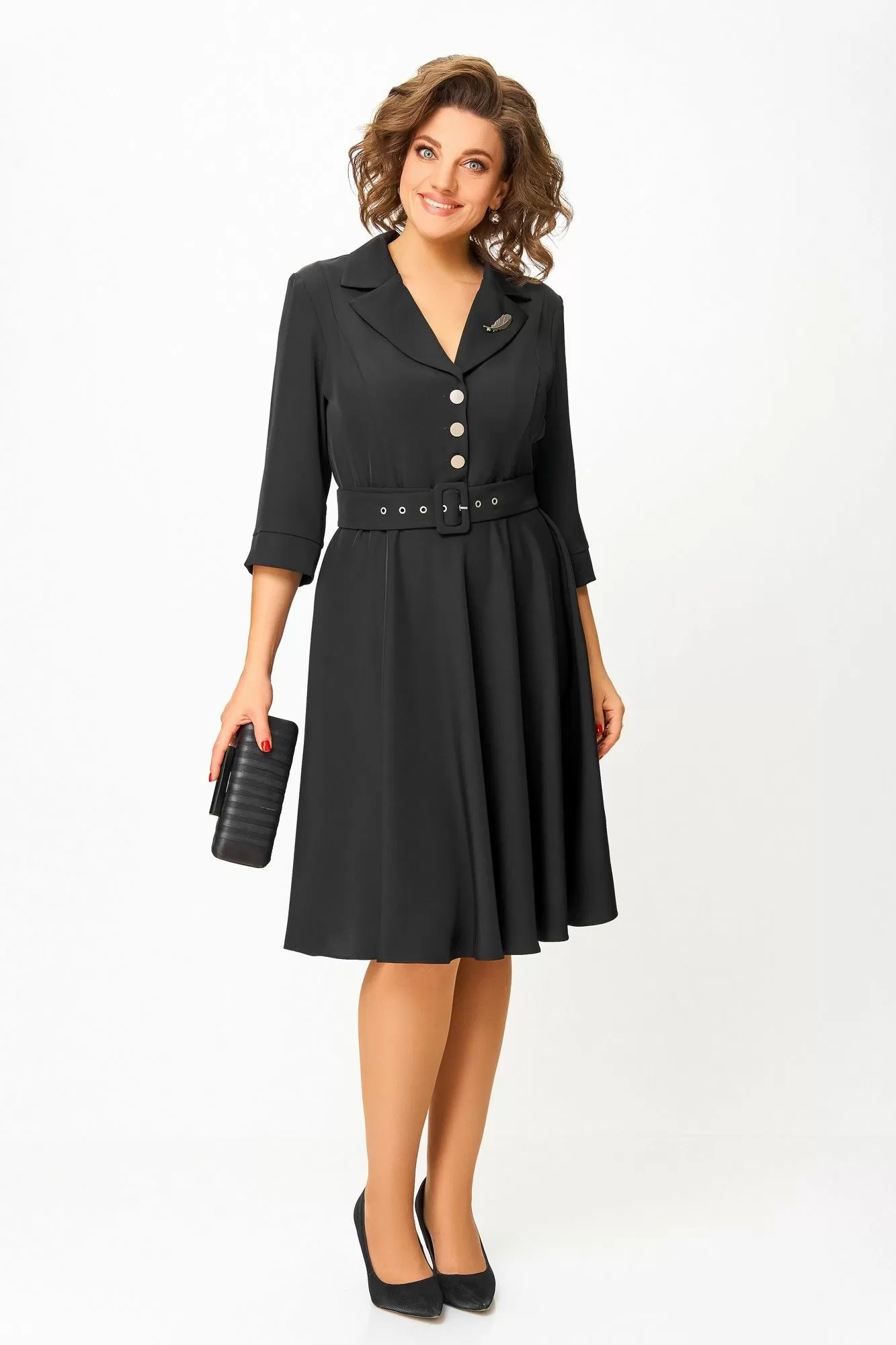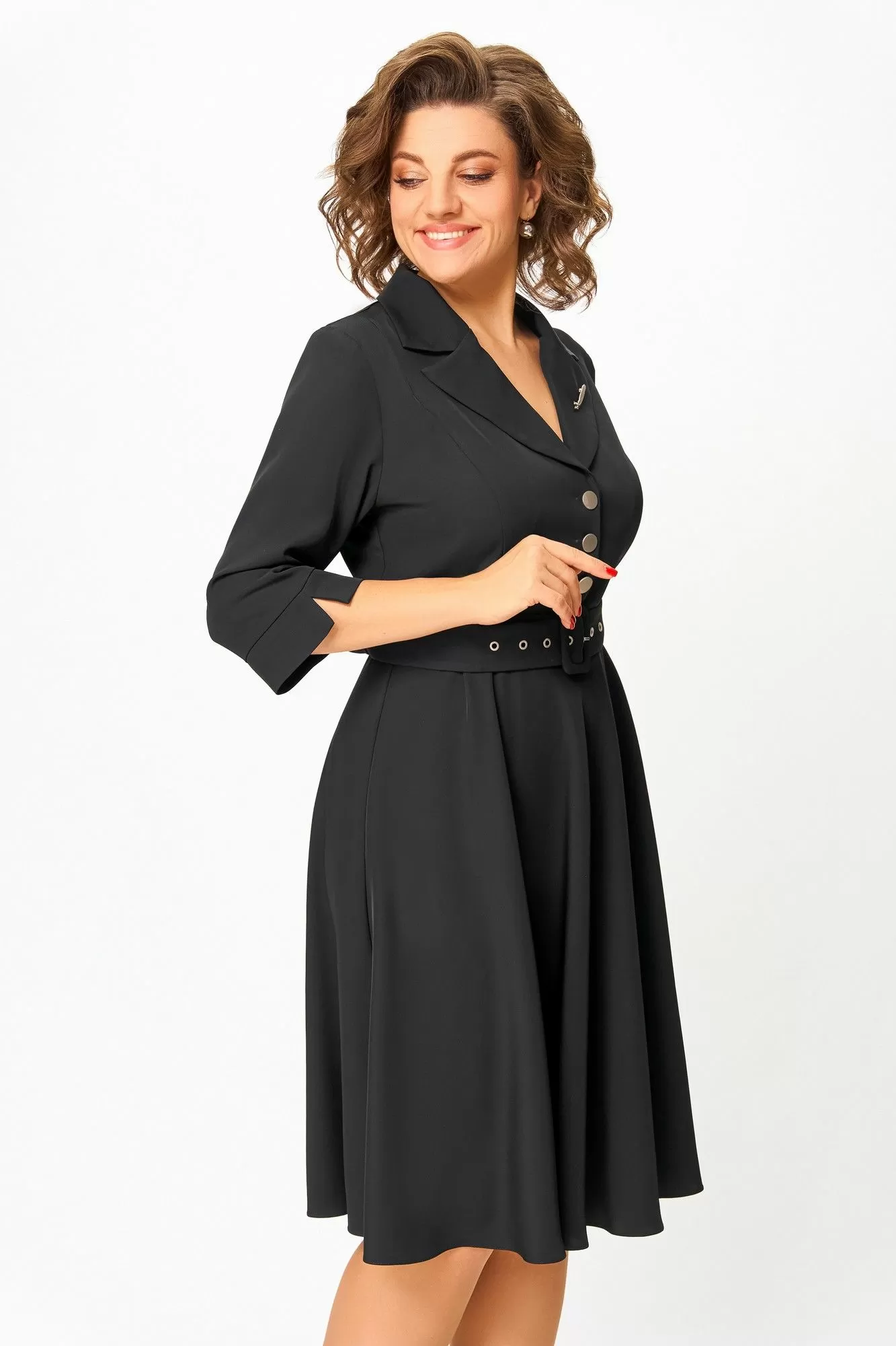Платье из мягкой поливискозной ткани, Х-образного силуэта с полуприлегающим лифом. Платье отрезное по линии талии. Перед лифа с вертикальными рельефами и застёжкой на петли и 4 декоративные пуговицы. Горловина V-образной формы, с отложными лацканами и воротником пиджачного типа. Спинка лифа с талиевыми выточками. Рукав втачной, длиной ¾, по низу манжет с разрезом. Застёжка в боковом шве на потайную тесьму-молнию.