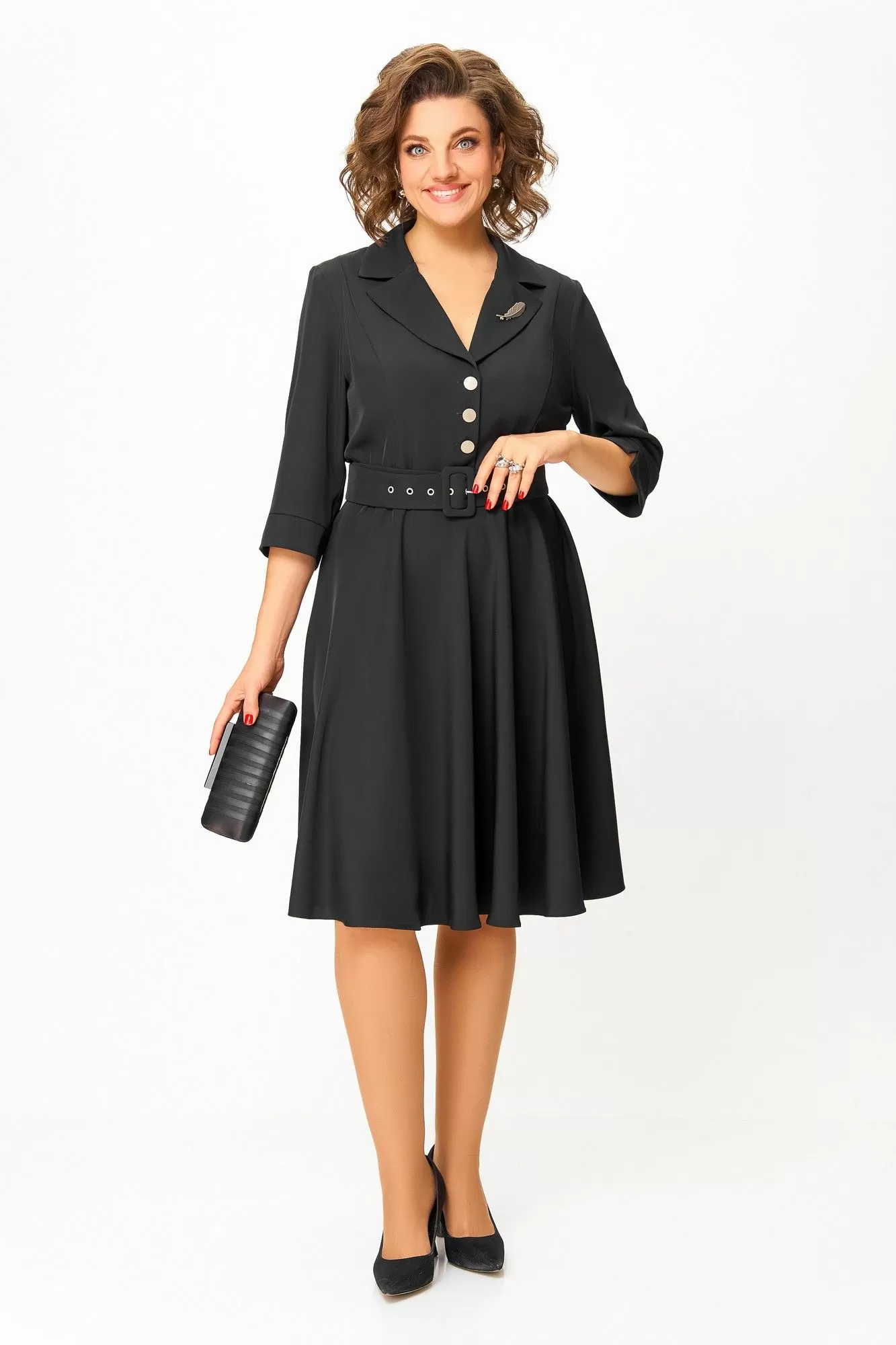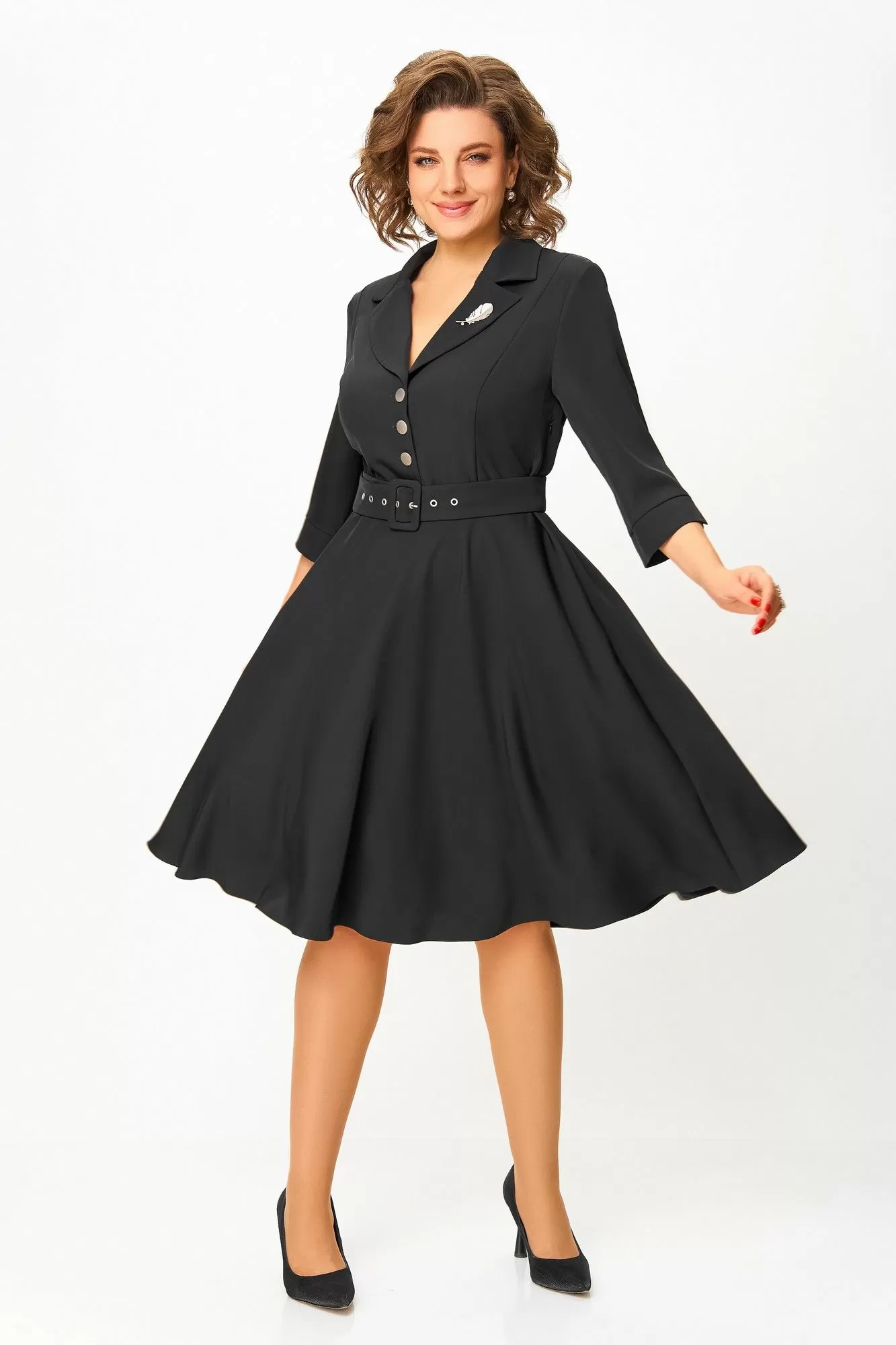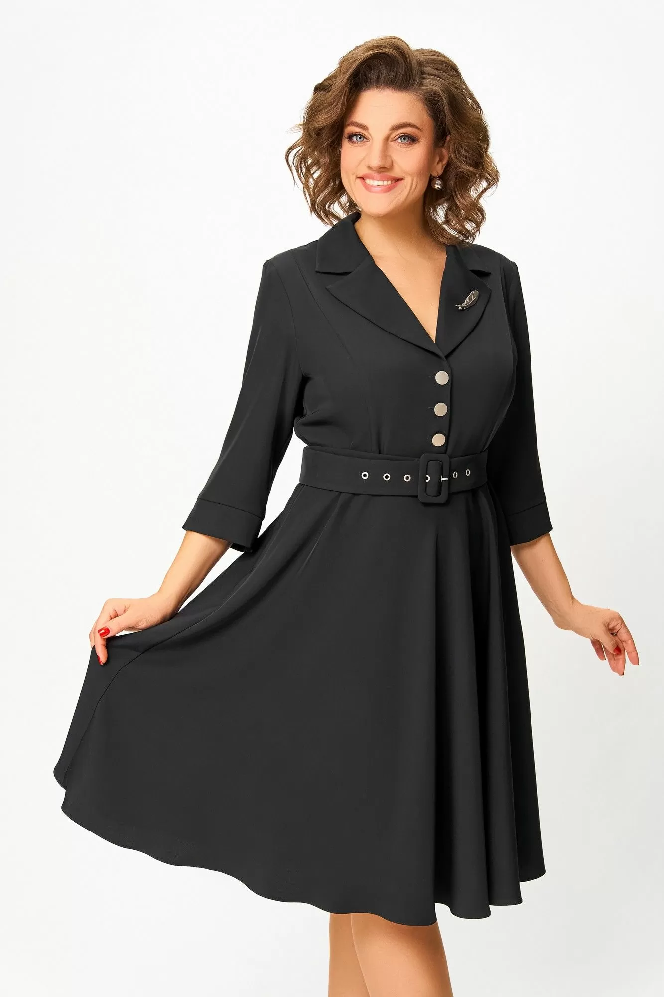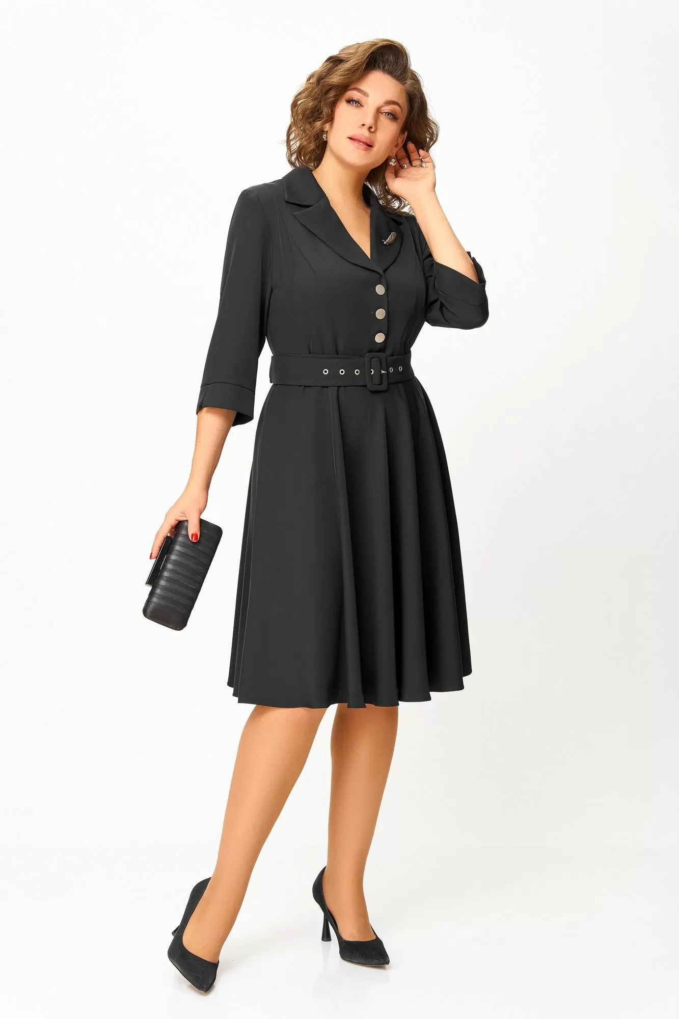 Платье из мягкой поливискозной ткани, Х-образного силуэта с полуприлегающим лифом. Платье отрезное по линии талии. Перед лифа с вертикальными рельефами и застёжкой на петли и 4 декоративные пуговицы. Горловина V-образной формы, с отложными лацканами и воротником пиджачного типа. Спинка лифа с талиевыми выточками. Рукав втачной, длиной ¾, по низу манжет с разрезом. Застёжка в боковом шве на потайную тесьму-молнию.