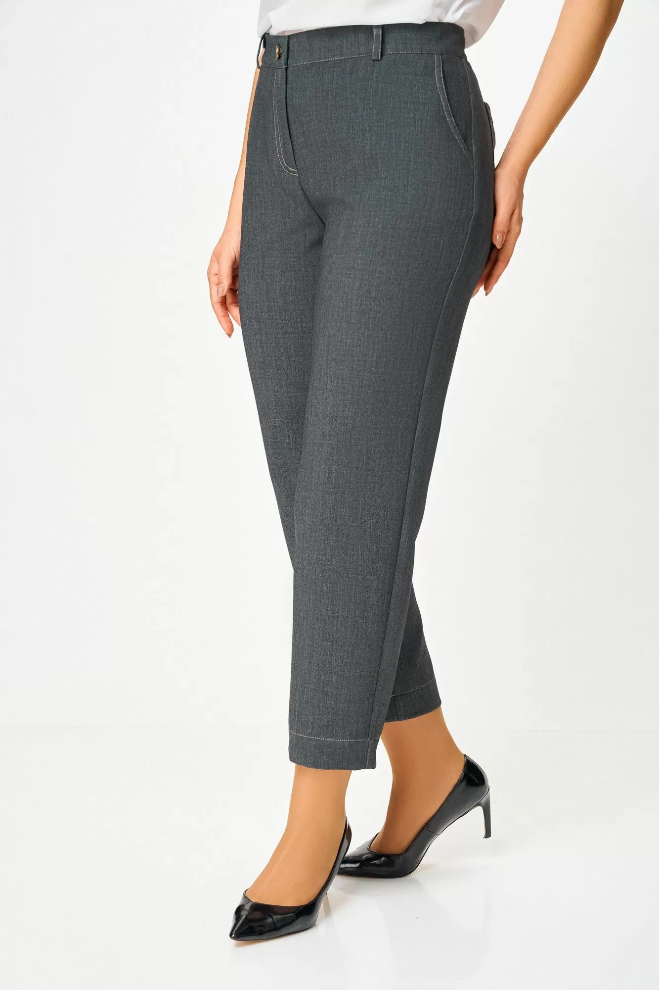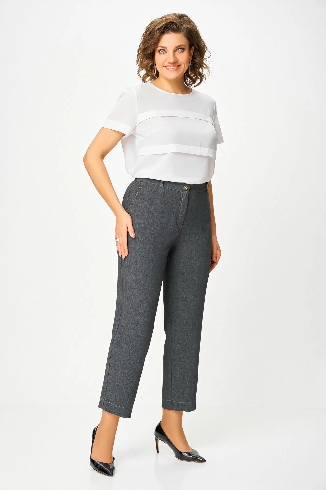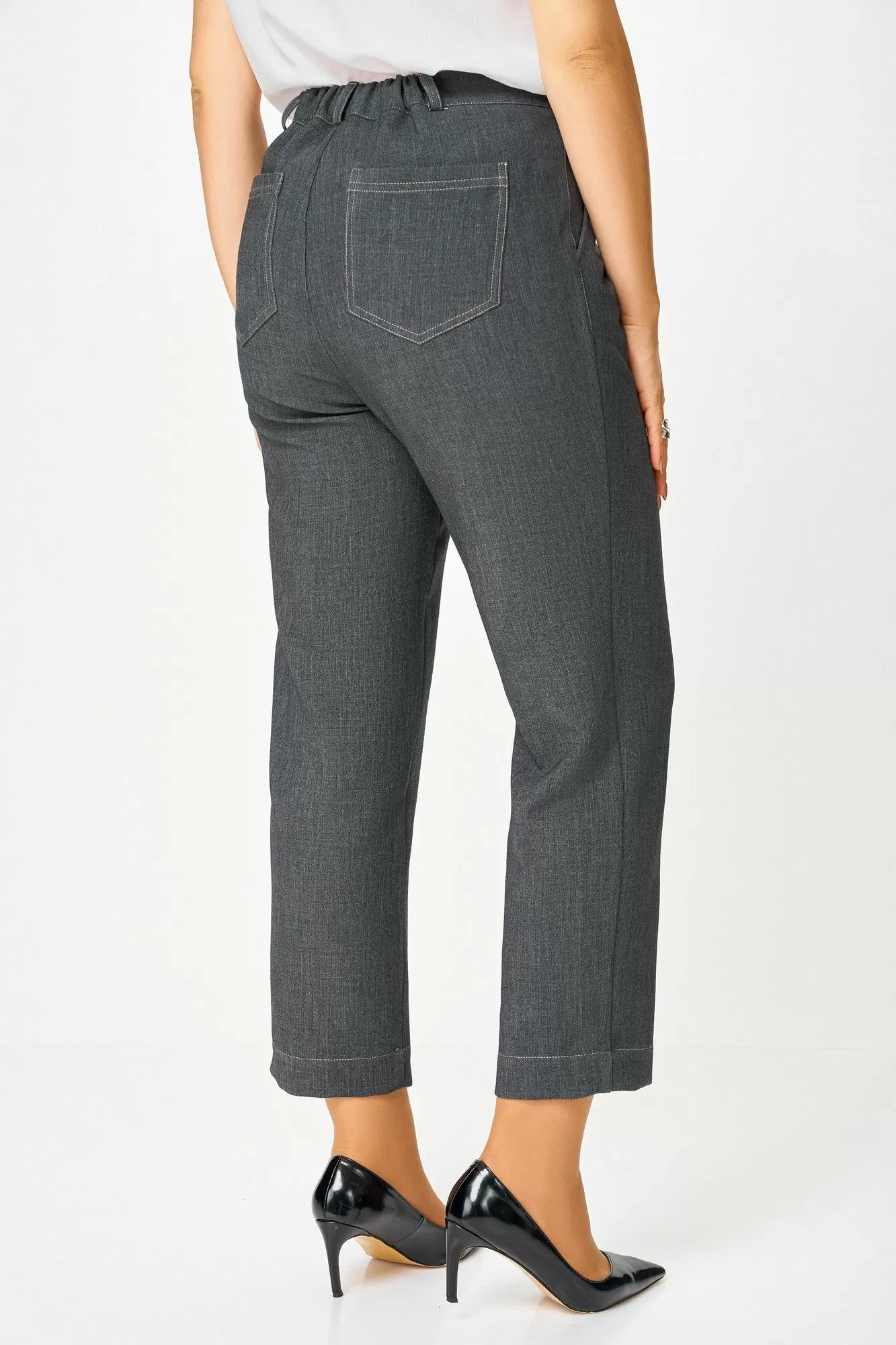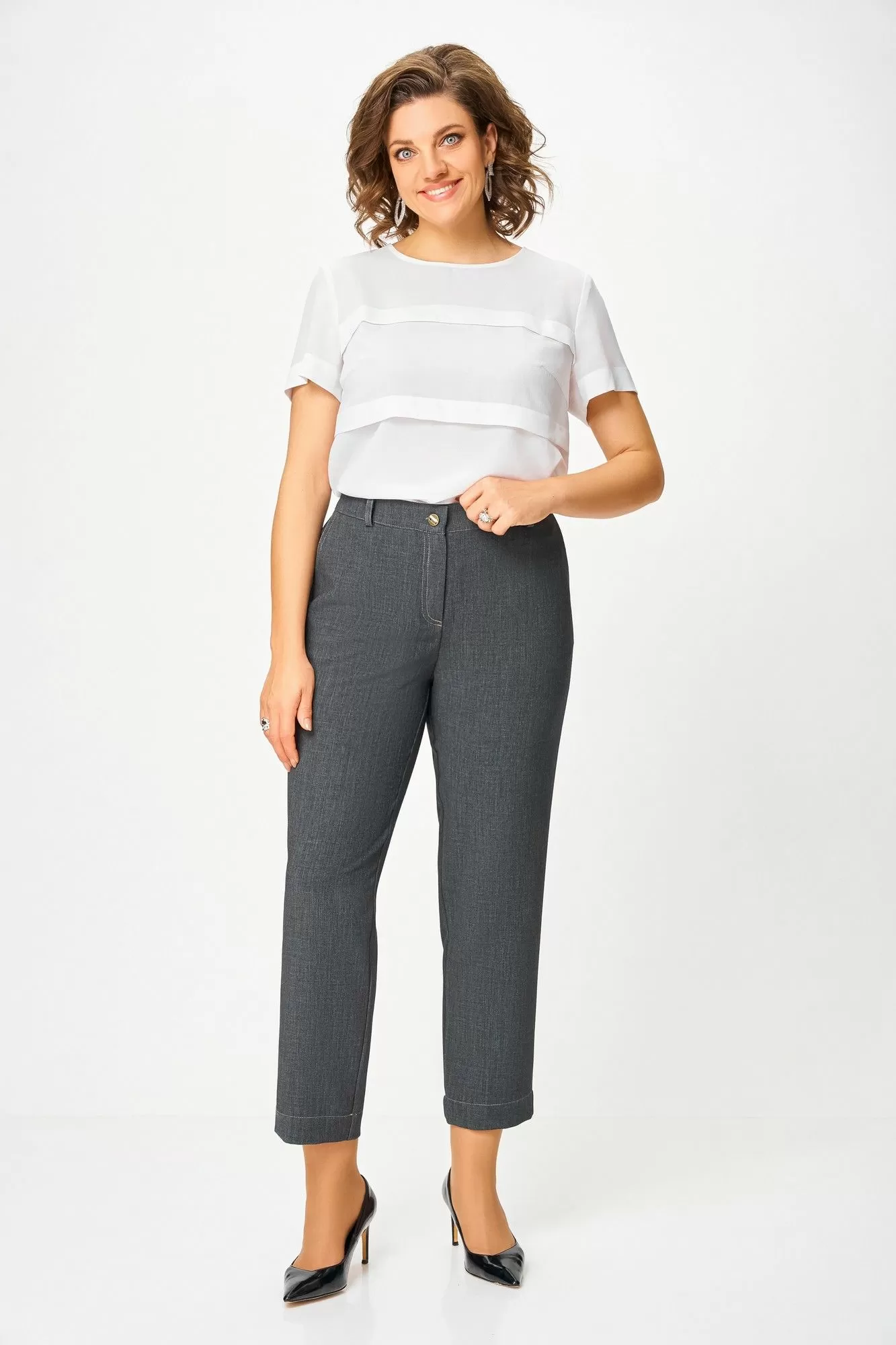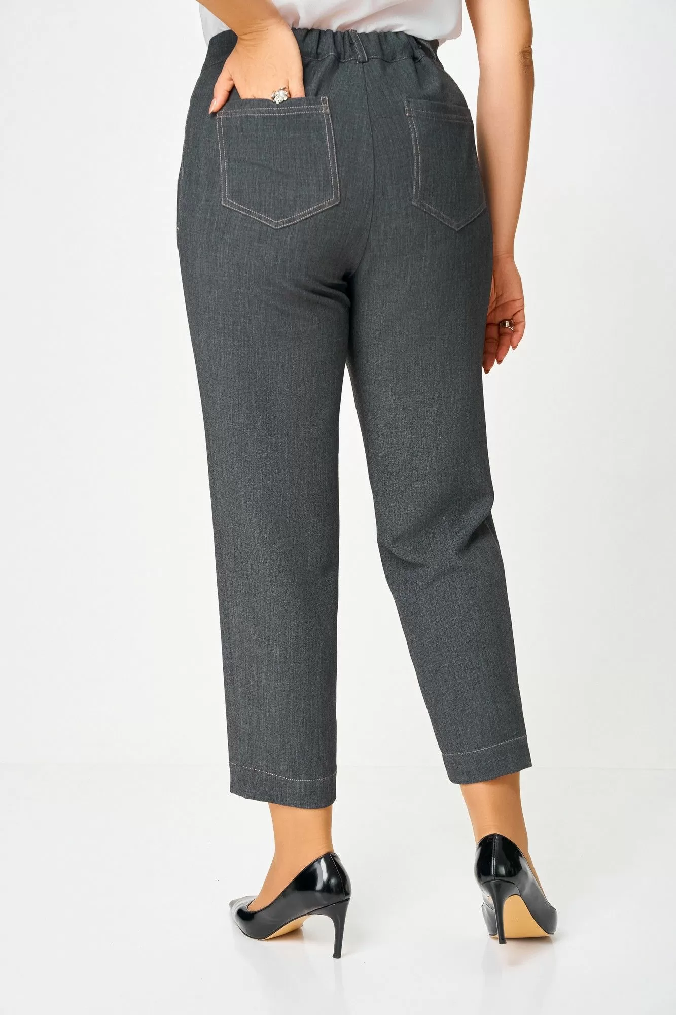 Брюки из мягкой эластичной ткани под джинс, прямого силуэта, заужены к низу. Спереди боковые функциональные карманы, сзади накладные фигурные карманы с двойной контрастной отстрочкой. Пояс притачной с эластичной тесьмой-резинкой по спинке и шлёвками для пояса. Застёжка на тесьму-молнию, петлю и джинсовую пуговицу на поясе.