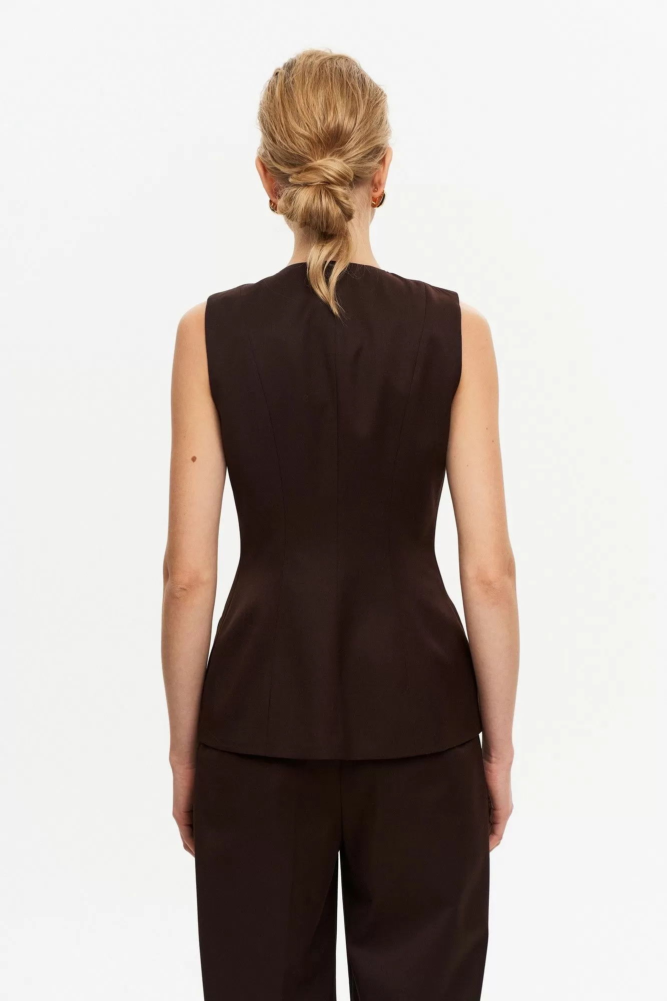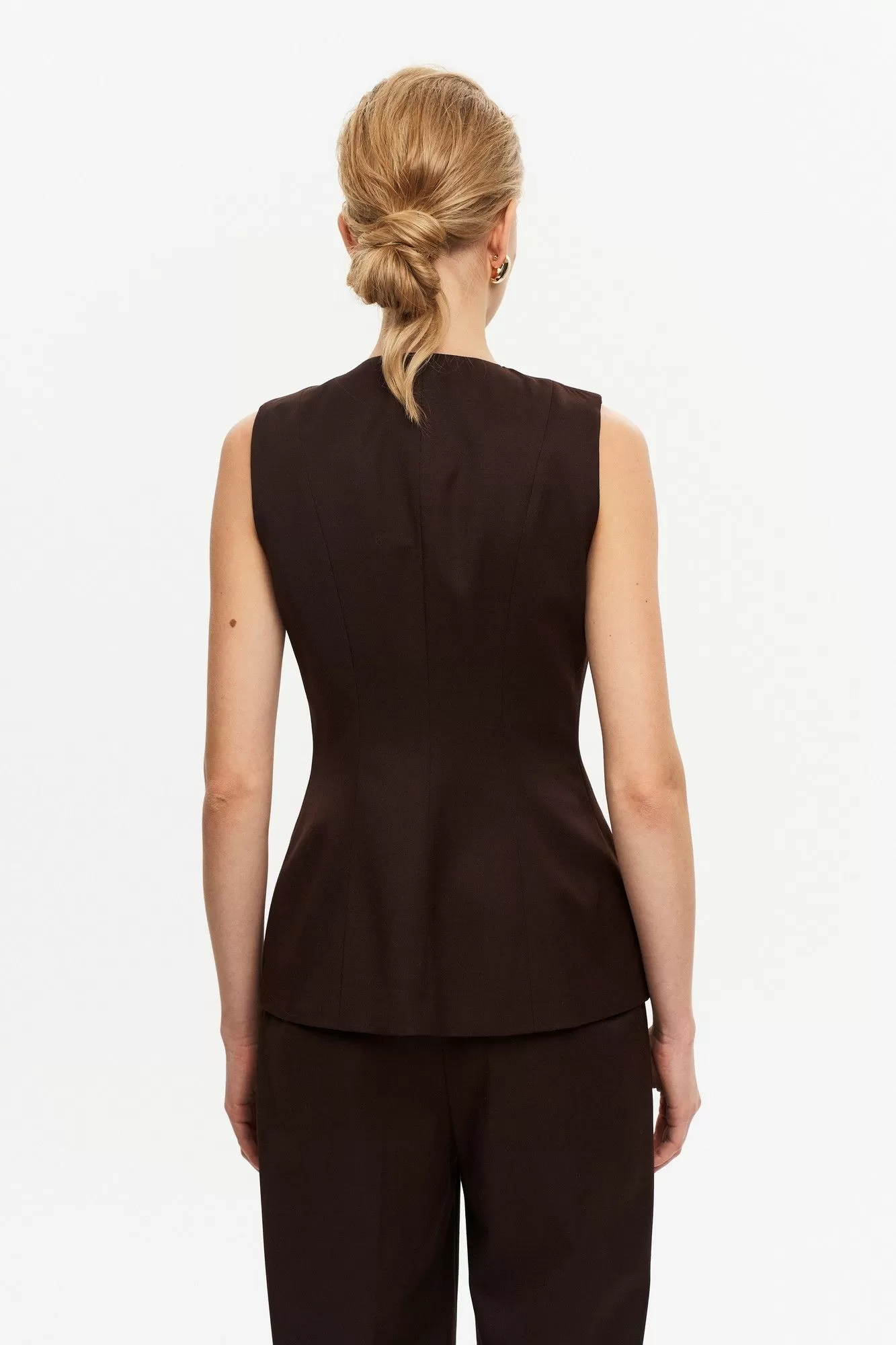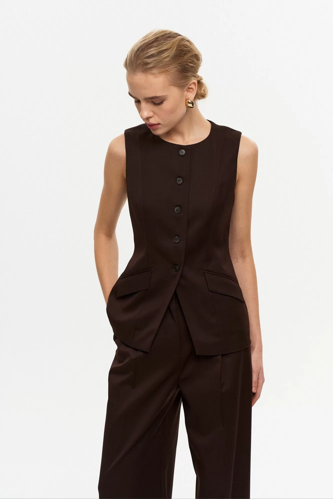 Жилет прилегающего силуэта, однобортный , застегивается на 5 пуговиц. По переду выполнено два прорезных кармана с клапаном и обтачками. Прилегание выполнено за счет вертикальных рельефов из плеча. Форма низа фигурная , изделие на притачной подкладке по низу.
