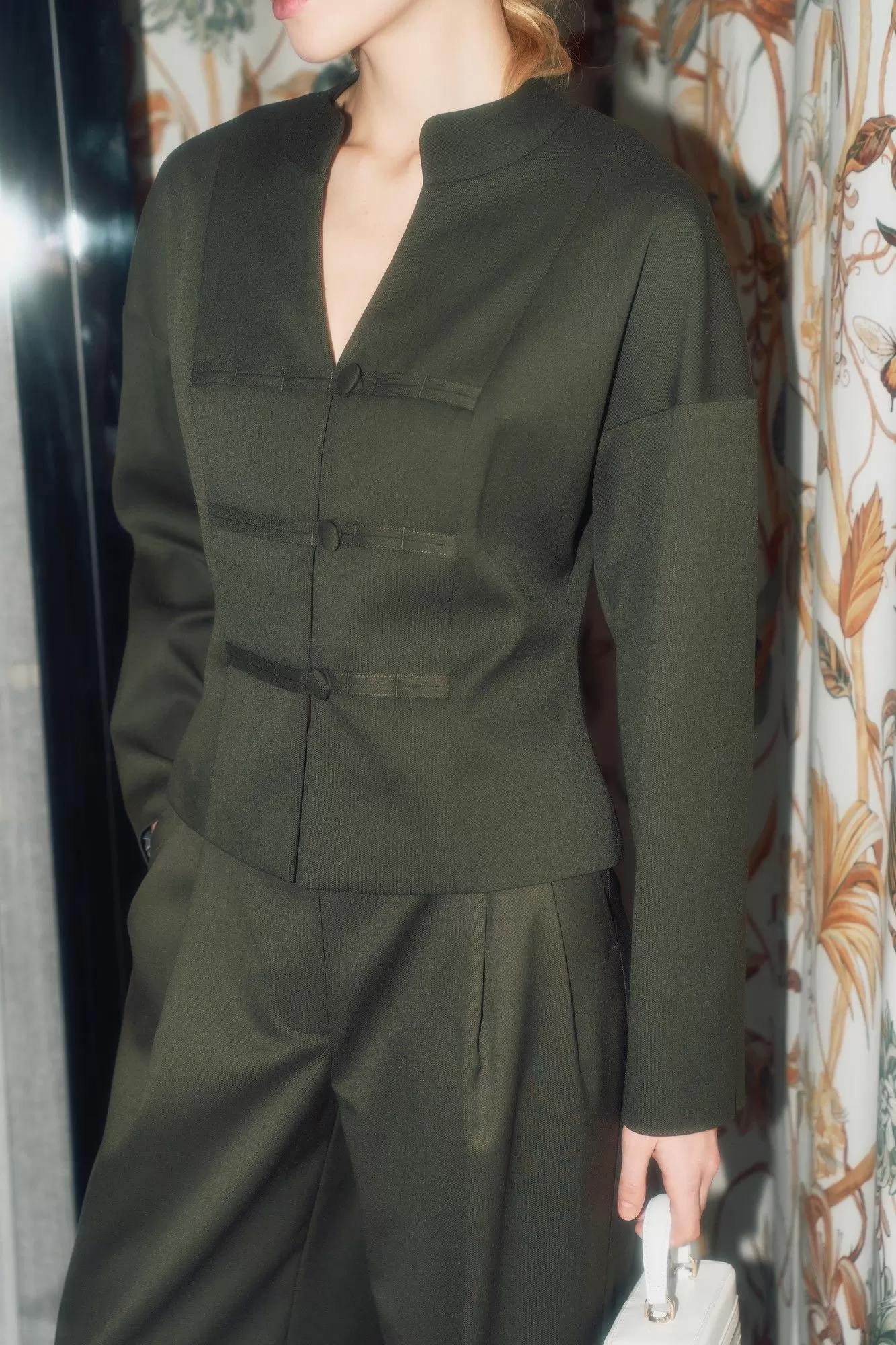 Жакет полуприлегающего силуэта в азиатском стиле. Длина выше линии бедер, изделие на подкладке. По переду от линии плеча до низа изделия вертикальный рельеф. Застежка на навесные петли и три пуговицы. Спинка со средним швом и вертикальными рельефами от плечевого шва до низа изделия. Аккуратная V-образная горловина. Воротник стойка, края воротника закруглены и наклонены по диагонали. Спущенная линия плеча. Рукава рубашечного кроя, без манжет.