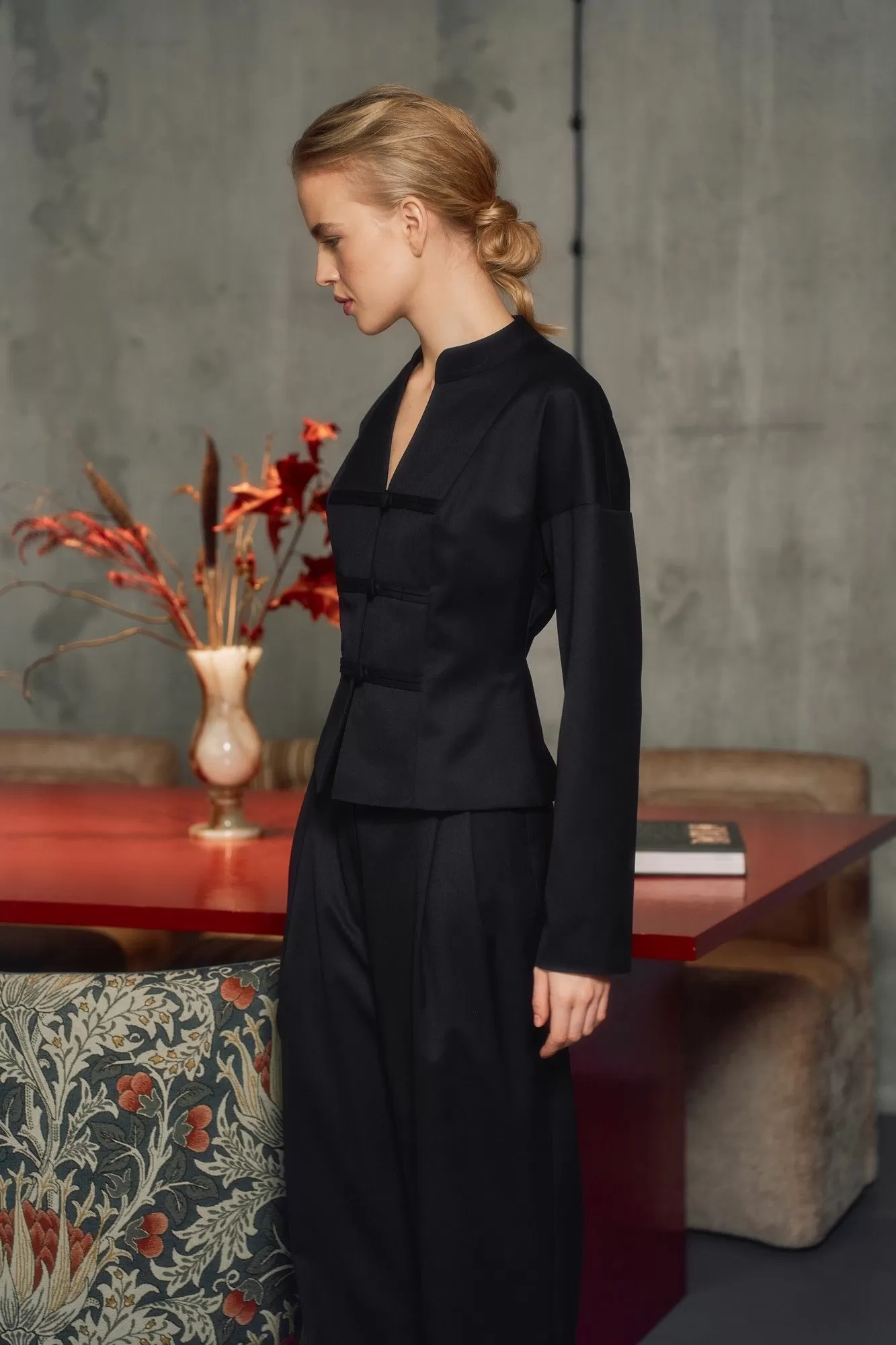 Жакет полуприлегающего силуэта в азиатском стиле. Длина выше линии бедер, изделие на подкладке. По переду от линии плеча до низа изделия вертикальный рельеф. Застежка на навесные петли и три пуговицы. Спинка со средним швом и вертикальными рельефами от плечевого шва до низа изделия. Аккуратная V-образная горловина. Воротник стойка, края воротника закруглены и наклонены по диагонали. Спущенная линия плеча. Рукава рубашечного кроя, без манжет.