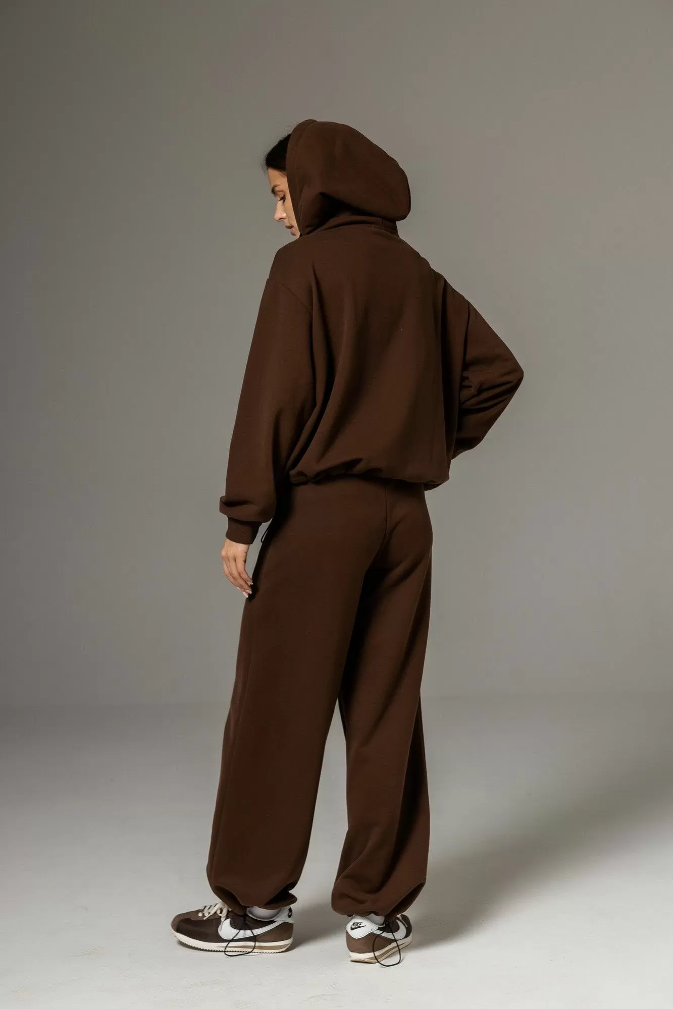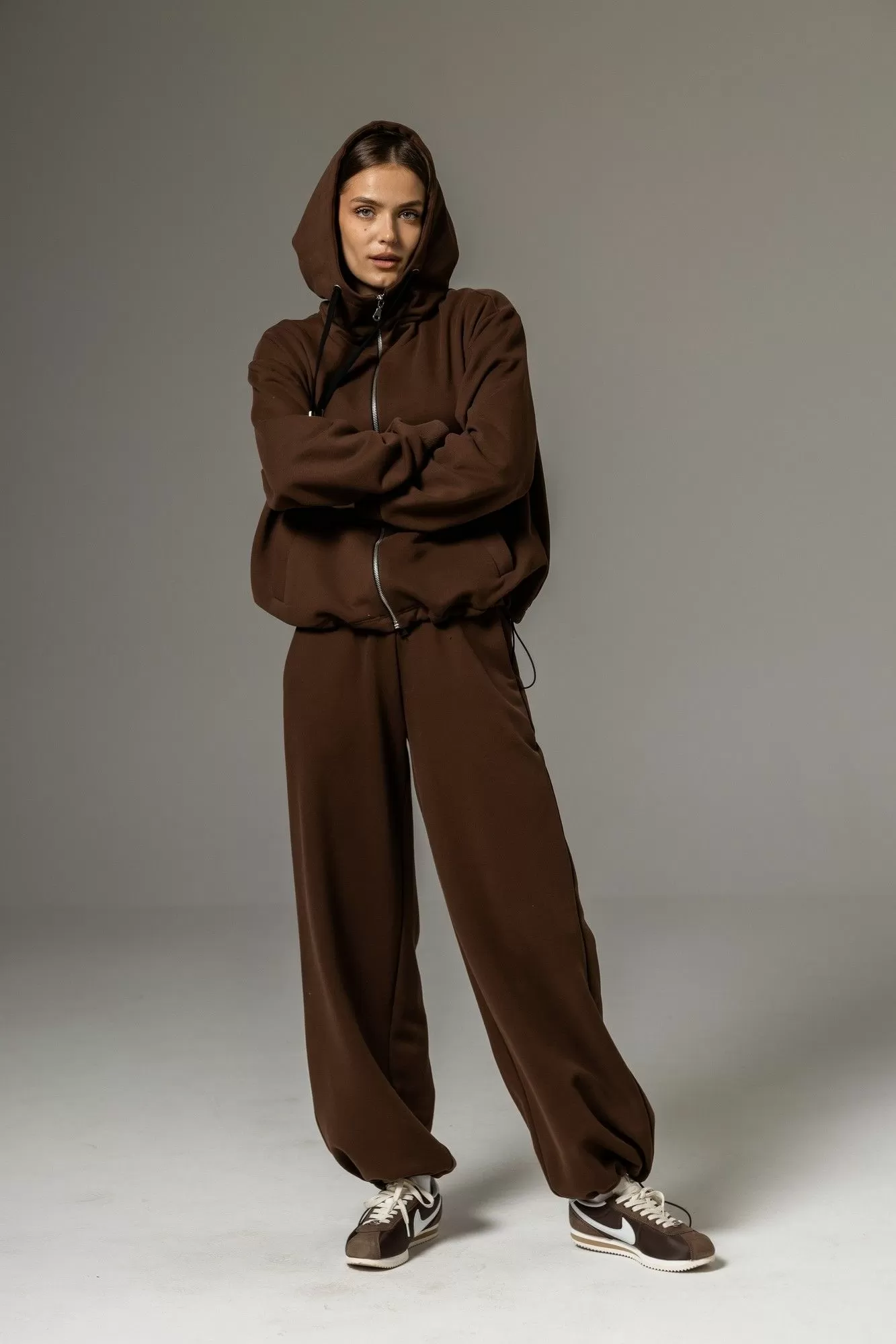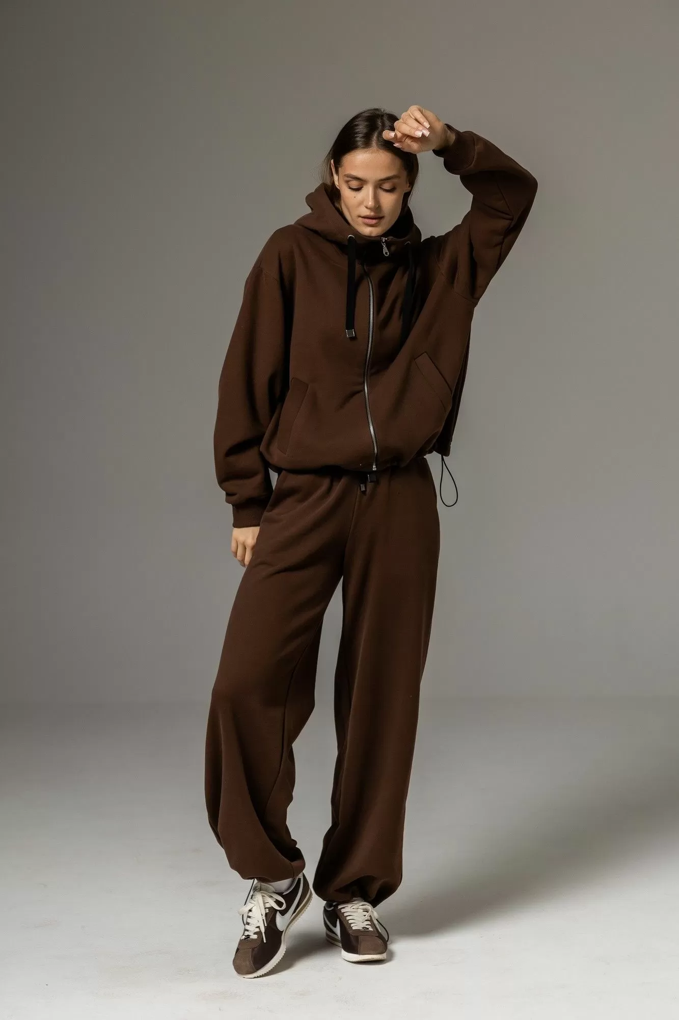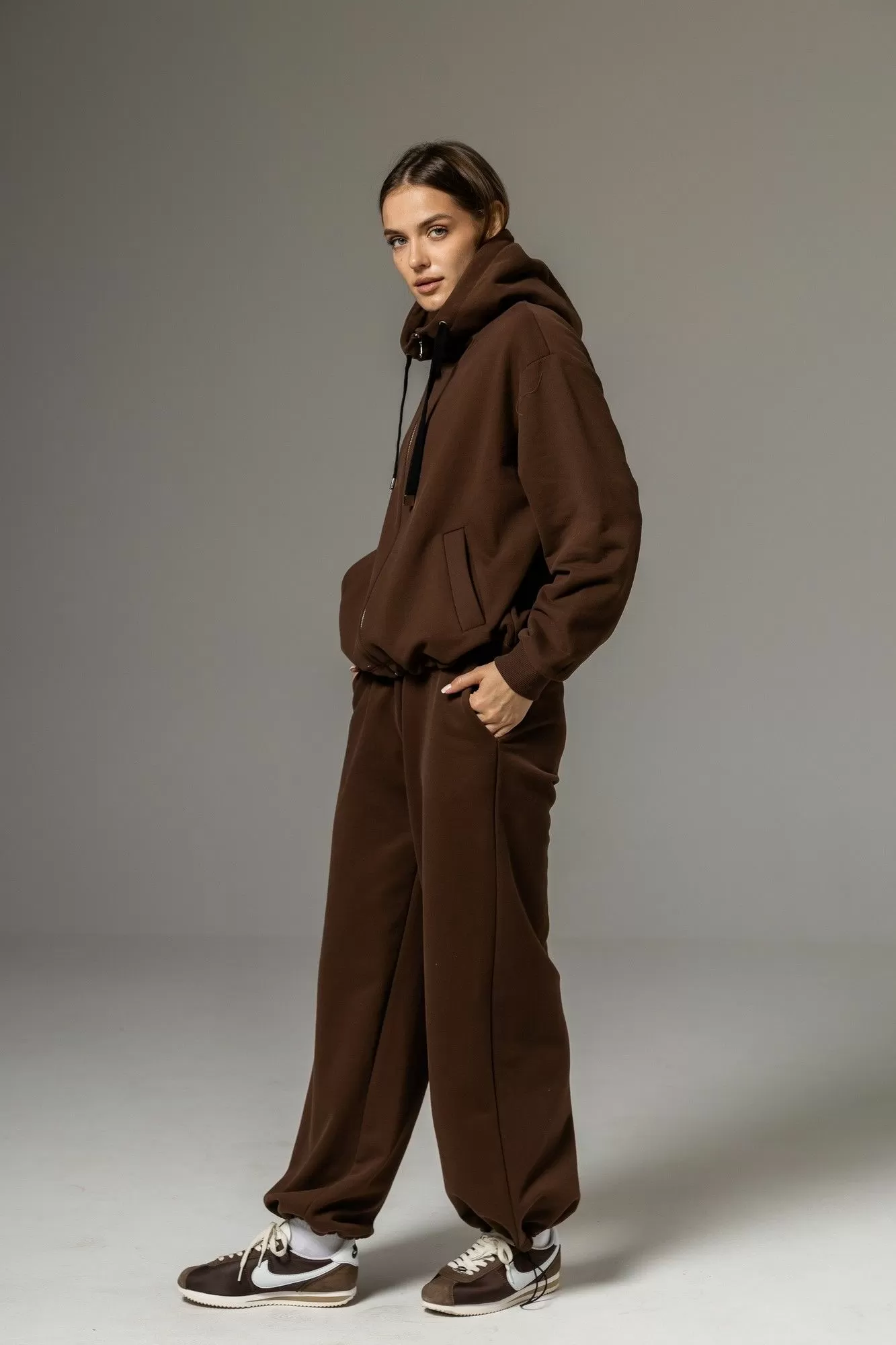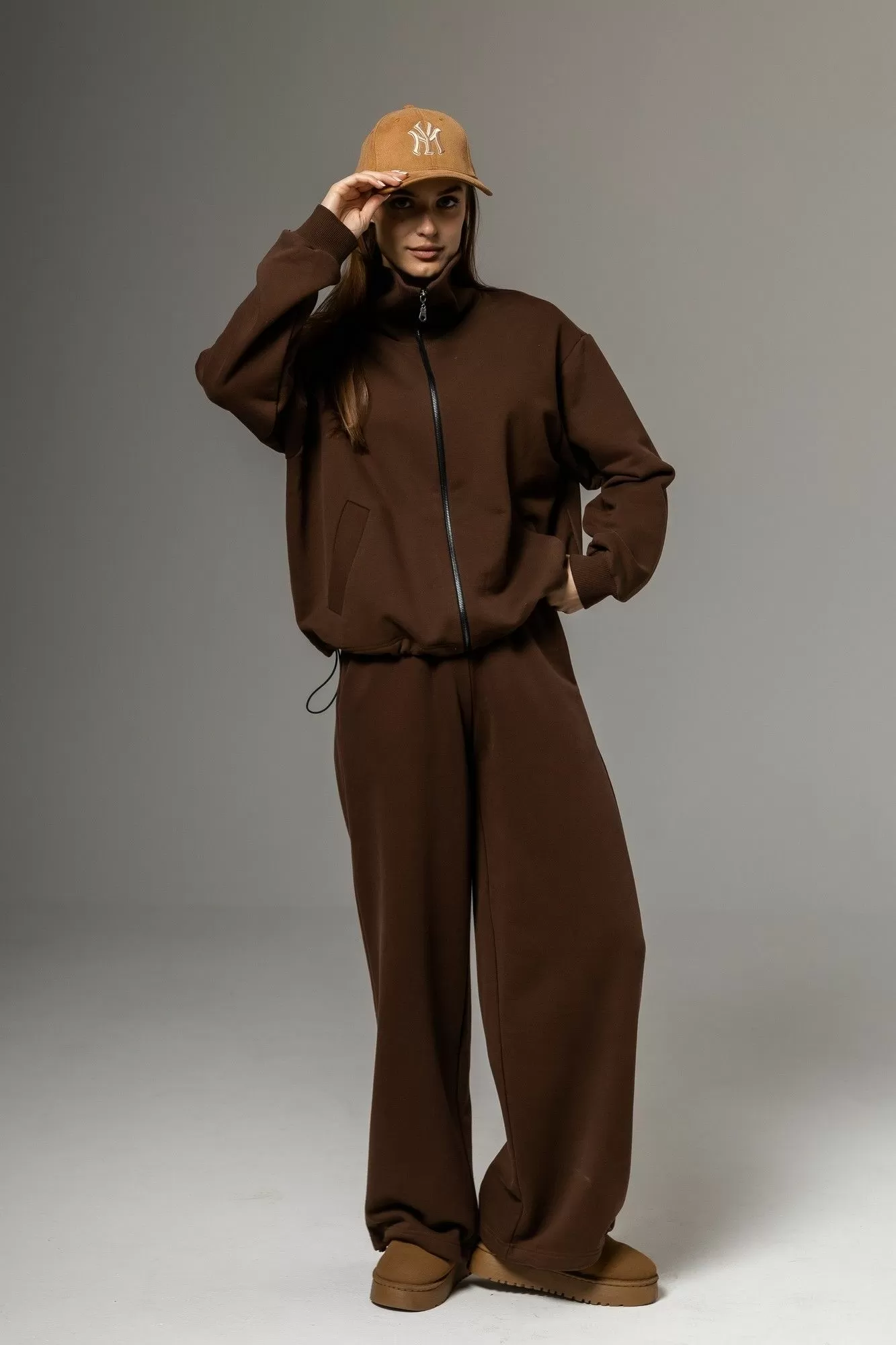 Костюм ( Бомбер с высокой горловиной и капюшоном + брюки палаццо с фиксатором) выполнен из премиального турецкого футера с велюровым напылением, классического шоколадного цвета, который, благодаря велюровому напылению выглядит, как замша.Он отлично держит форму и обладает исключительными теплорегуляторными функциями. Бомбер с капюшоном на металлической молнии, внизу втянута резинка фиксатор, позволяющая затягивать низ бомбера либо оставлять свободно ниспадающим.Прорезные карманы на передней планке с обеих сторон декорированы широкой диагональной листочкой.Длина бомбера от плеча для размера S и М -60 см, для размера L - 66 cм. Длина рукава от горловины 72 см. Брюки палаццо с фиксатором позволяют носить брюки как прямыми, так и затянутыми на резинку-фиксато,особенно хорошо это в дождливую погоду, так как зафиксирорвав брюки, вы не дадите им загрязниться и вымочиться.Хлопковый шнур в поясе позволяет формировать оъем талии по мере необходимости. Абсолютно универсальное изделие для любого гардероба и стиля. Не образуются катышки на лицевой стороне изделия, цвет зделия остается ярким и насыщенным даже после 50 стирок. Уход за изделием: деликатная стирка с жидким моющим средством при температуре 30-40 градусов. При стирке использовать мягкие моющие средства. не применять отбеливающие средства.