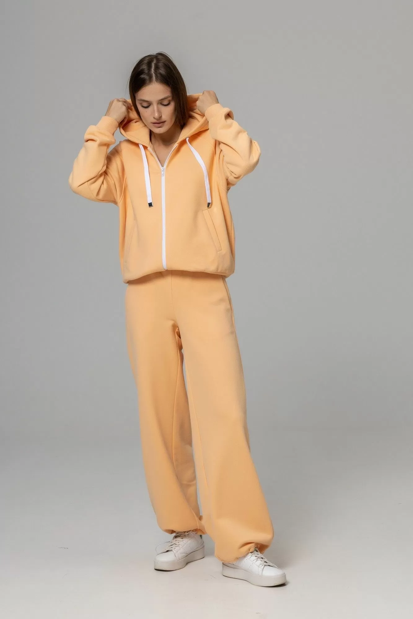 Костюм из футера с велюром( Бомбер + брюки палаццо с фиксатором) выполнен из премиального турецкого футера 3х нитки с велюровым напылением, петля, качество пенье. Невероятная мягкость и пластичность материала -это особенное удовольствие, так как его не хочется снимать. Бомбер с рукавом реглан - уникальный фасон, который одинаково хорошо работает и в случае широких и в случае узких плеч, уравновешивая фигуру.Слегка зауженные манжеты на рукаве. Прорезные карманы на передней планке с обеих сторон. Внизу в брюках палаццо есть резинка-фиксатор, поэтому можно носить брюки прямыми либо затянутыми на резинку( особенно хорошо это в дождливую погоду, так как зафиксирорвав брюки, вы не дадите им загрязниться и вымочиться.Хлопковый шнур в поясе позволяет формировать оъем талии по мере необходимости. Абсолютно универсальное изделие для любого гардероба и стиля. Не образуются катышки на лицевой стороне изделия, цвет зделия остается ярким и насыщенным даже после 50 стирок. Уход за изделием: деликатная стирка с жидким моющим средством при температуре 30-40 градусов. При стирке использовать мягкие моющие средства. не применять отбеливающие средства.