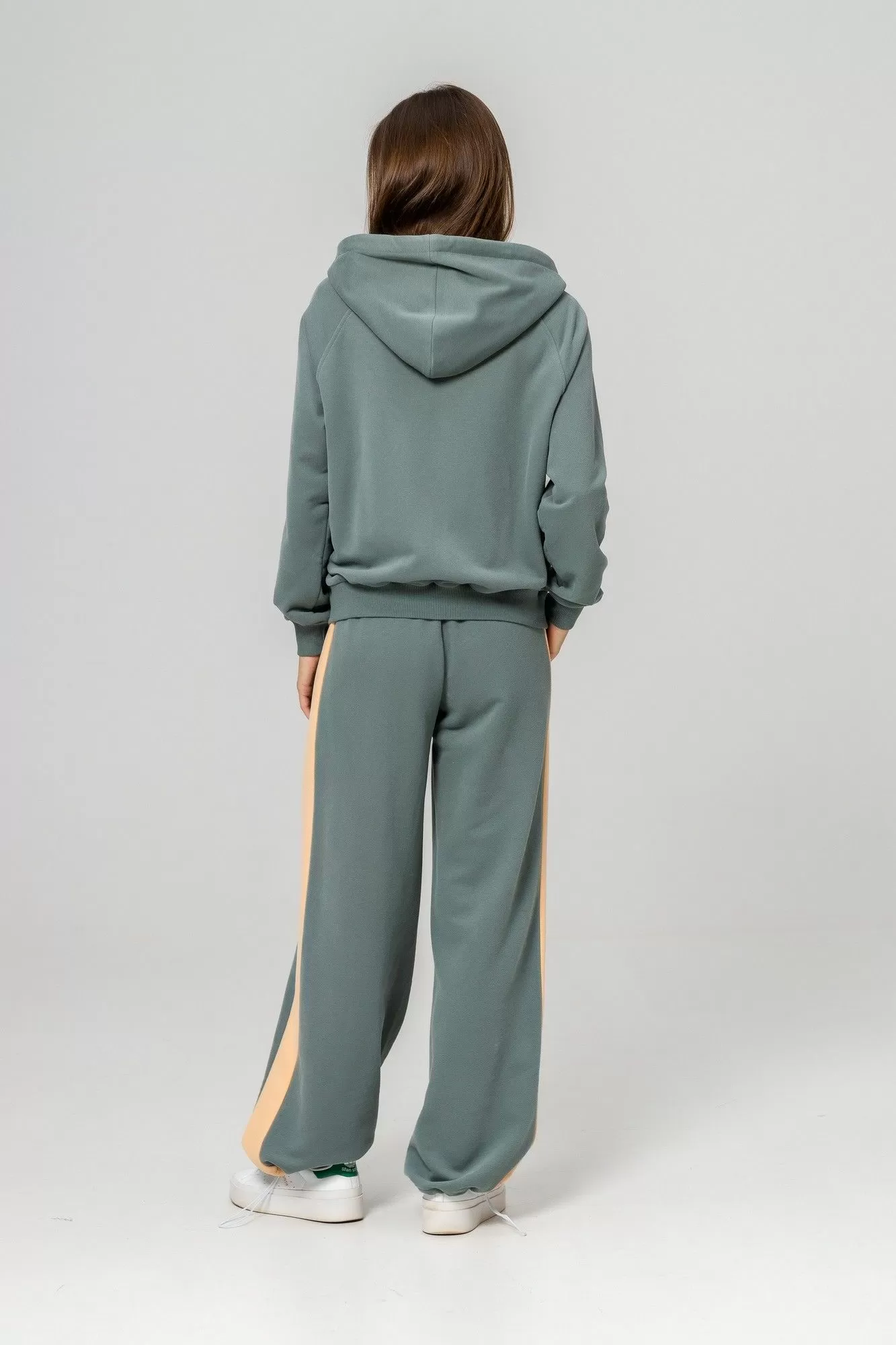 Костюм из футера с велюром( Бомбер с капюшоном + брюки палаццо с фиксатором) выполнен из премиального турецкого футера 3х нитки с велюровым напылением, петля, качество пенье. Невероятная мягкость и пластичность материала -это особенное удовольствие, так как его не хочется снимать. Бомбер на тракторной молнии с рукавом реглан - уникальный фасон, который одинаково хорошо работает и в случае широких и в случае узких плеч, уравновешивая фигуру.Слегка зауженные манжеты на рукаве. Прорезные карманы на передней планке с обеих сторон.Глубокий капюшон красиво окаймляет лицо, не натягиваясь и не заставляя сжимать голову в плечи, в свободном ношении красиво ниспадает сзади. Длина изделия у размера S и М 62 см, у размера L- 68 см. Брюки палаццо с лампасами в контрастном цвете визуально удлиняют ноги и делают образ стильным. . Внизу в брюкх есть резинка-фиксатор, поэтому можно носить брюки прямыми либо затянутыми на резинку( особенно хорошо это в дождливую погоду, так как зафиксирорвав брюки, вы не дадите им загрязниться и вымочиться.Хлопковый шнур в поясе позволяет формировать оъем талии по мере необходимости. Абсолютно универсальное изделие для любого гардероба и стиля. Не образуются катышки на лицевой стороне изделия, цвет зделия остается ярким и насыщенным даже после 50 стирок. Уход за изделием: деликатная стирка с жидким моющим средством при температуре 30-40 градусов. При стирке использовать мягкие моющие средства. не применять отбеливающие средства.