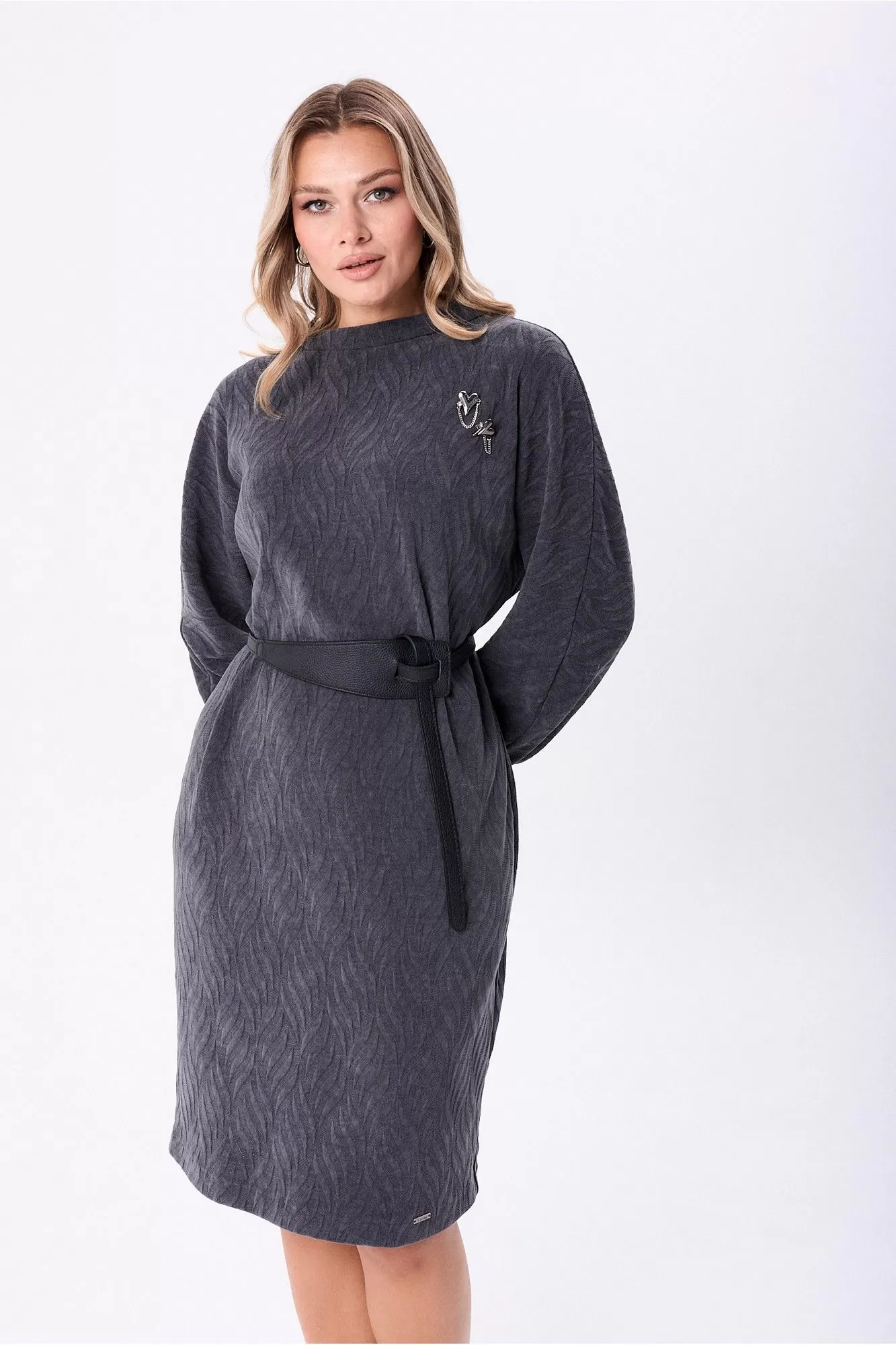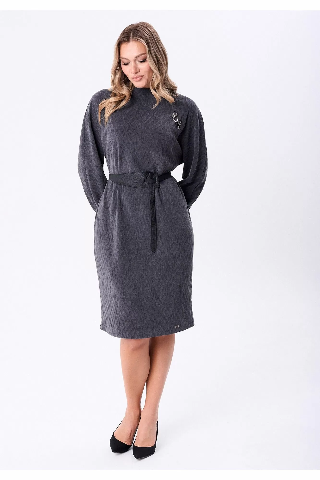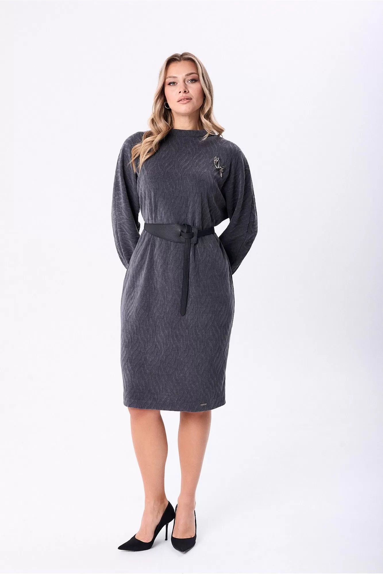 Трикотажное платье свободного силуэта с рукавом летучая мышь. Рукав со складками на манжете, воротник стойка. Молния в среднем шве спинки. Платье без подкладки, в комплекте пояс из экокожи.