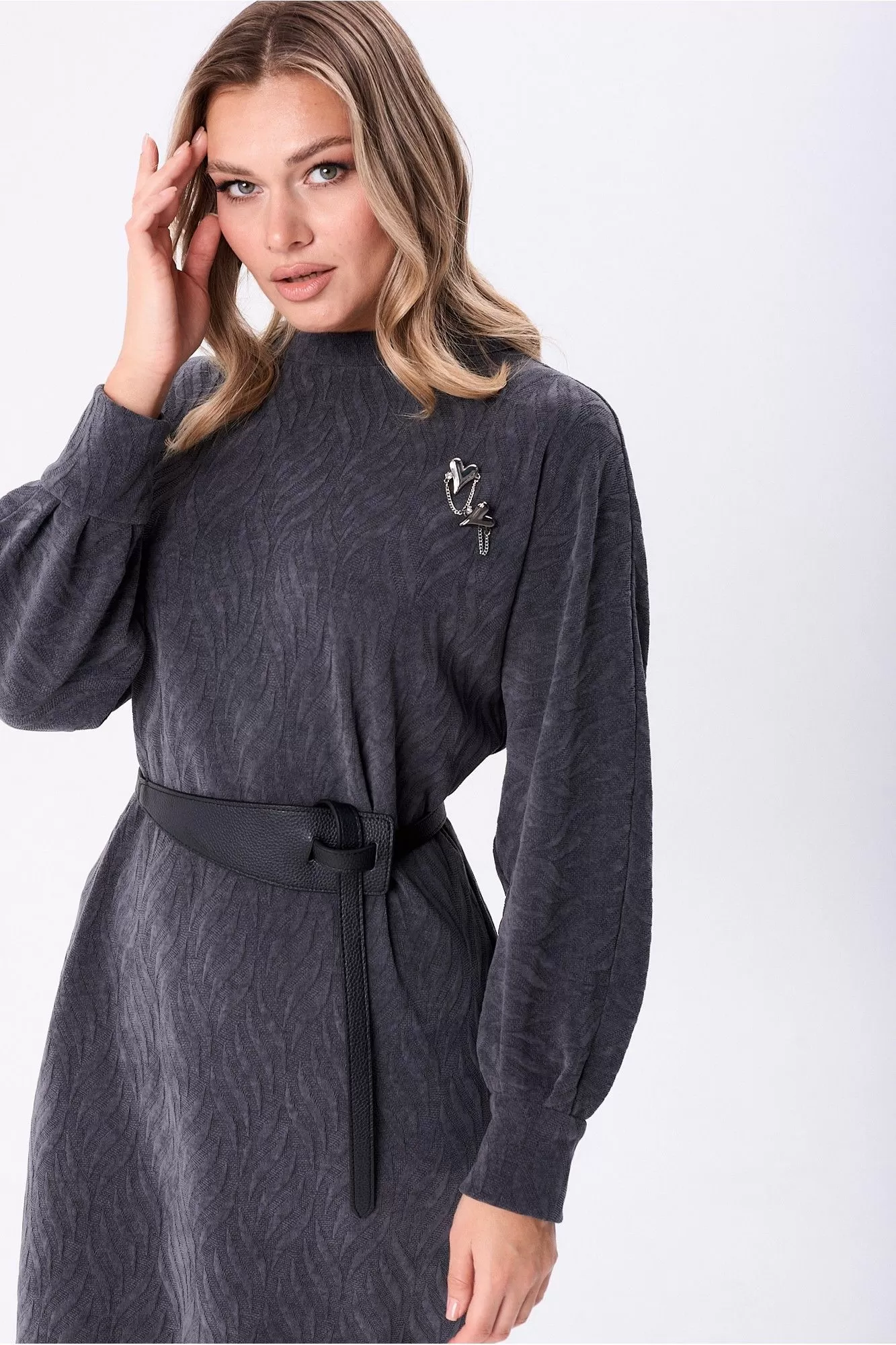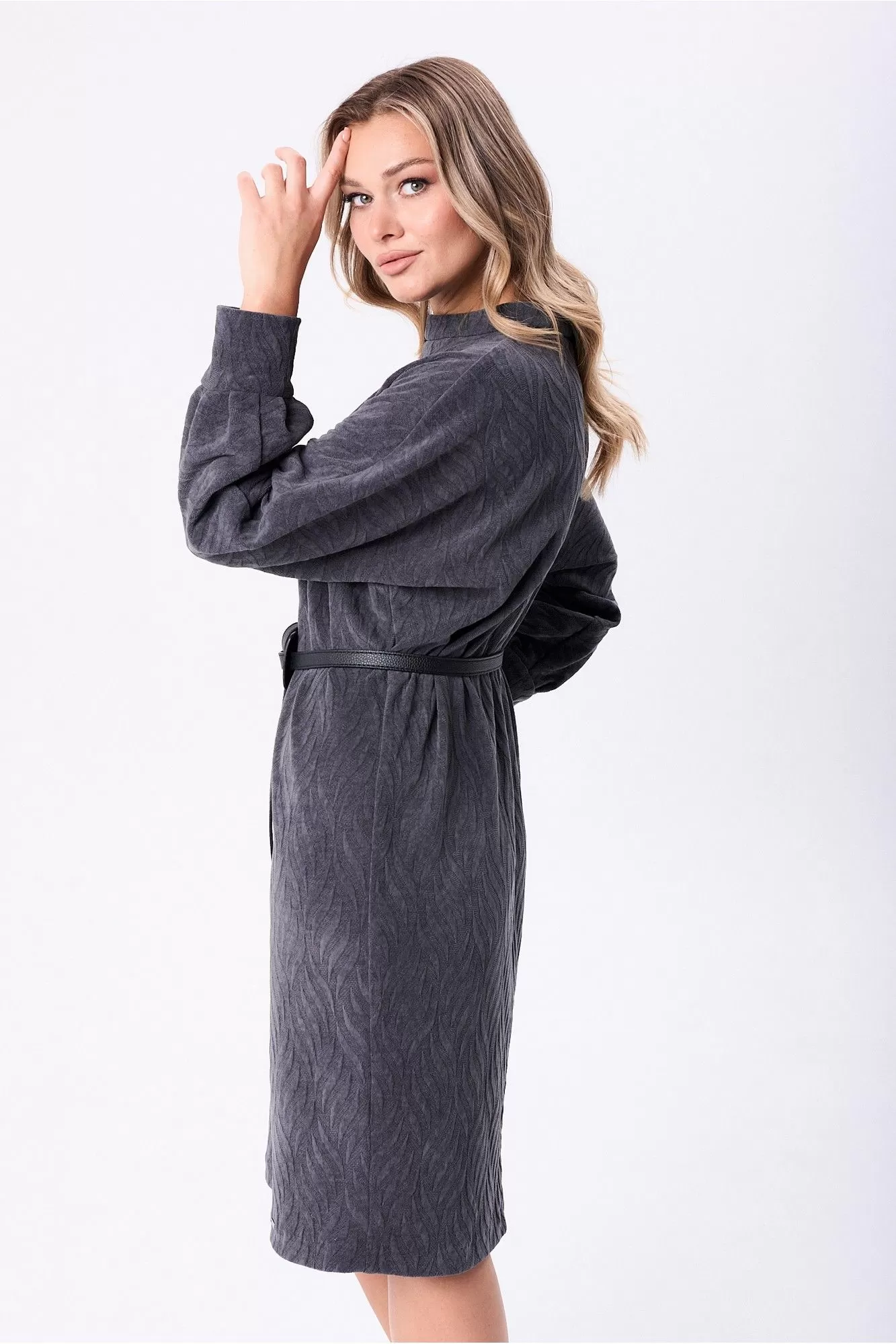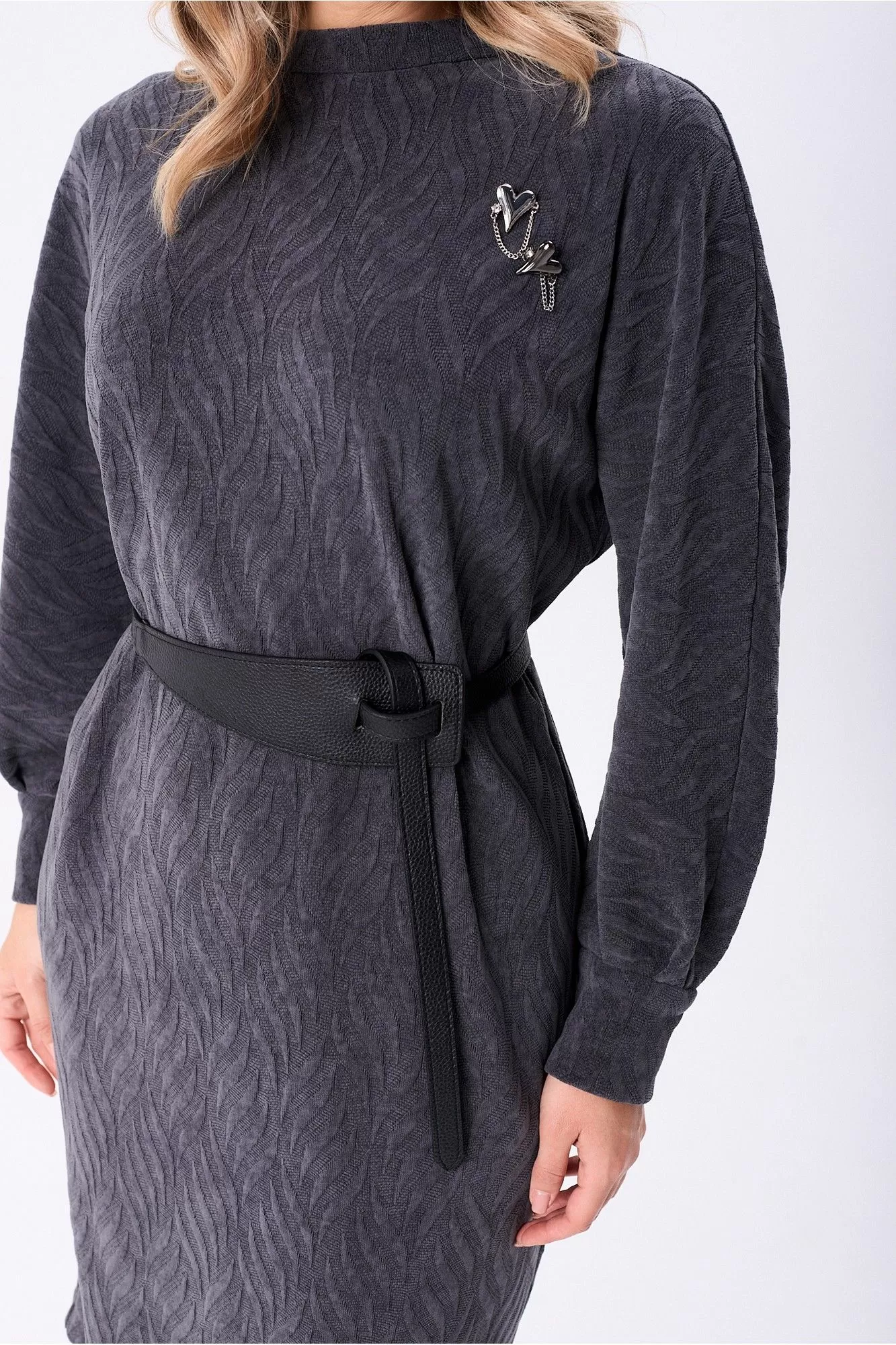 Трикотажное платье свободного силуэта с рукавом летучая мышь. Рукав со складками на манжете, воротник стойка. Молния в среднем шве спинки. Платье без подкладки, в комплекте пояс из экокожи.