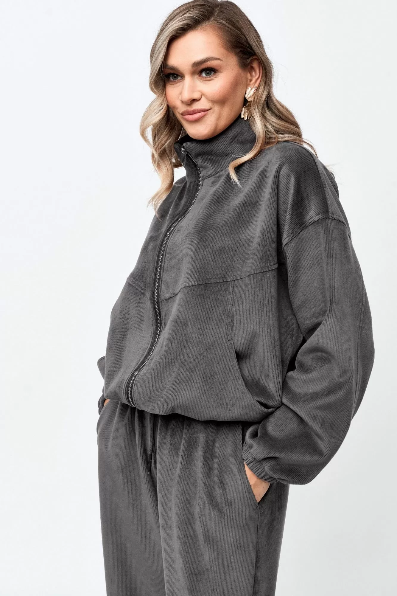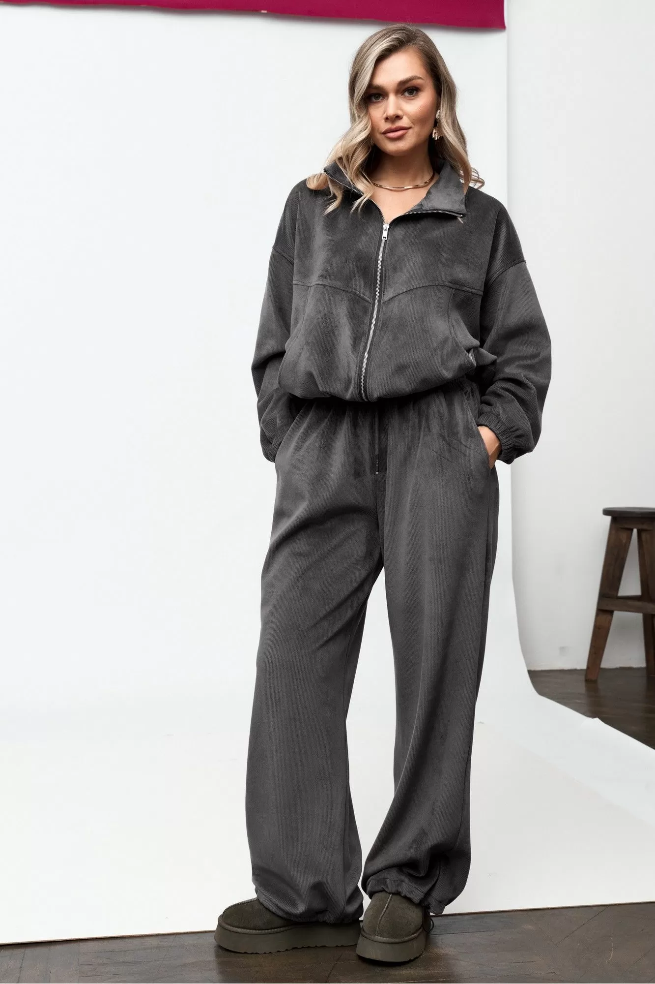 Костюм спортивный женский состоит из джемпера и брюк. Костюм выполнен из велюровой ткани в рубчик.