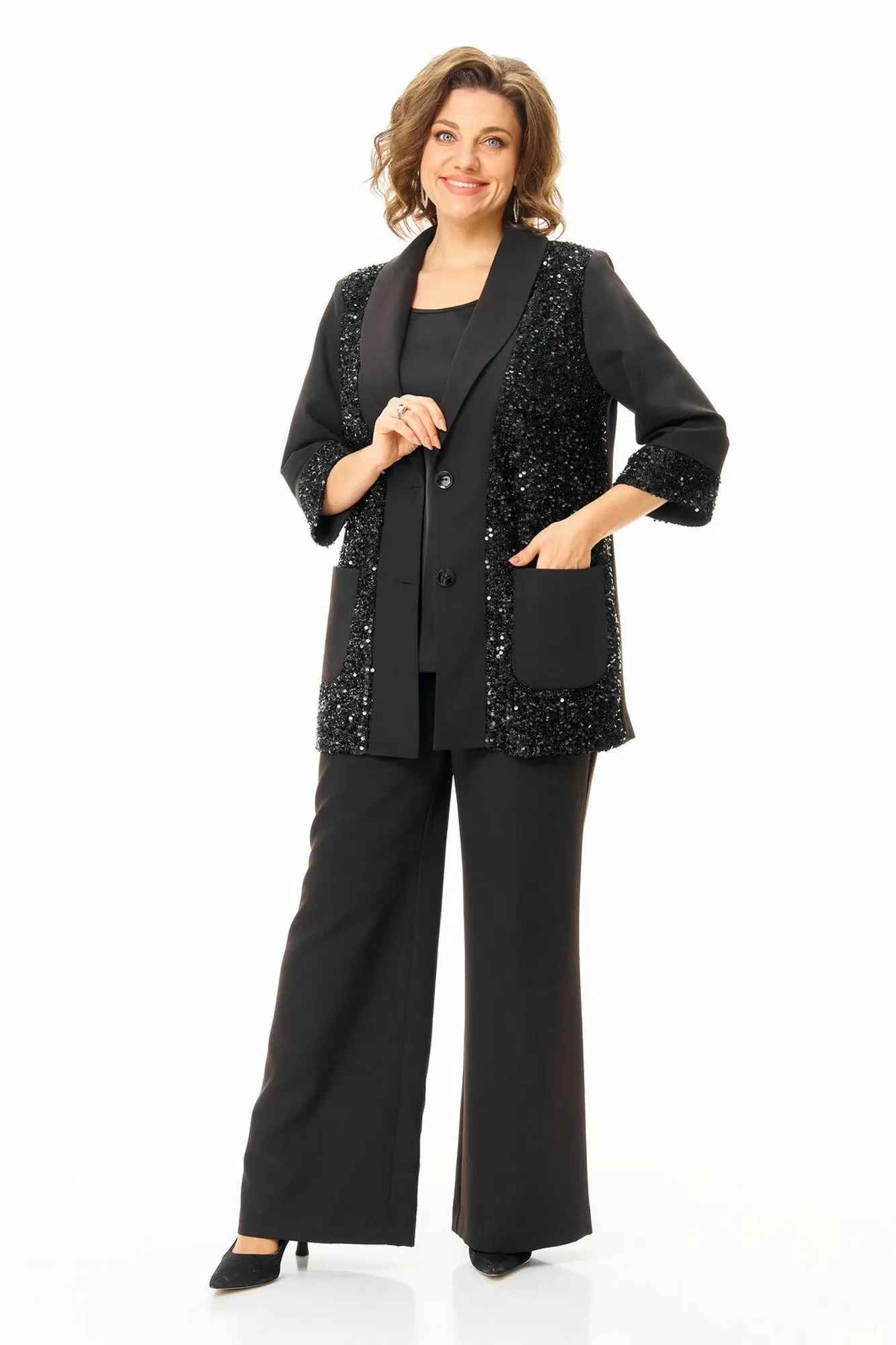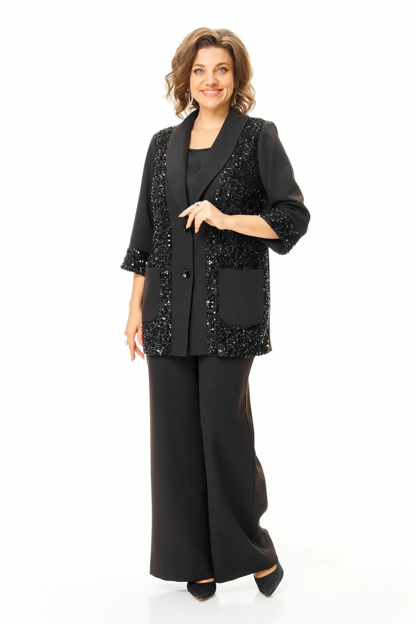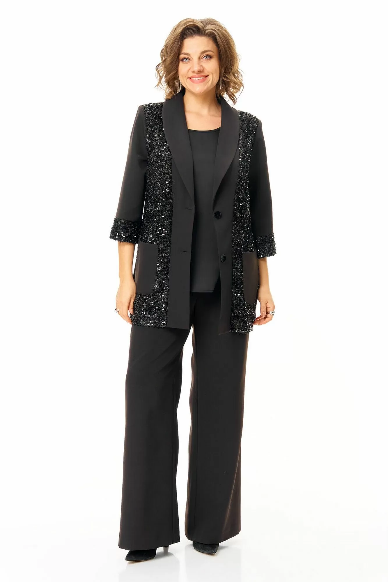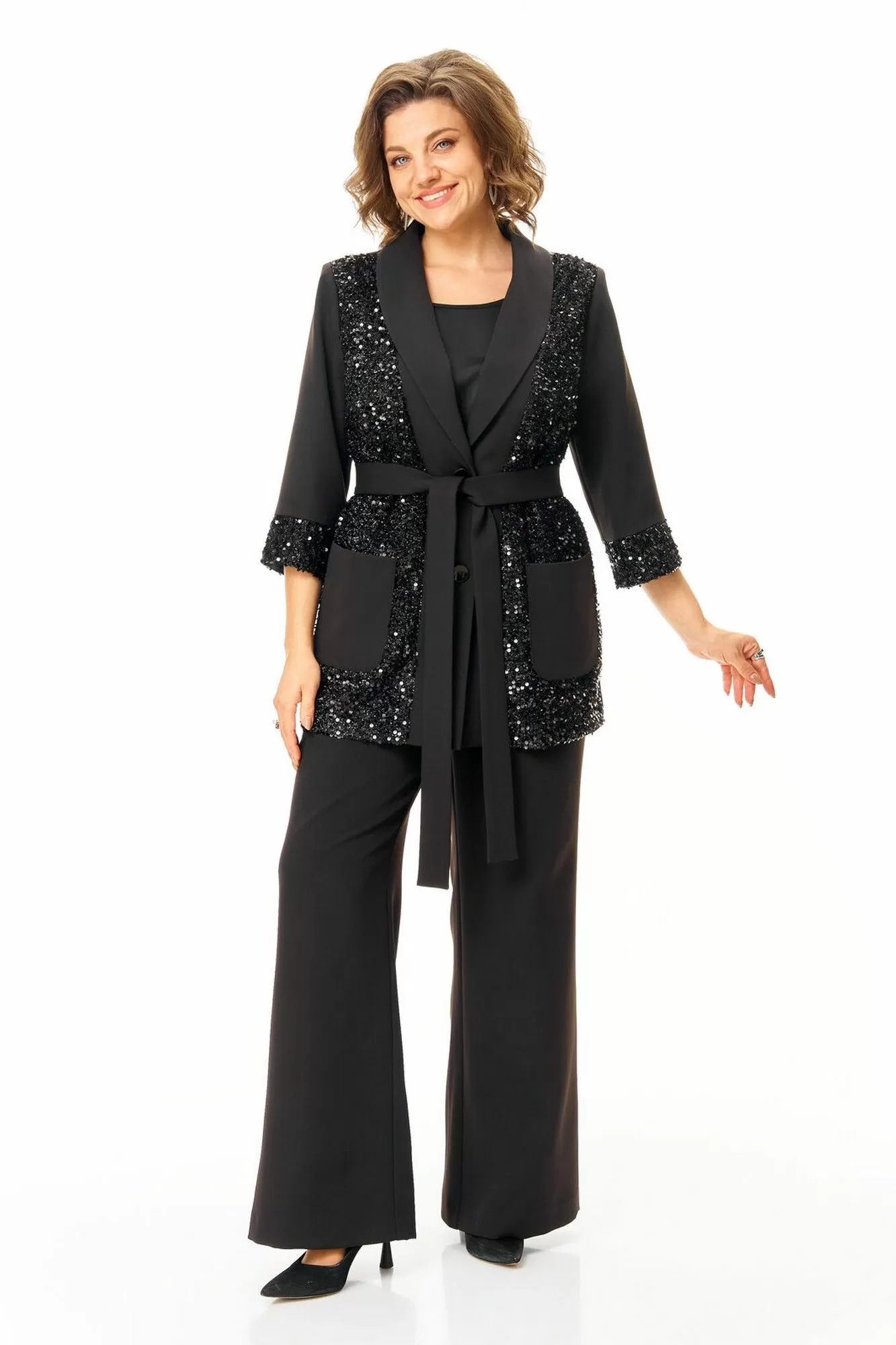 Комплект женский состоит из жакета, топа и брюк. Жакет свободного покроя с естественной линией плеча.Рукав втачной одношовный длиной 3/4 с манжетой из отделочной ткани "пайетки".Перед выполнен из отделочной ткани "пайетки" на атласной подкладке.Обработаны отрезные планки.Застежка центрально-бортовая на петли пуговицы.Воротник отложной типа "шаль".На переде выполнены накладные карманы.Топ свободного покроя из атласной ткани.Горловина округлой формы.Брюки расширенные к низу типа "палаццо" с центральной застёжкой на молнию и петлю-пуговицу.В боковых швах карманы с отрезным бочком.Пояс притачной с резинкой по задней части пояса.В комплект входит съёмный пояс.