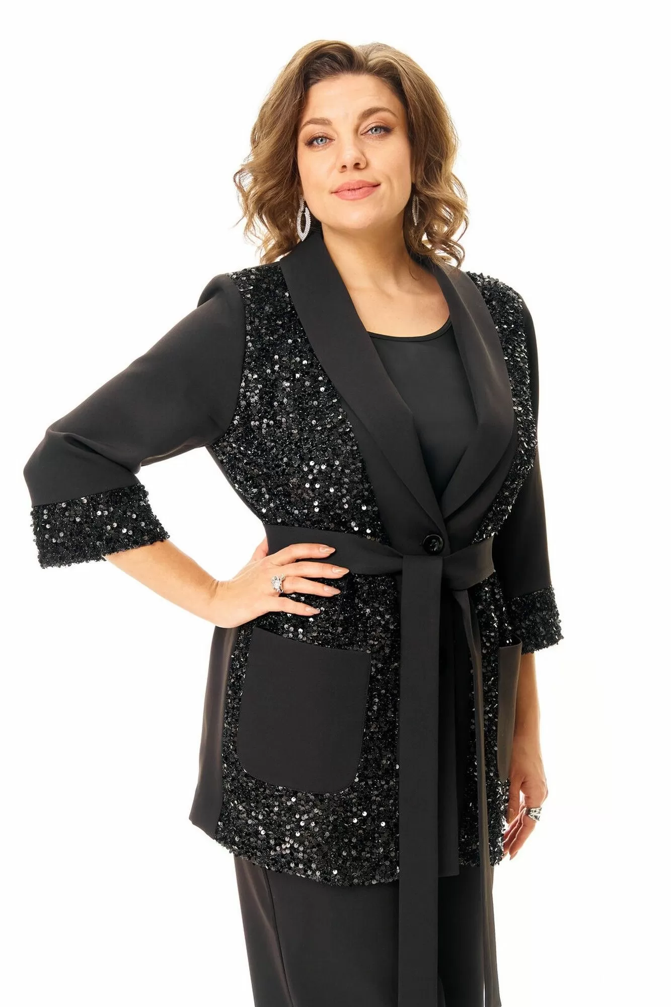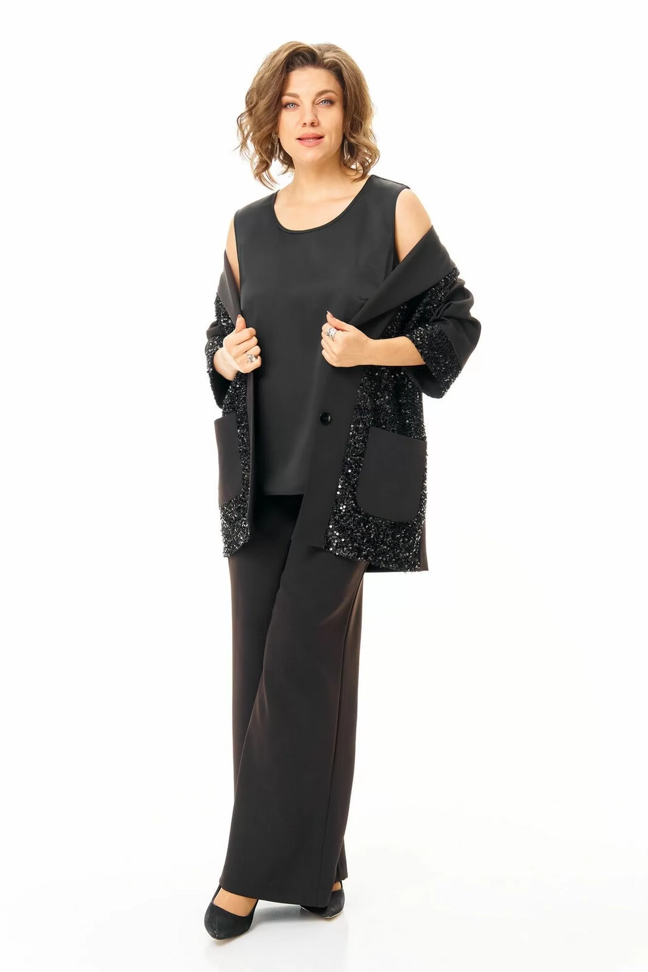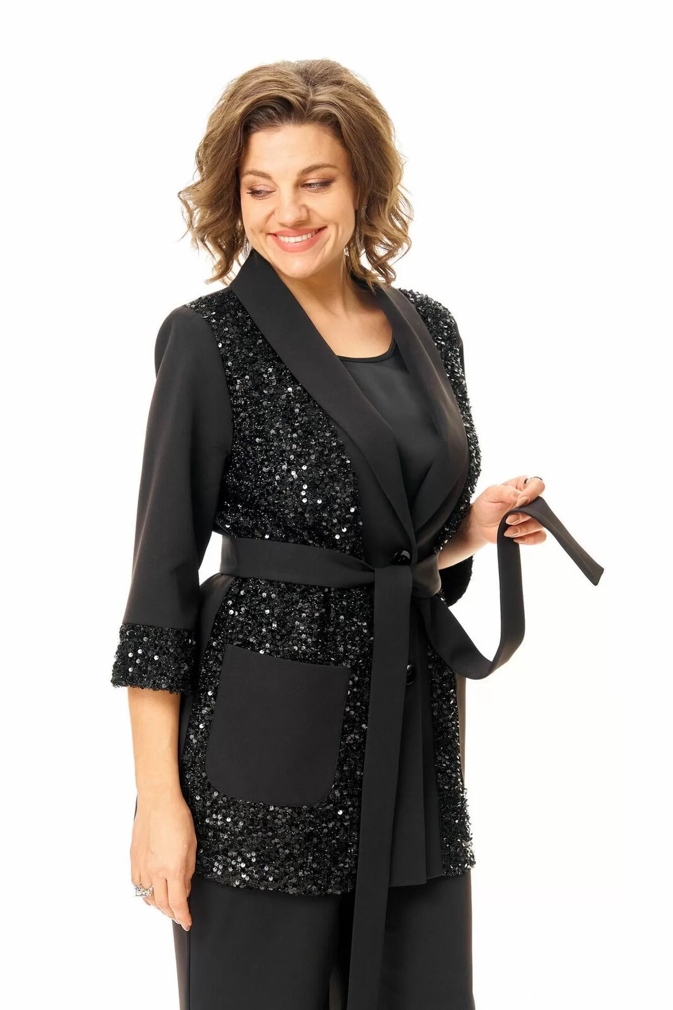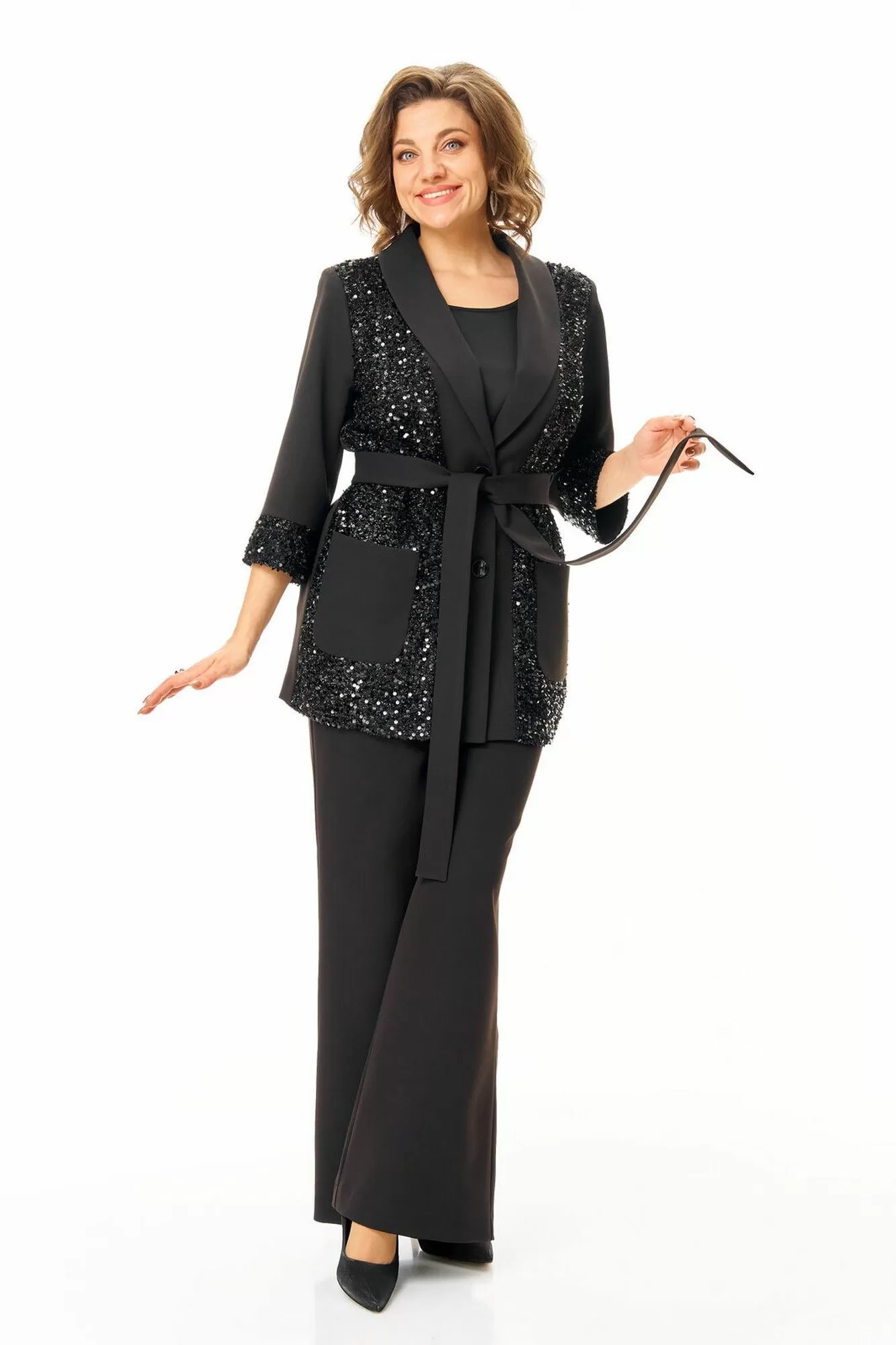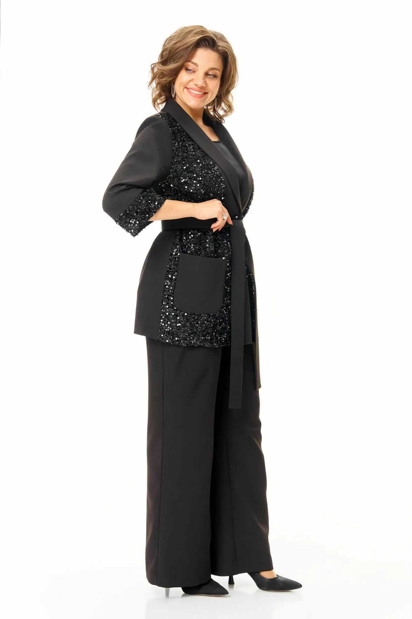 Комплект женский состоит из жакета, топа и брюк. Жакет свободного покроя с естественной линией плеча.Рукав втачной одношовный длиной 3/4 с манжетой из отделочной ткани "пайетки".Перед выполнен из отделочной ткани "пайетки" на атласной подкладке.Обработаны отрезные планки.Застежка центрально-бортовая на петли пуговицы.Воротник отложной типа "шаль".На переде выполнены накладные карманы.Топ свободного покроя из атласной ткани.Горловина округлой формы.Брюки расширенные к низу типа "палаццо" с центральной застёжкой на молнию и петлю-пуговицу.В боковых швах карманы с отрезным бочком.Пояс притачной с резинкой по задней части пояса.В комплект входит съёмный пояс.