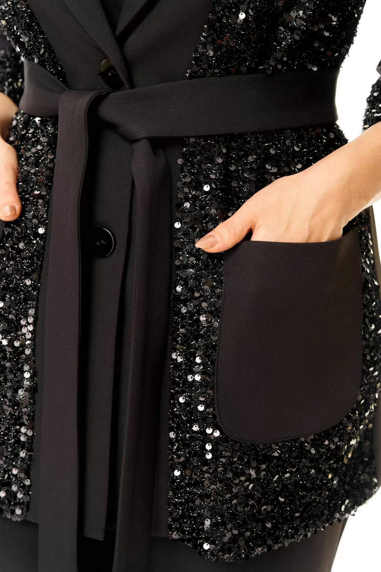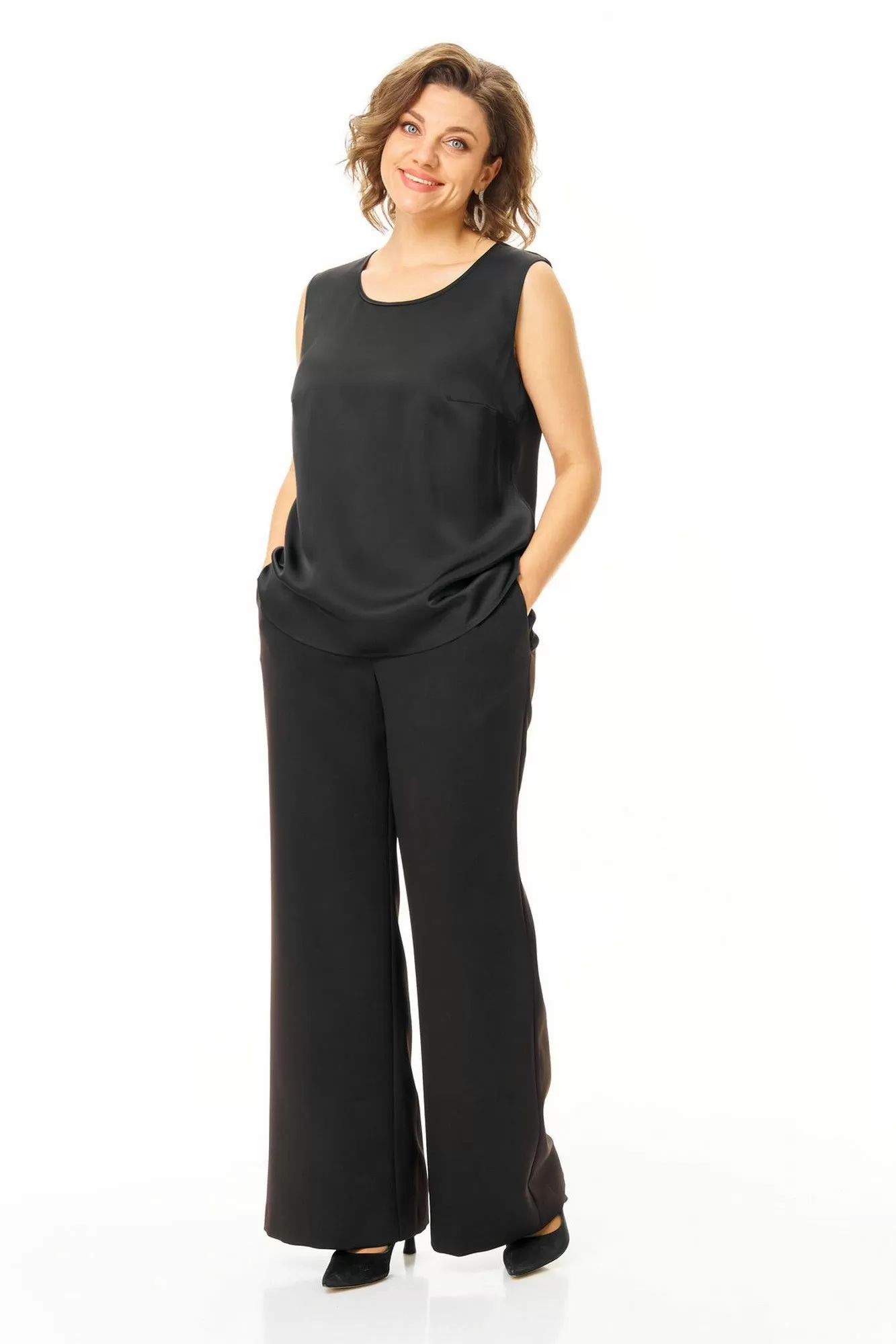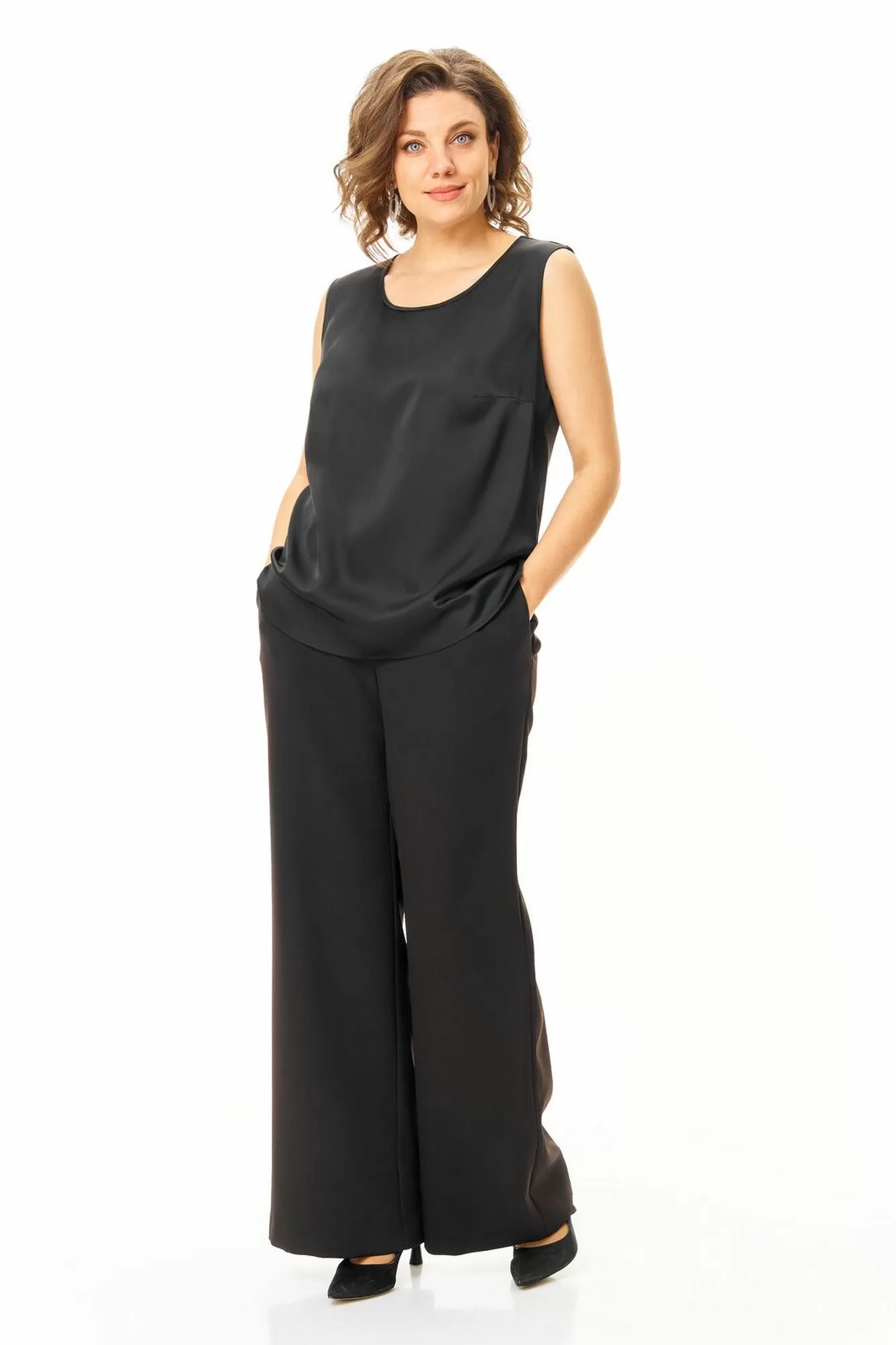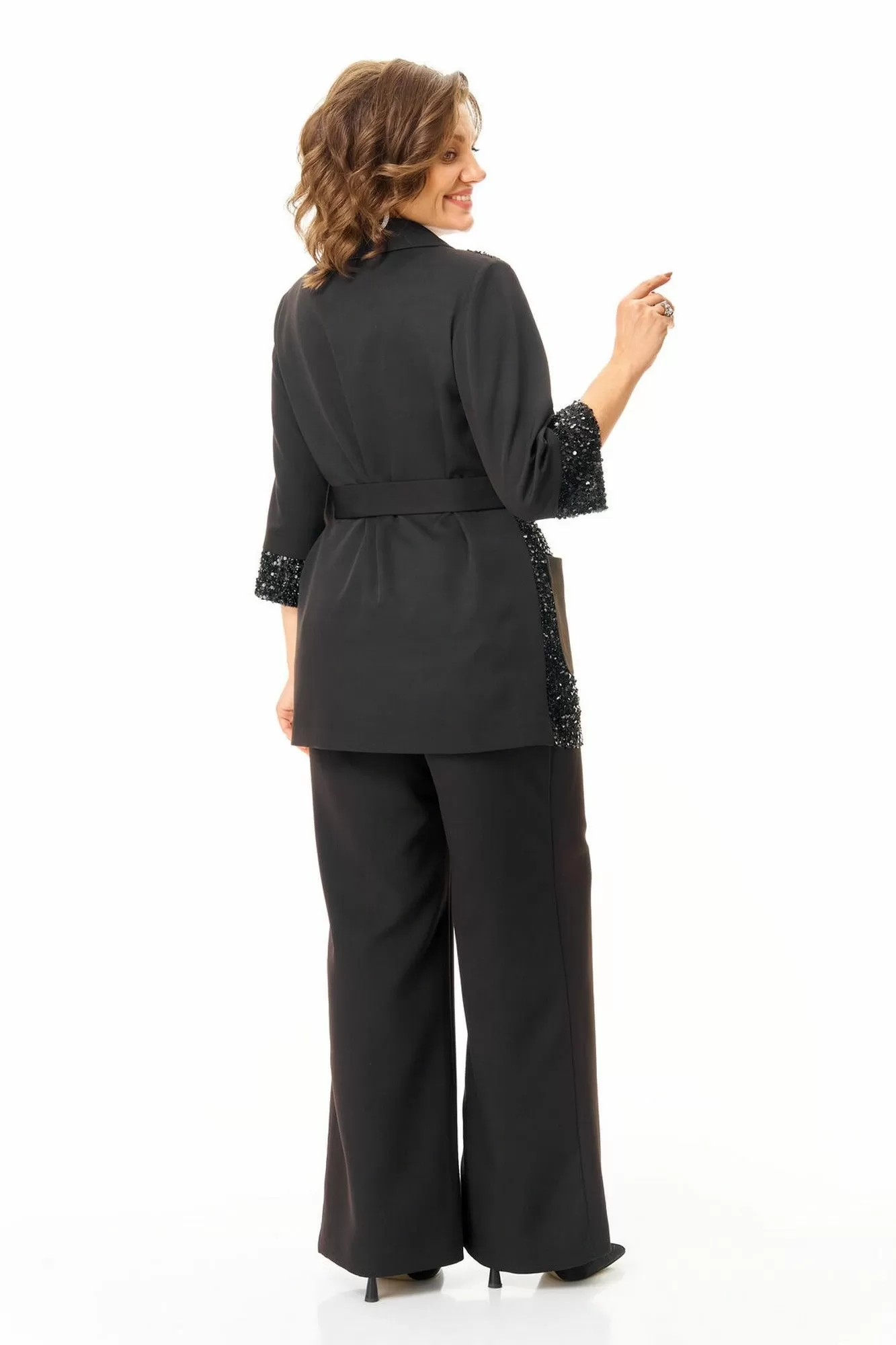 Комплект женский состоит из жакета, топа и брюк. Жакет свободного покроя с естественной линией плеча.Рукав втачной одношовный длиной 3/4 с манжетой из отделочной ткани "пайетки".Перед выполнен из отделочной ткани "пайетки" на атласной подкладке.Обработаны отрезные планки.Застежка центрально-бортовая на петли пуговицы.Воротник отложной типа "шаль".На переде выполнены накладные карманы.Топ свободного покроя из атласной ткани.Горловина округлой формы.Брюки расширенные к низу типа "палаццо" с центральной застёжкой на молнию и петлю-пуговицу.В боковых швах карманы с отрезным бочком.Пояс притачной с резинкой по задней части пояса.В комплект входит съёмный пояс.