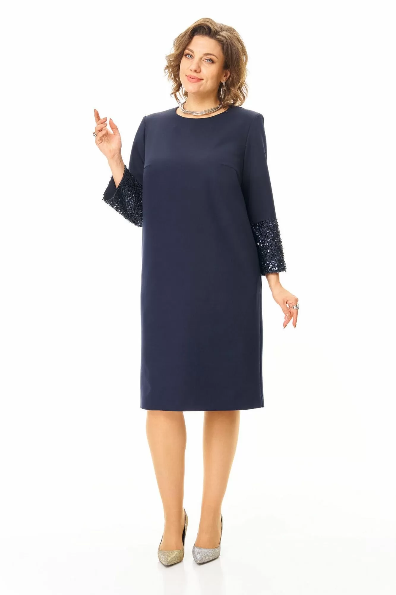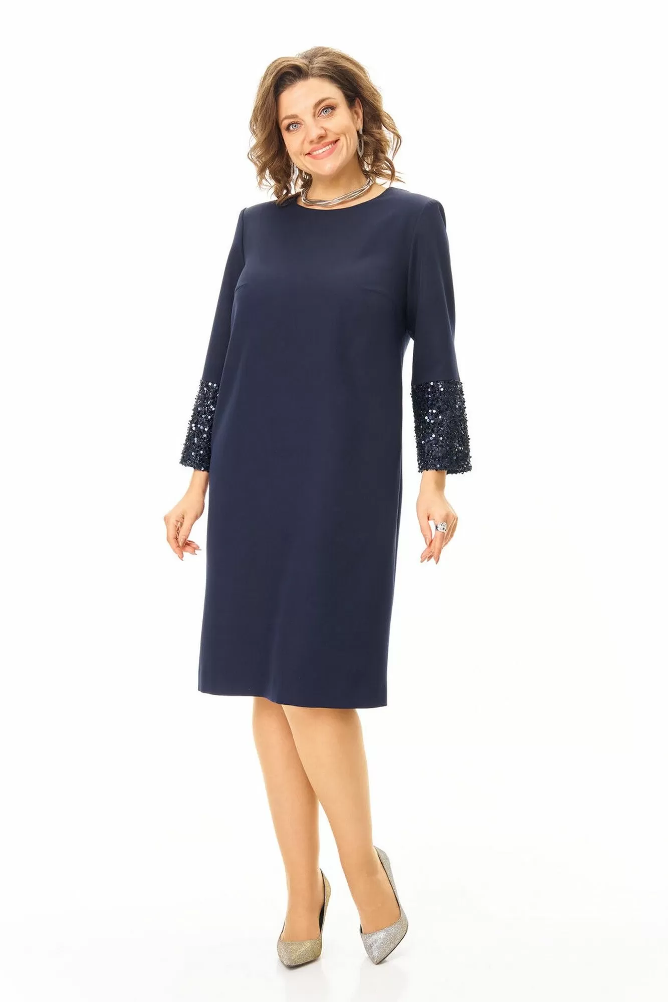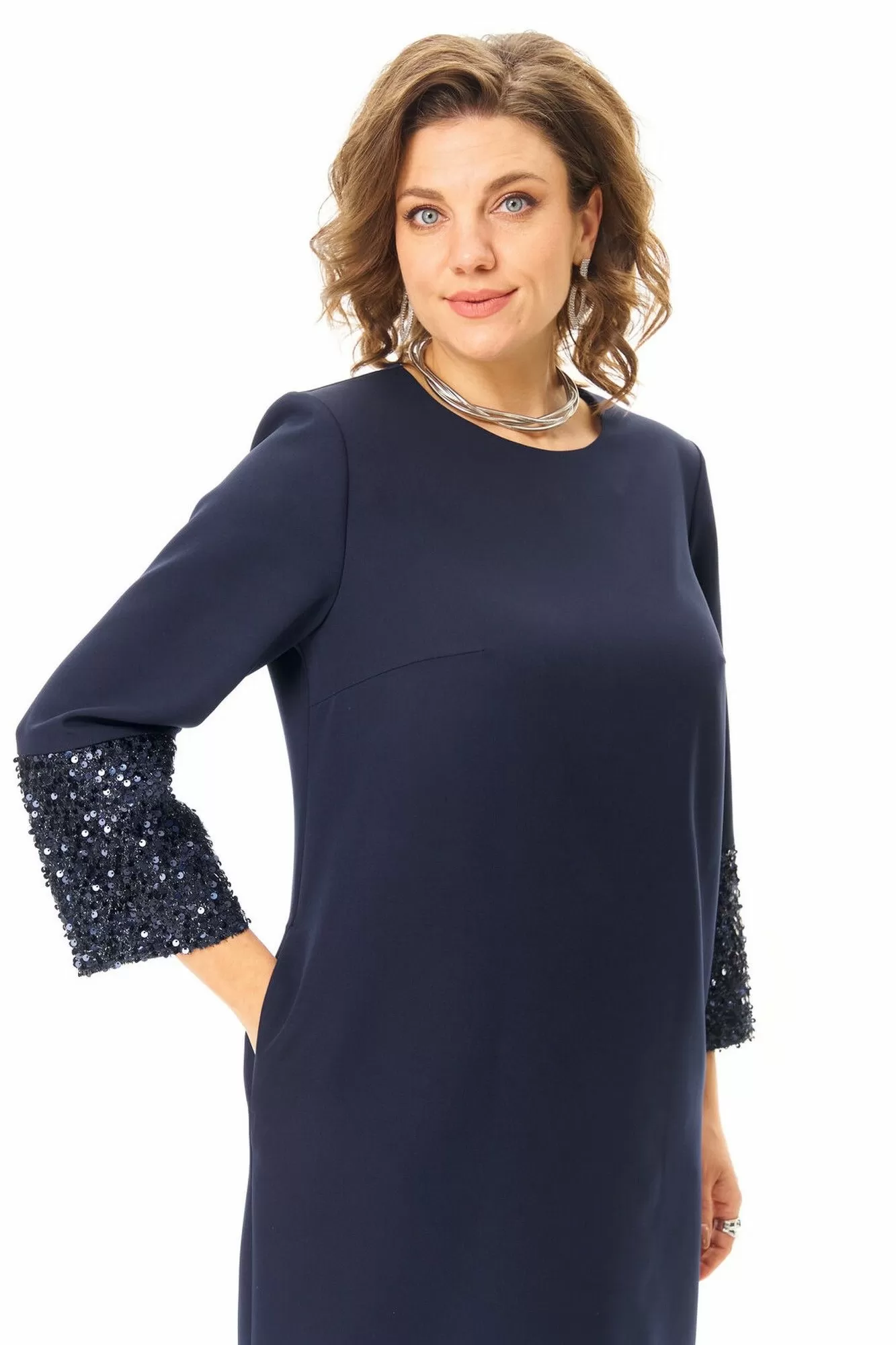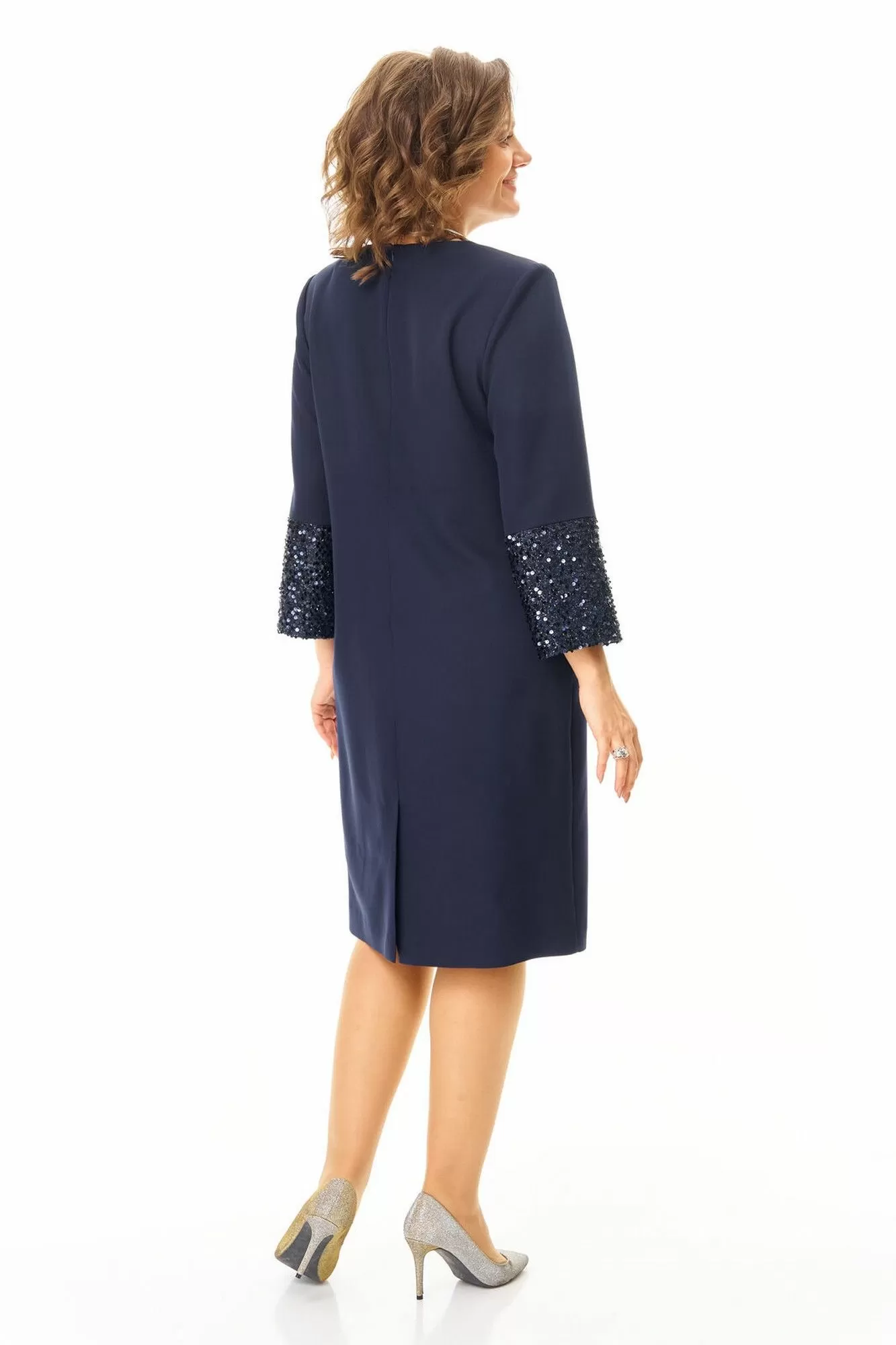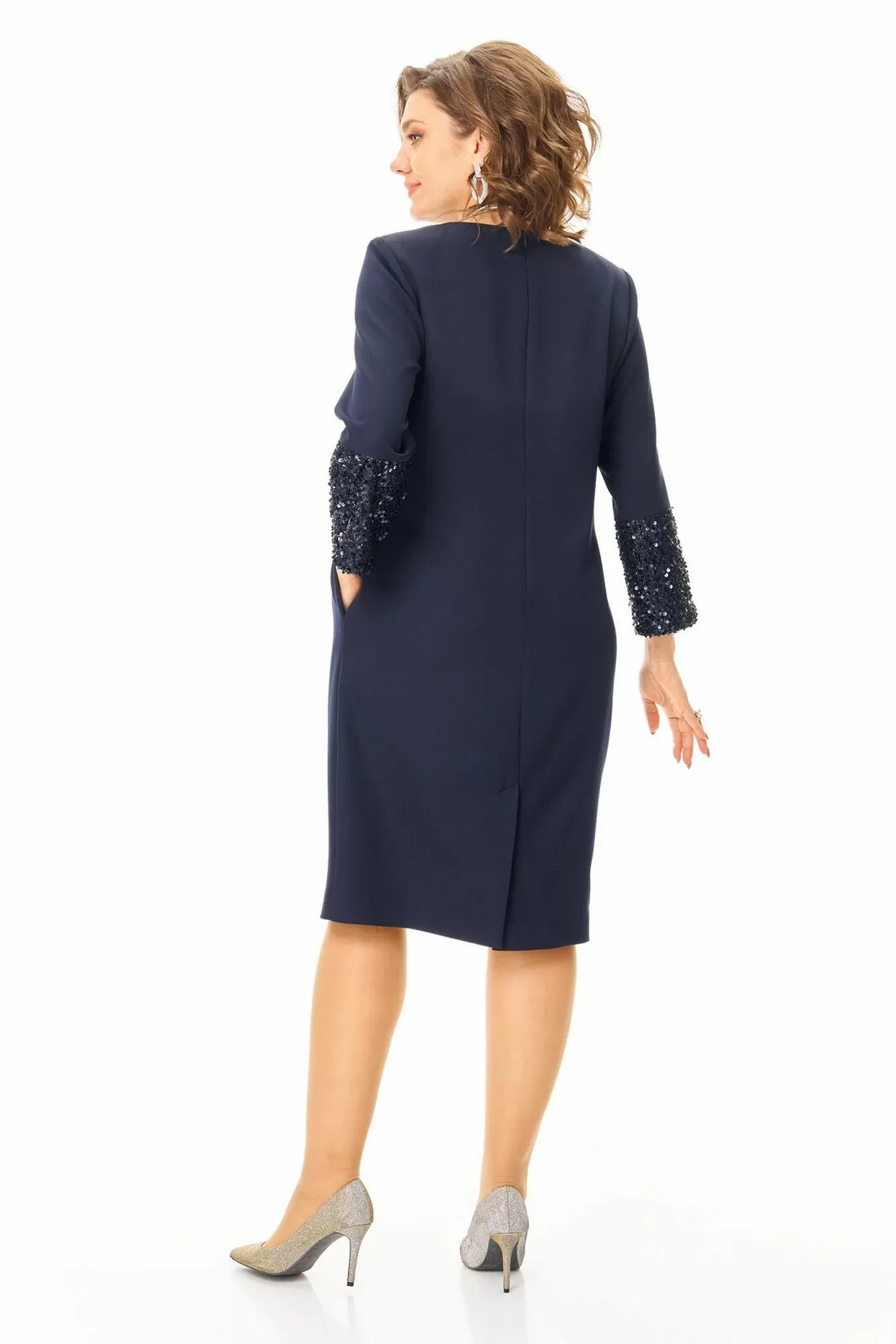 Платье прямого силуэта с естественной линией плеча.Спинка со средним швом и застежкой на молнию.В среднем шве спинки выполнена шлица.Перед с нагрудными вытачками.Вырез горловины округлой формы.Рукав втачной одношовный длиной 5/8.Низ рукава обработан манжетой и ткани с пайетками.В боковых швах обработаны карманы.