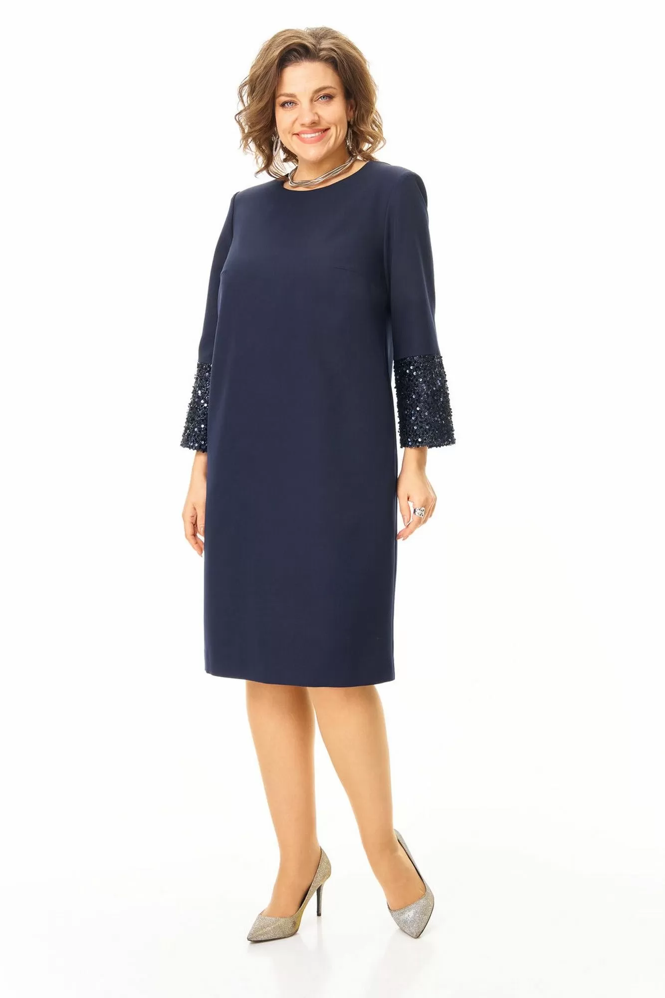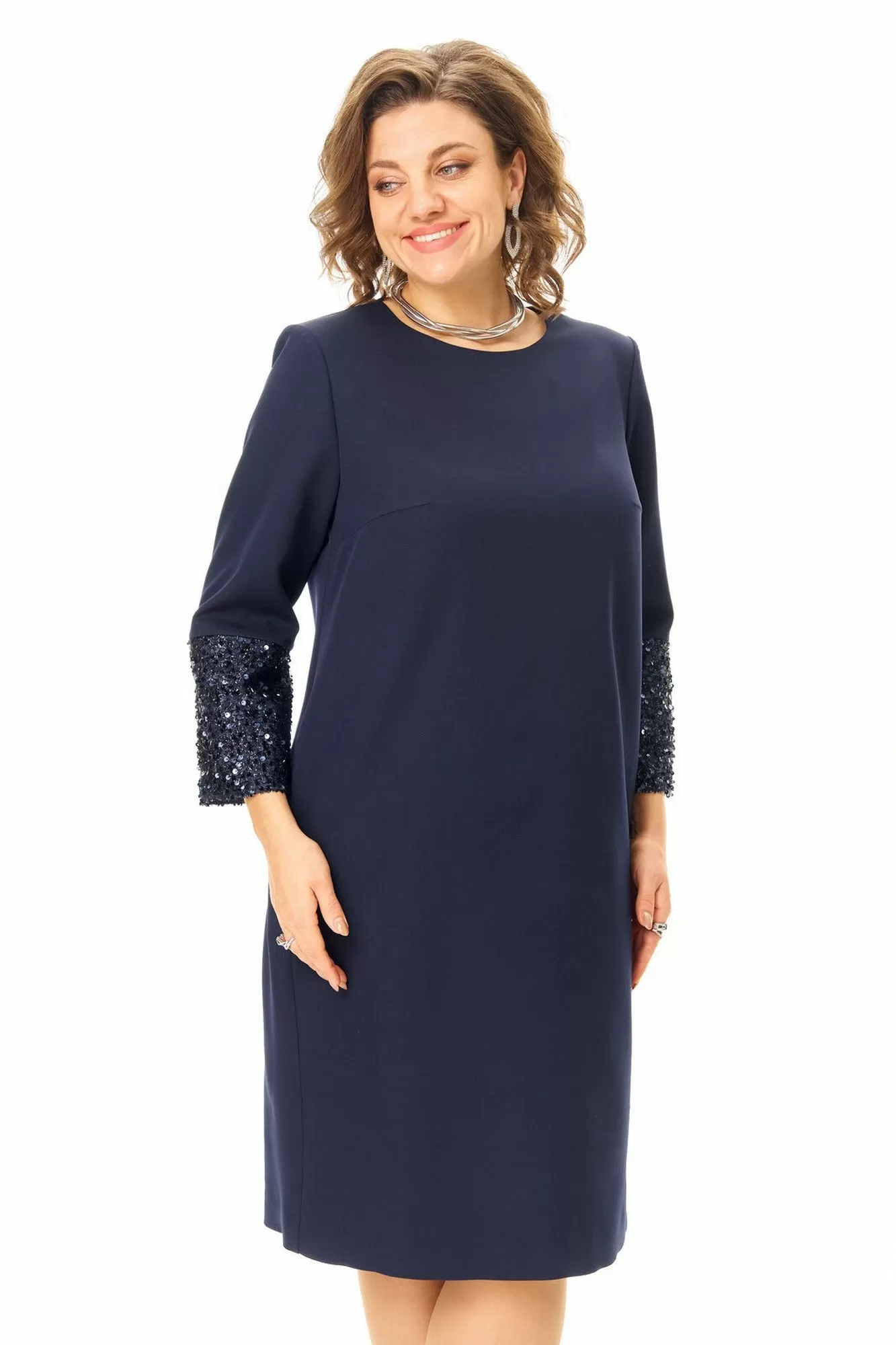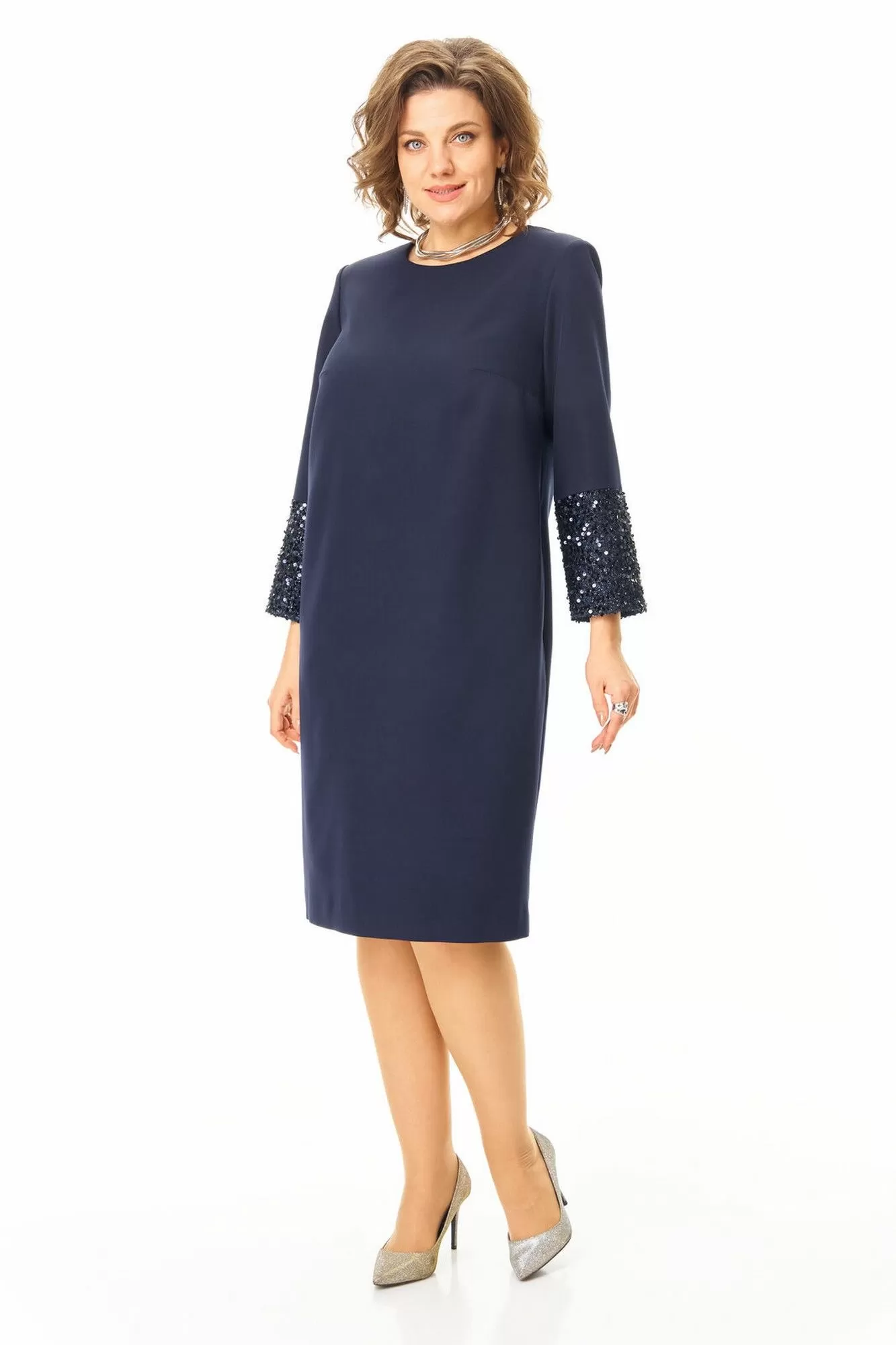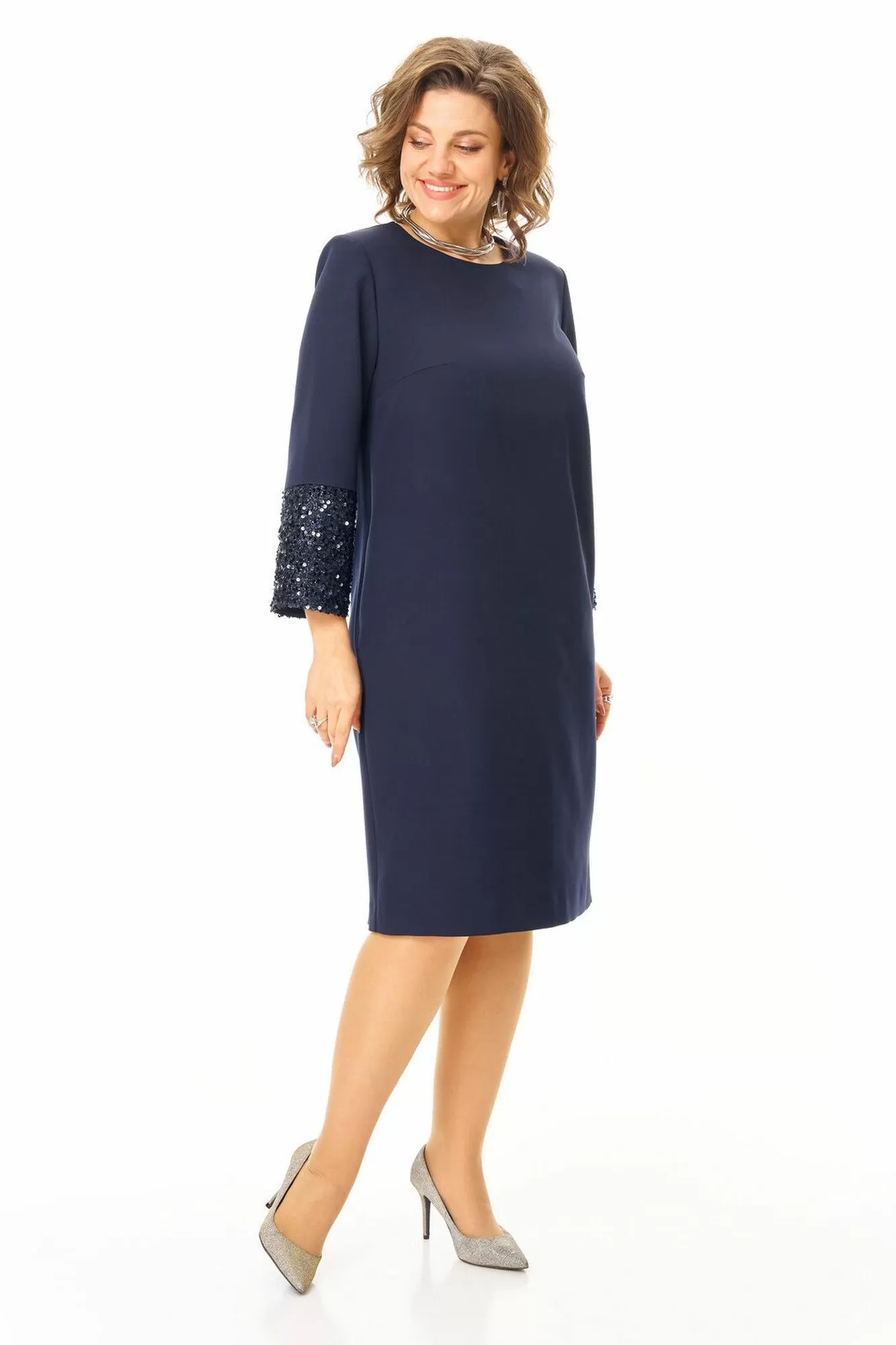 Платье прямого силуэта с естественной линией плеча.Спинка со средним швом и застежкой на молнию.В среднем шве спинки выполнена шлица.Перед с нагрудными вытачками.Вырез горловины округлой формы.Рукав втачной одношовный длиной 5/8.Низ рукава обработан манжетой и ткани с пайетками.В боковых швах обработаны карманы.