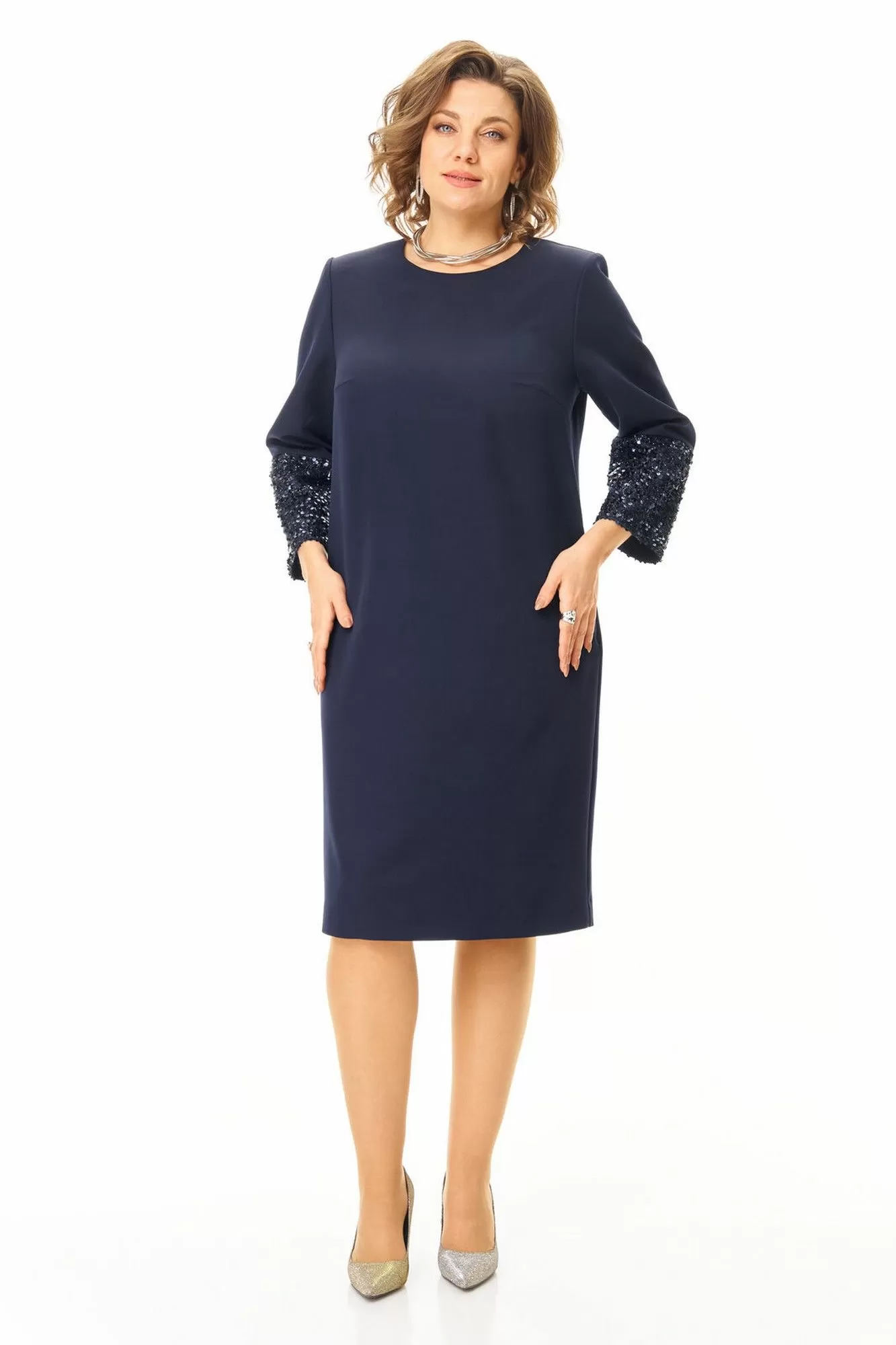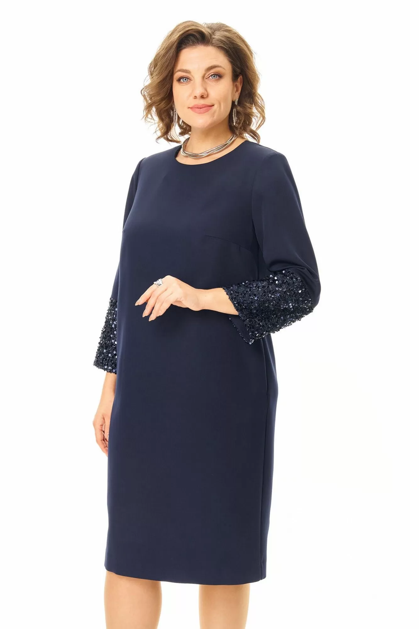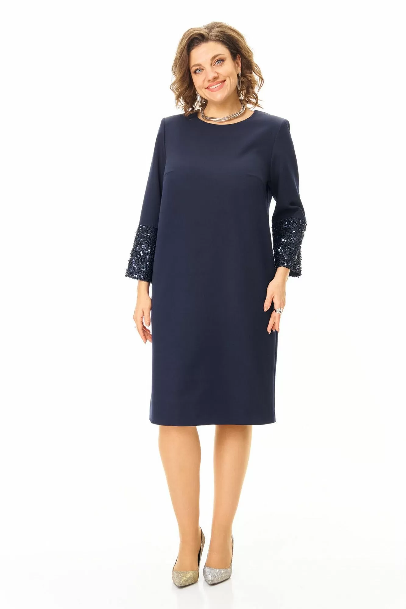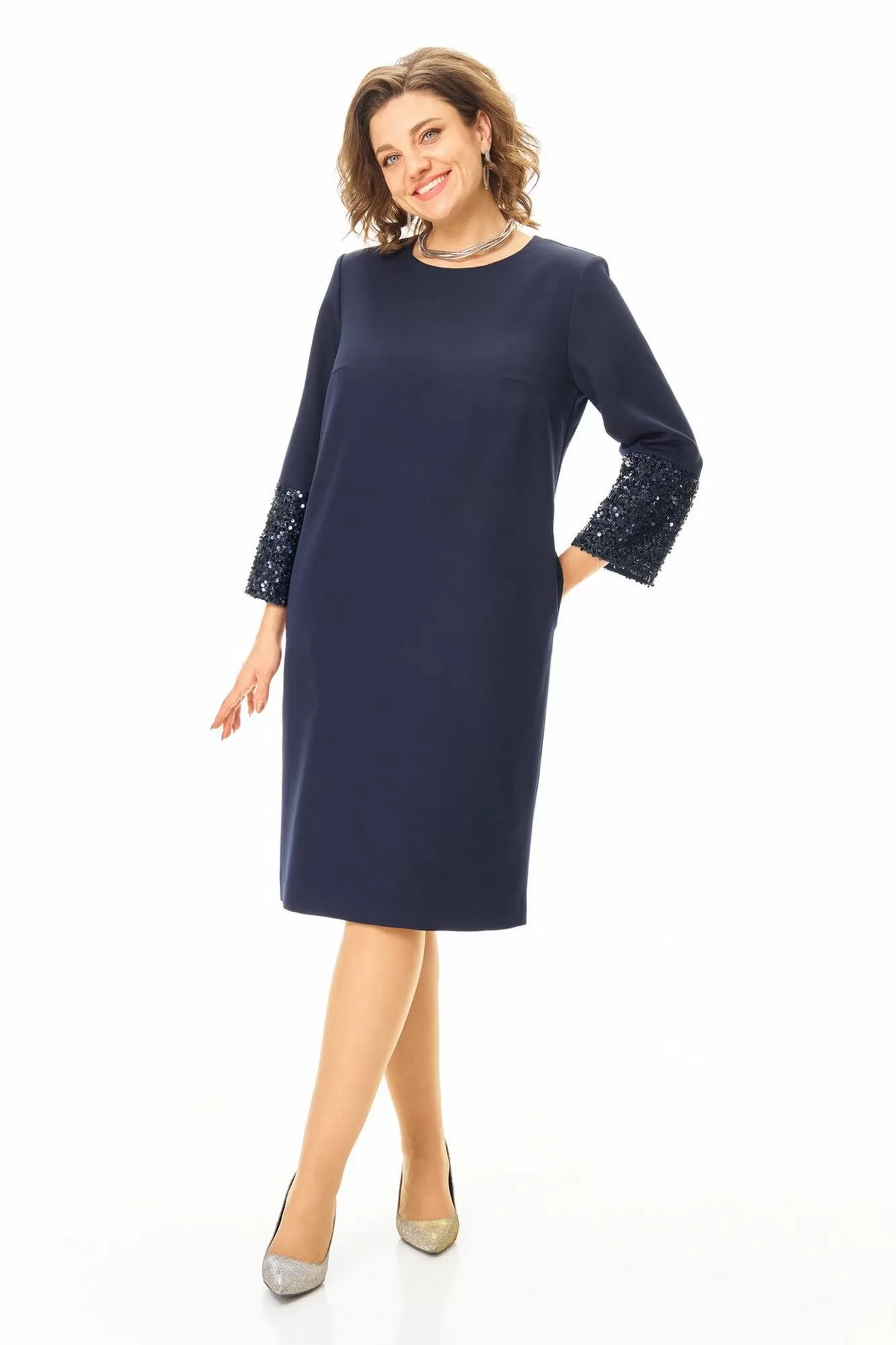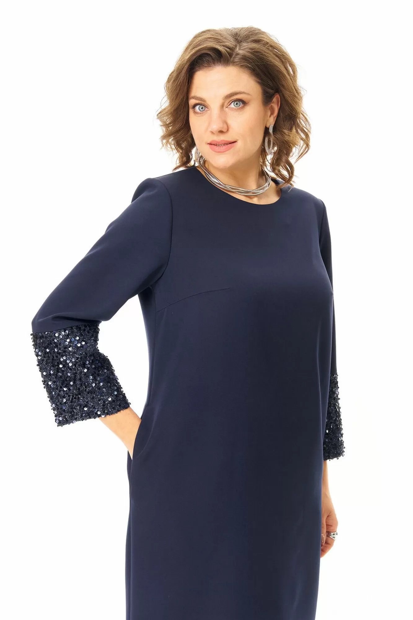 Платье прямого силуэта с естественной линией плеча.Спинка со средним швом и застежкой на молнию.В среднем шве спинки выполнена шлица.Перед с нагрудными вытачками.Вырез горловины округлой формы.Рукав втачной одношовный длиной 5/8.Низ рукава обработан манжетой и ткани с пайетками.В боковых швах обработаны карманы.