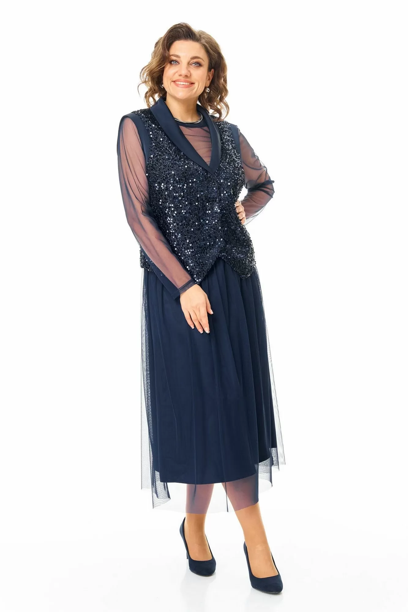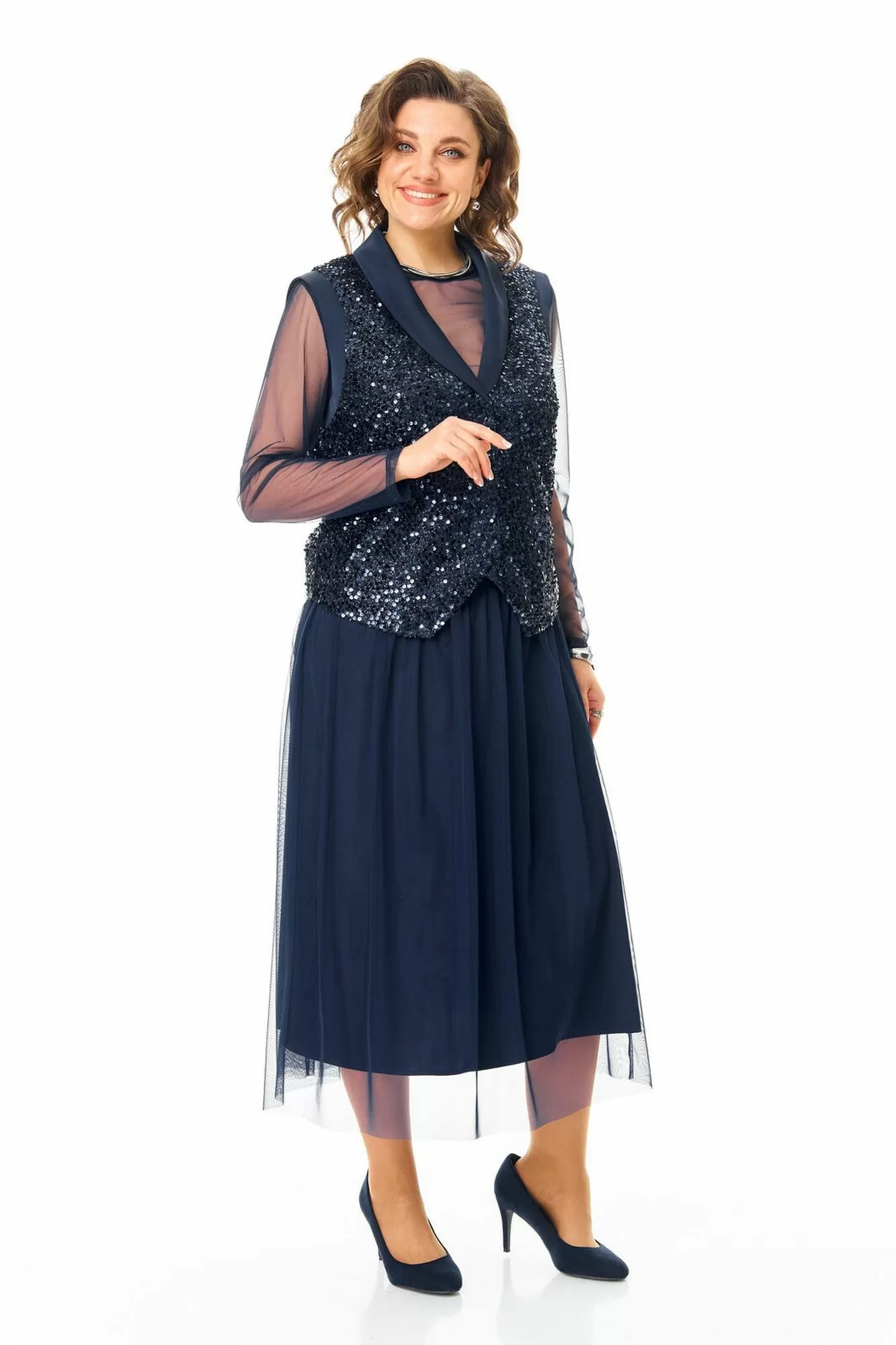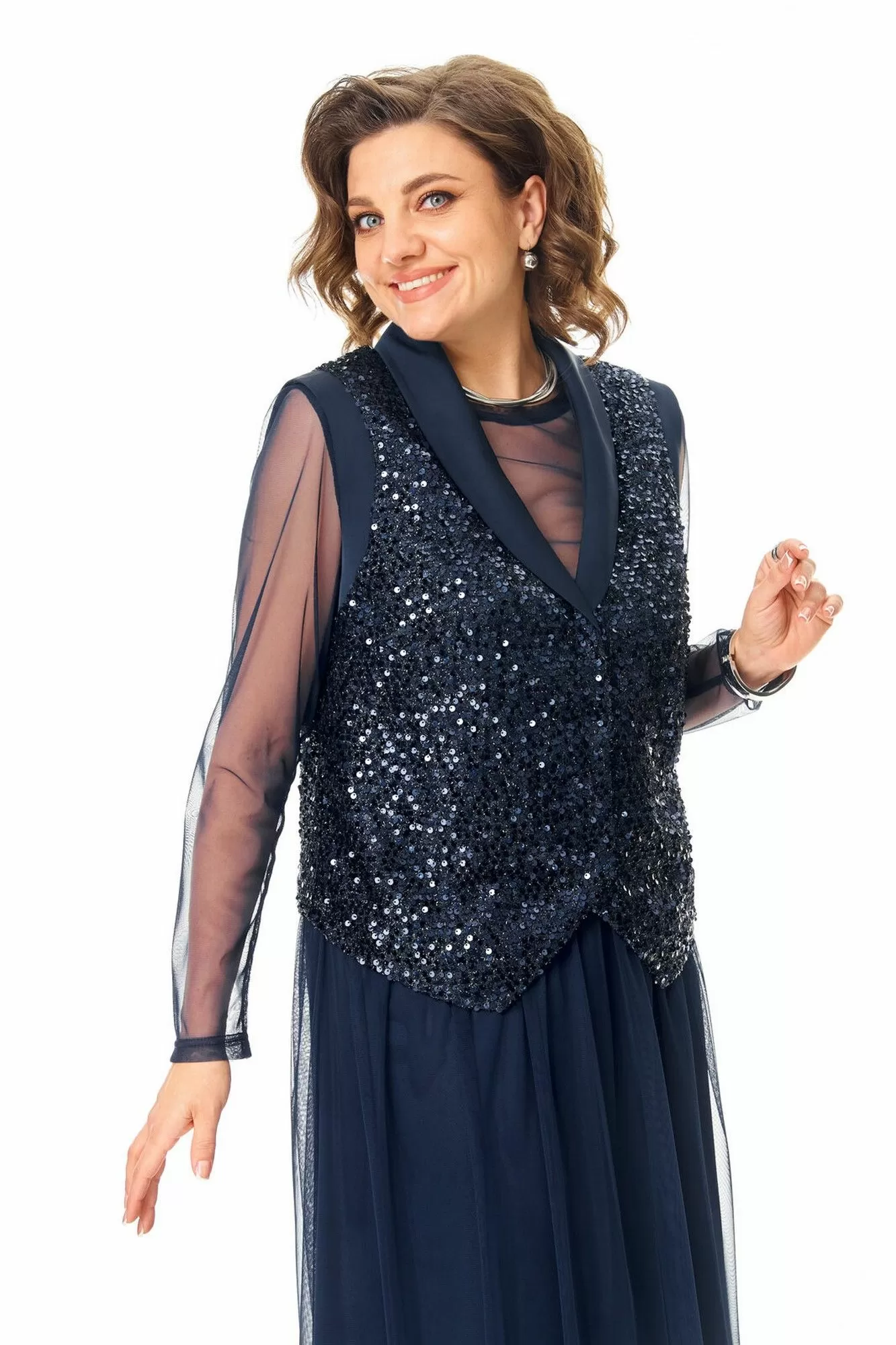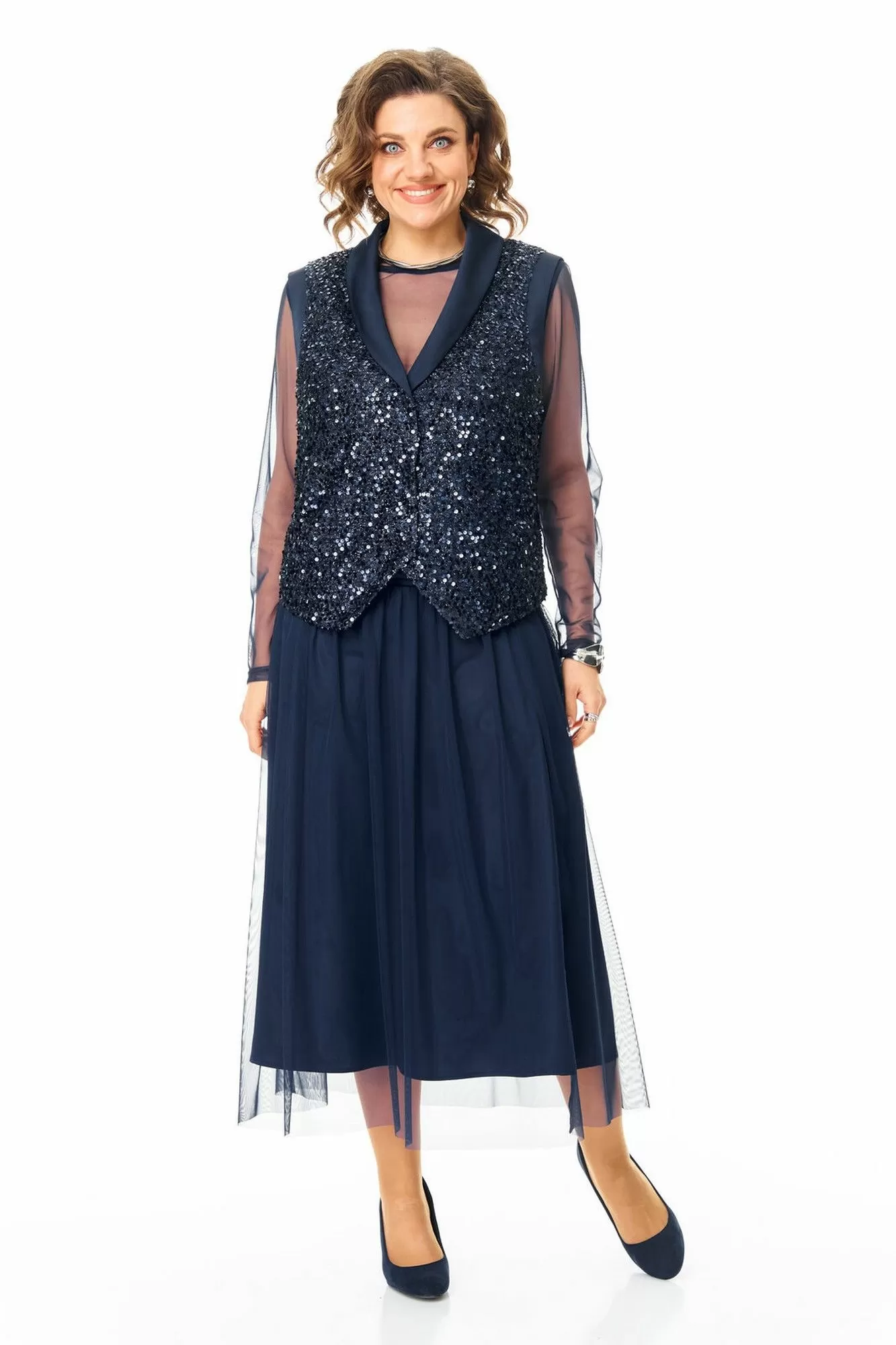 Комплект женский состоит из жилета, топа и юбки.Жилет полуприлегающего покроя на подкладке из шелковой атласной ткани.Пред и спинка выполнены из полотна с пайетками.По проймам выполнены бейки из атласной ткани.Низ жилета фигурной формы.Застёжка однобортная на потайные кнопки.Воротник отложной типа "шаль" из атласной ткани.Топ свободного покроя из полотна сетка.Горловина округлой формы, окантована.Рукав длинный. Юбка расширенная к низу длинной миди, двух слойная и двух уровневая. Нижний слой из шелковой атласной ткани, верхний из полотна сетка.Для удобства и свободы движения пояс на круговой резинке.