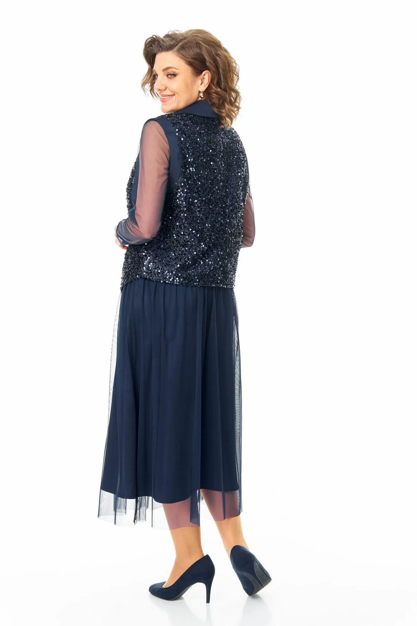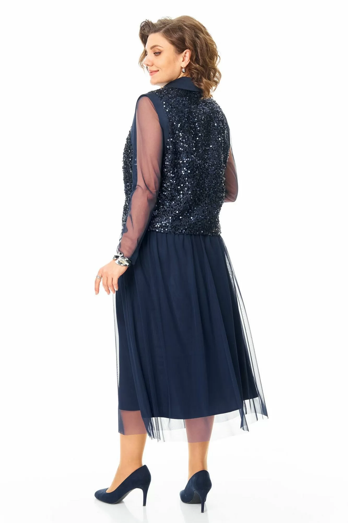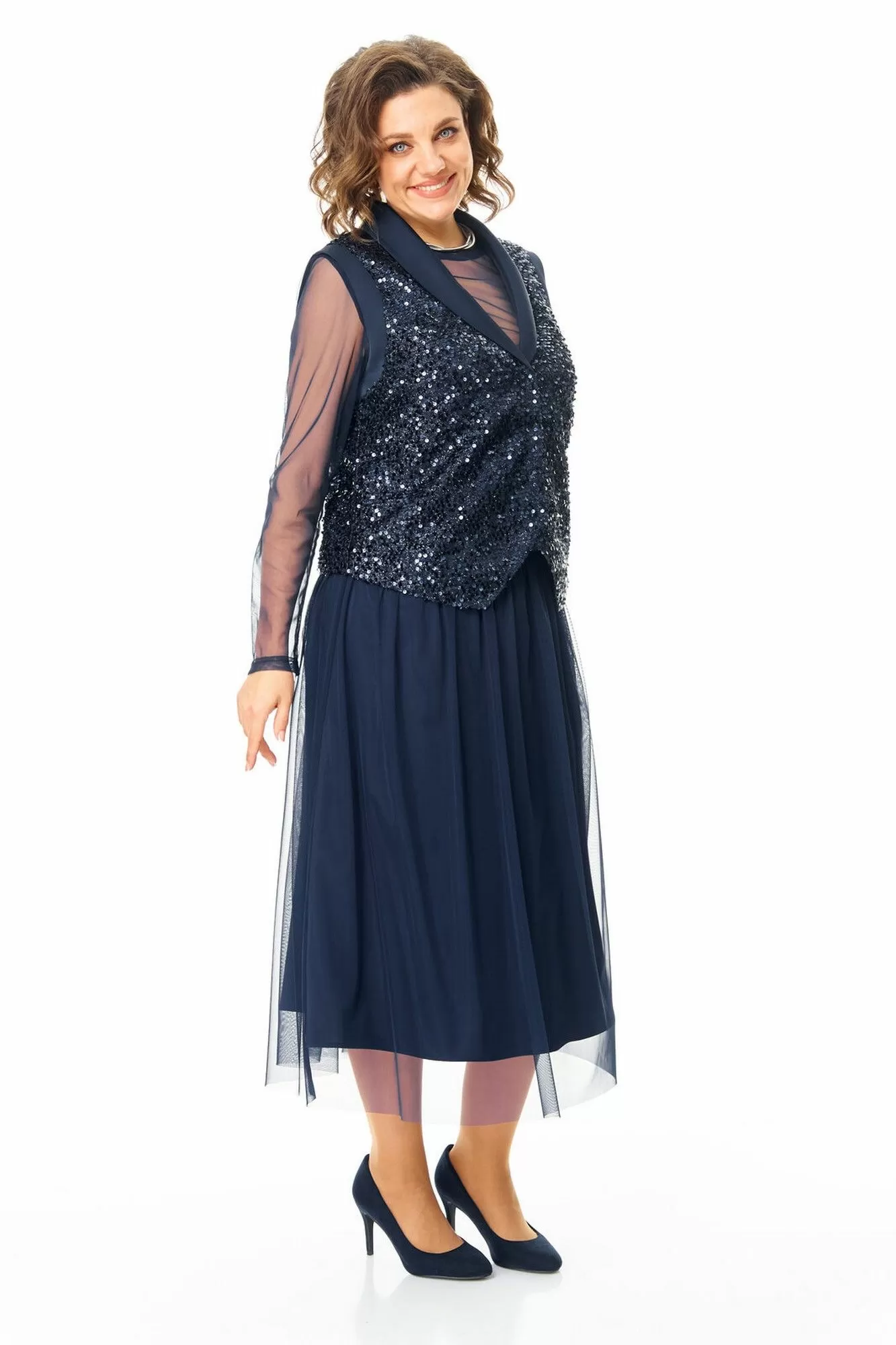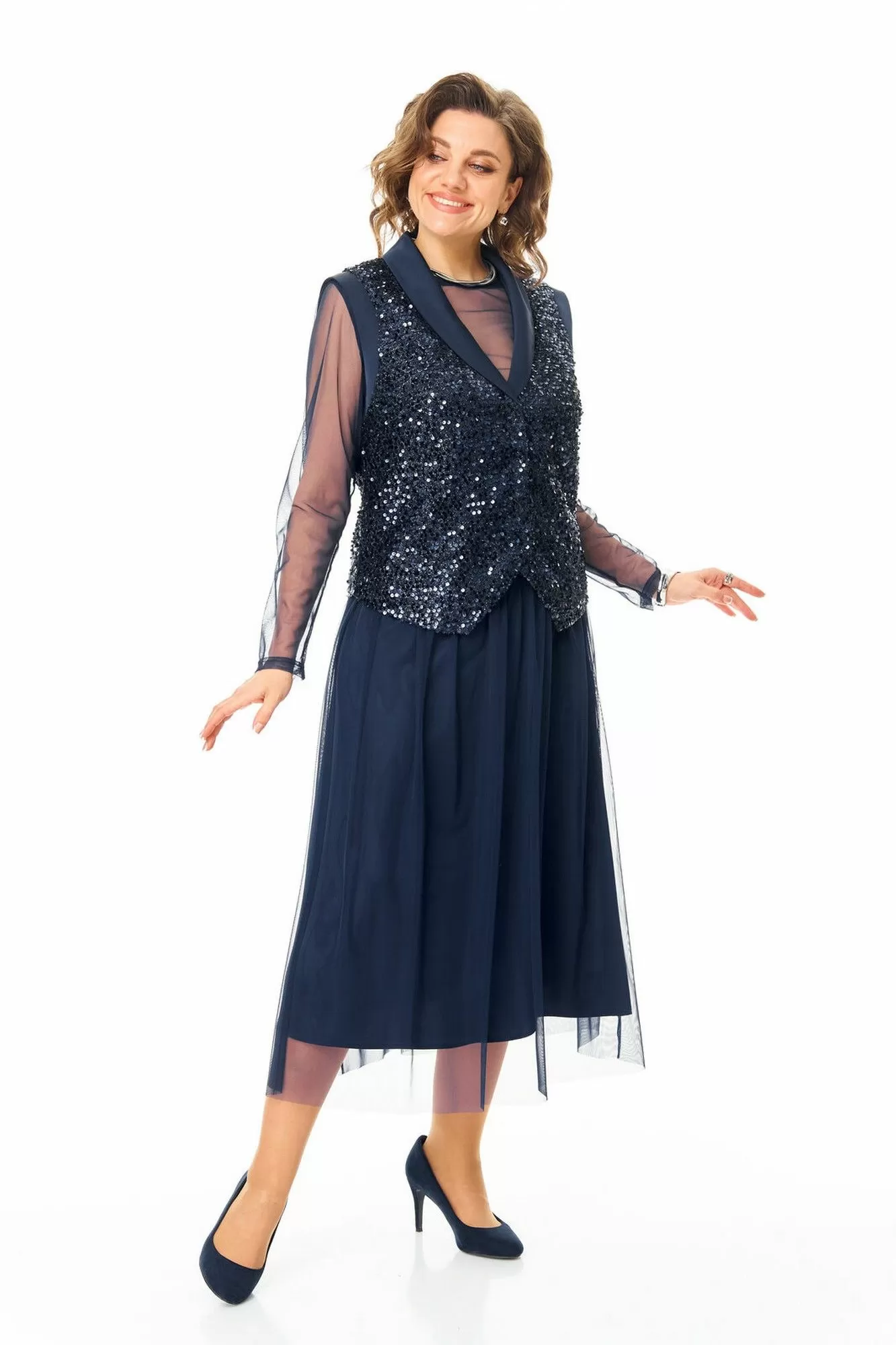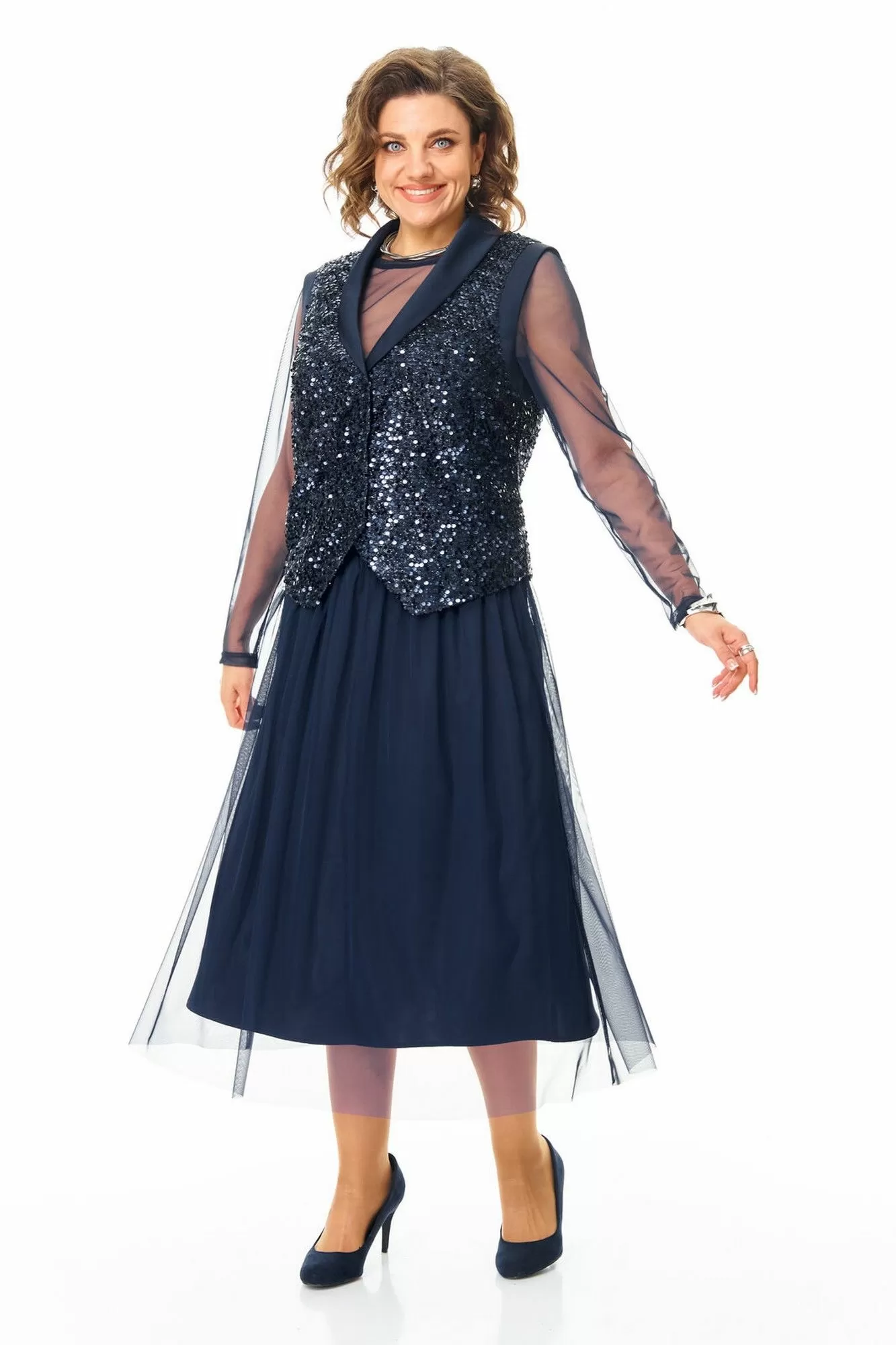 Комплект женский состоит из жилета, топа и юбки.Жилет полуприлегающего покроя на подкладке из шелковой атласной ткани.Пред и спинка выполнены из полотна с пайетками.По проймам выполнены бейки из атласной ткани.Низ жилета фигурной формы.Застёжка однобортная на потайные кнопки.Воротник отложной типа "шаль" из атласной ткани.Топ свободного покроя из полотна сетка.Горловина округлой формы, окантована.Рукав длинный. Юбка расширенная к низу длинной миди, двух слойная и двух уровневая. Нижний слой из шелковой атласной ткани, верхний из полотна сетка.Для удобства и свободы движения пояс на круговой резинке.