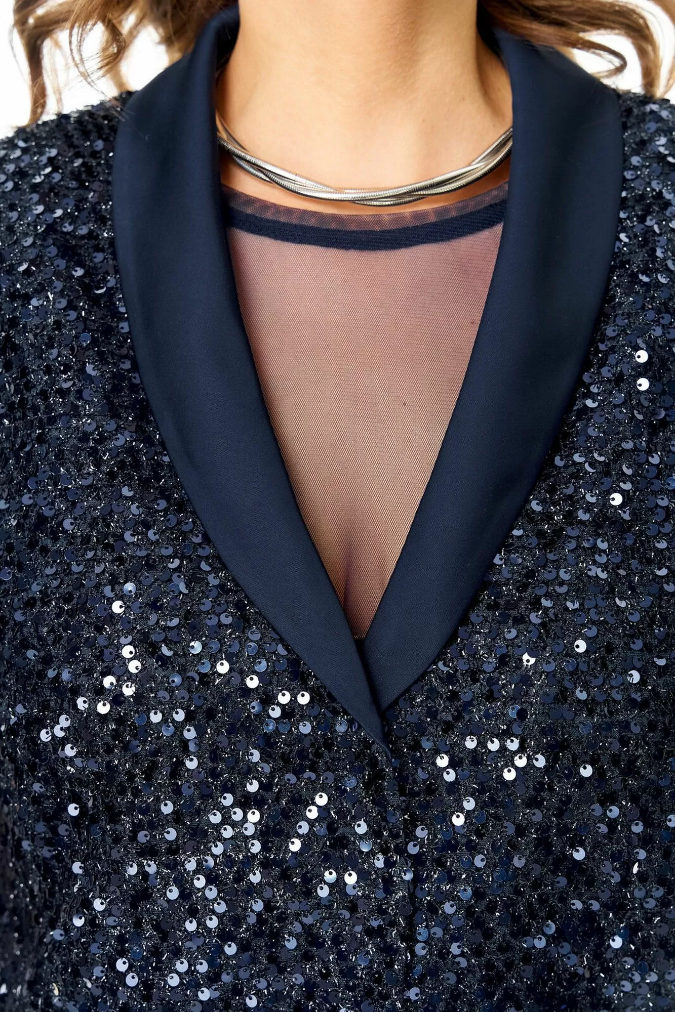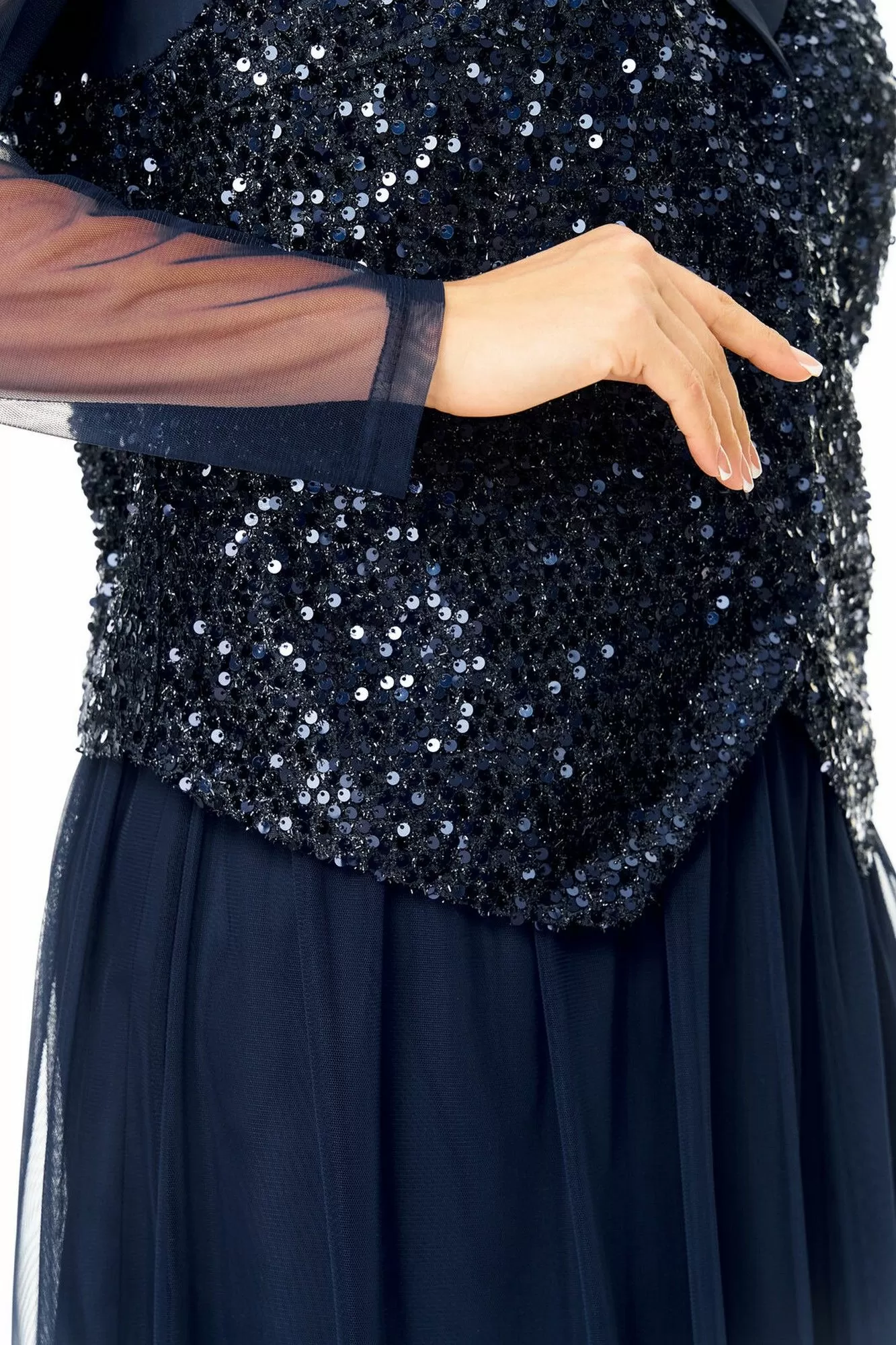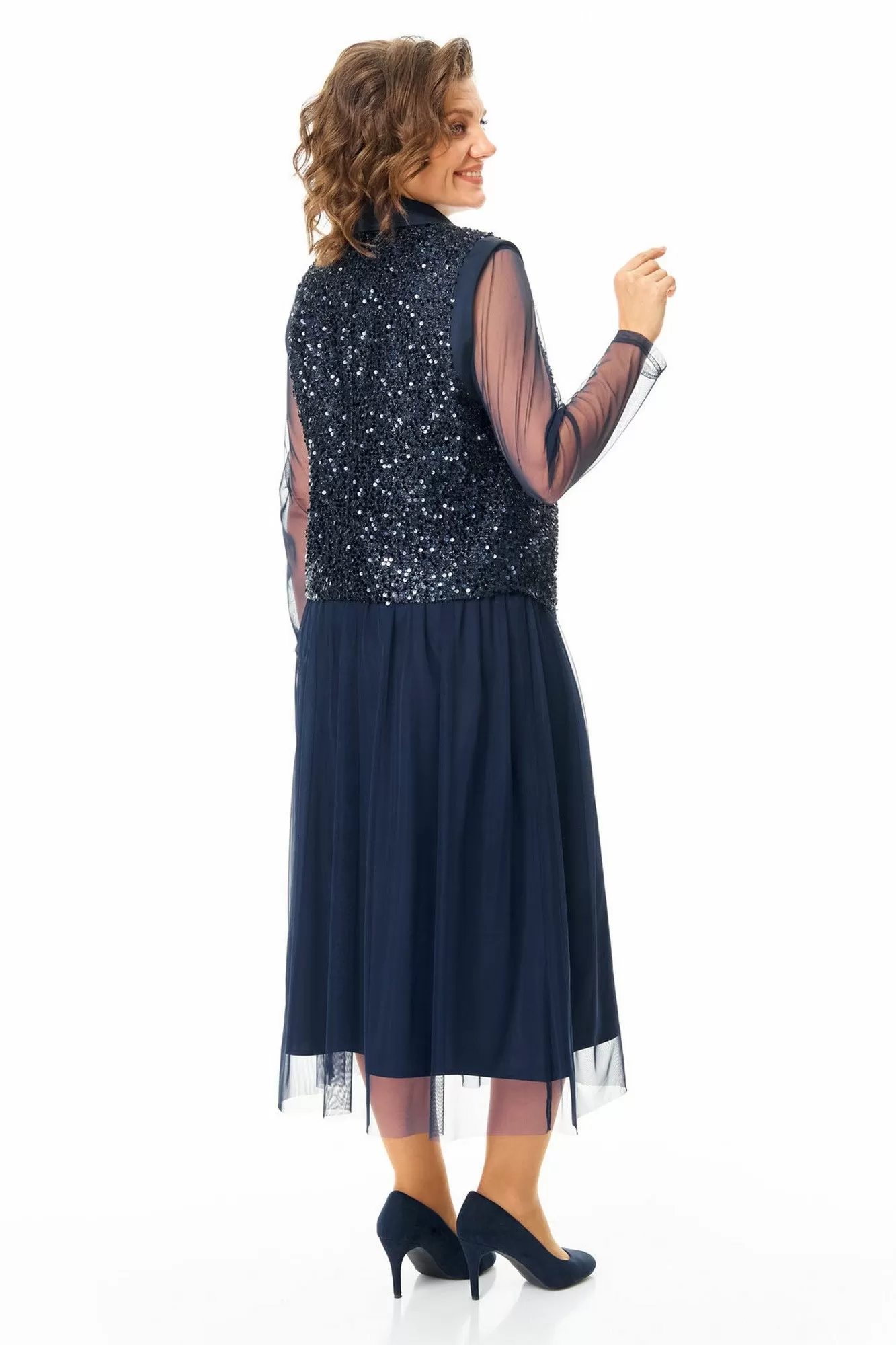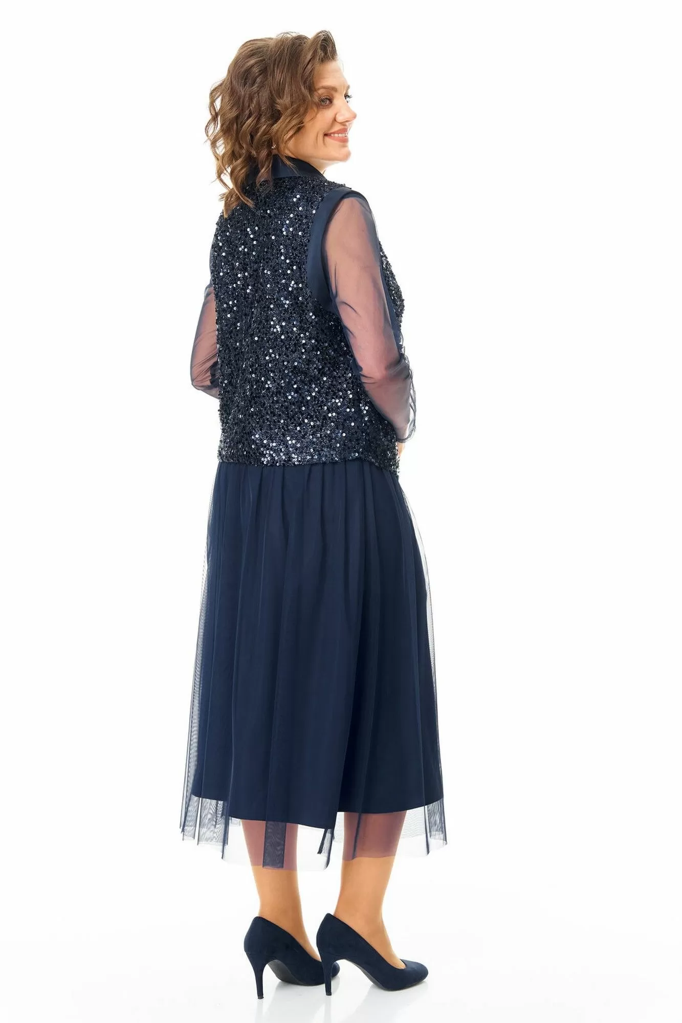 Комплект женский состоит из жилета, топа и юбки.Жилет полуприлегающего покроя на подкладке из шелковой атласной ткани.Пред и спинка выполнены из полотна с пайетками.По проймам выполнены бейки из атласной ткани.Низ жилета фигурной формы.Застёжка однобортная на потайные кнопки.Воротник отложной типа "шаль" из атласной ткани.Топ свободного покроя из полотна сетка.Горловина округлой формы, окантована.Рукав длинный. Юбка расширенная к низу длинной миди, двух слойная и двух уровневая. Нижний слой из шелковой атласной ткани, верхний из полотна сетка.Для удобства и свободы движения пояс на круговой резинке.
