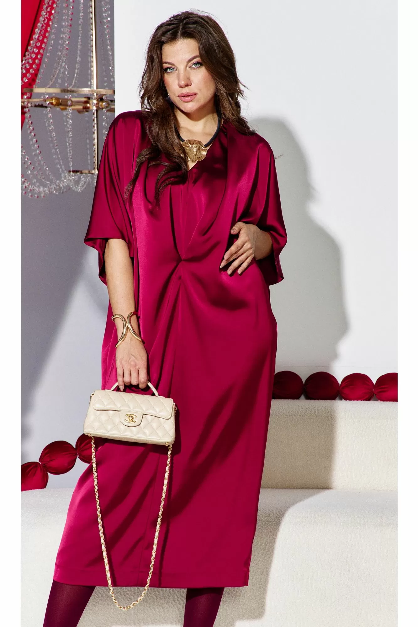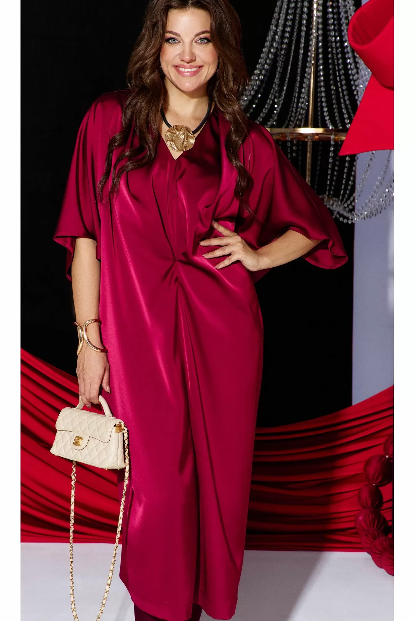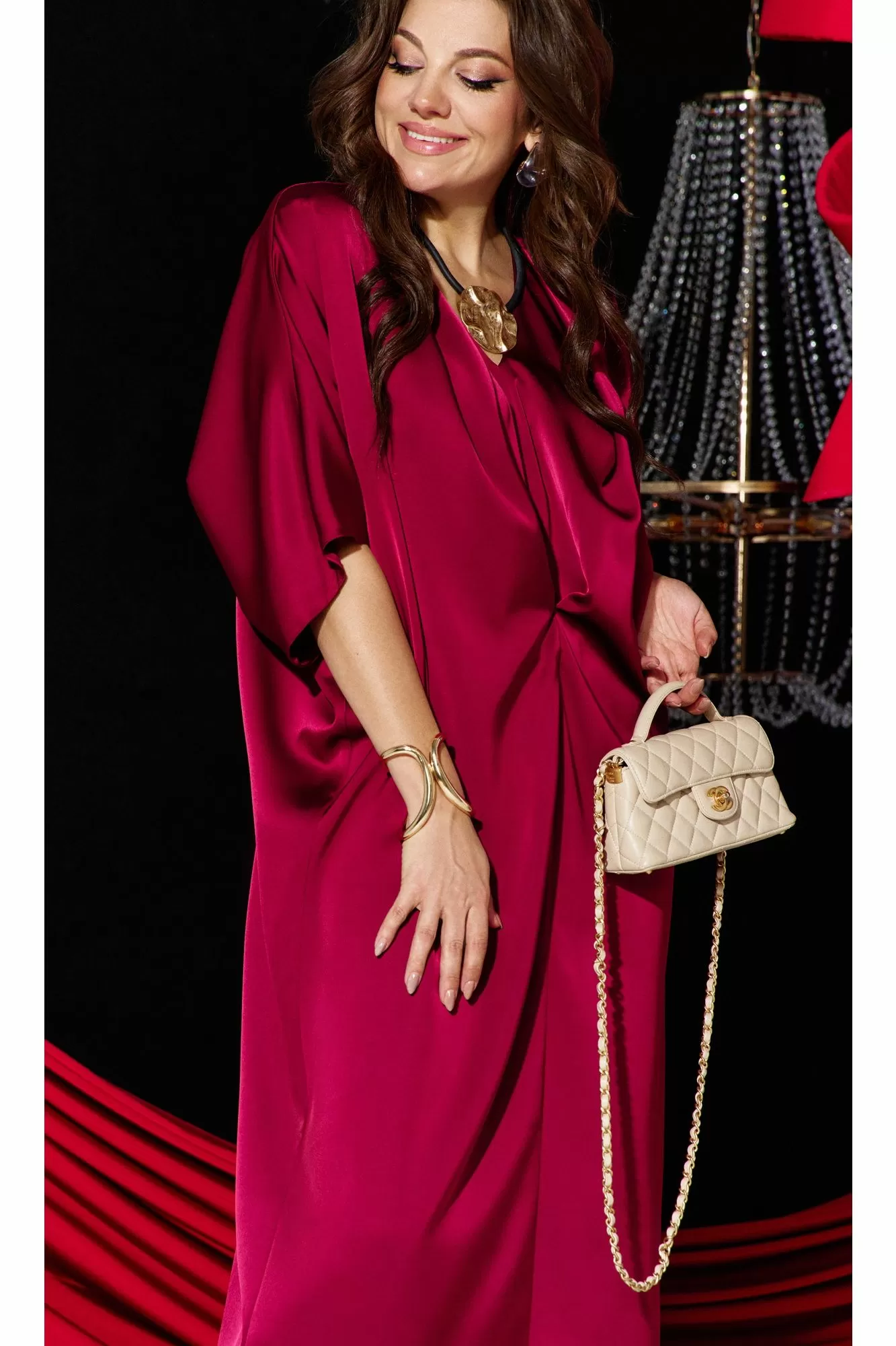 Это платье — олицетворение силы и изящности: ярко, но не кричаще. Уверенный, волнующий наряд для торжественных мероприятий и важных встреч. Силуэт «летучая мышь» мягко обтекает фигуру, создавая плавный переход между линией плеч и линией талии, затем свободно распускается по бокам, позволяя ткани играть волной при каждом движении. Вырез горловины V-образной формы подчёркивает изящную шею, а рукава добавляют образу лёгкую драматичность и женственность. По переду платья средний шов, с застроченной складкой выше уровня талии переходящую в складку по плечу. Спинка в платье со средним швом с разрезом от низа. Рукав в платье цельнокроеный со щеловидным вырезом проймы. Длина платья 123 см, длина рукава 48 см (р 52-56), 48,5 см (р 58-62).