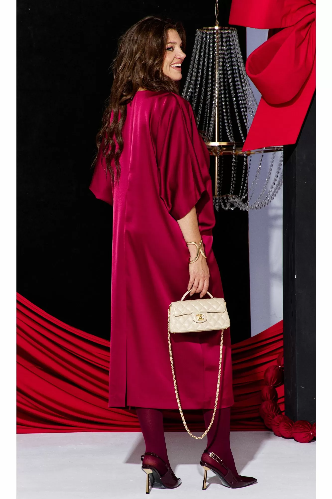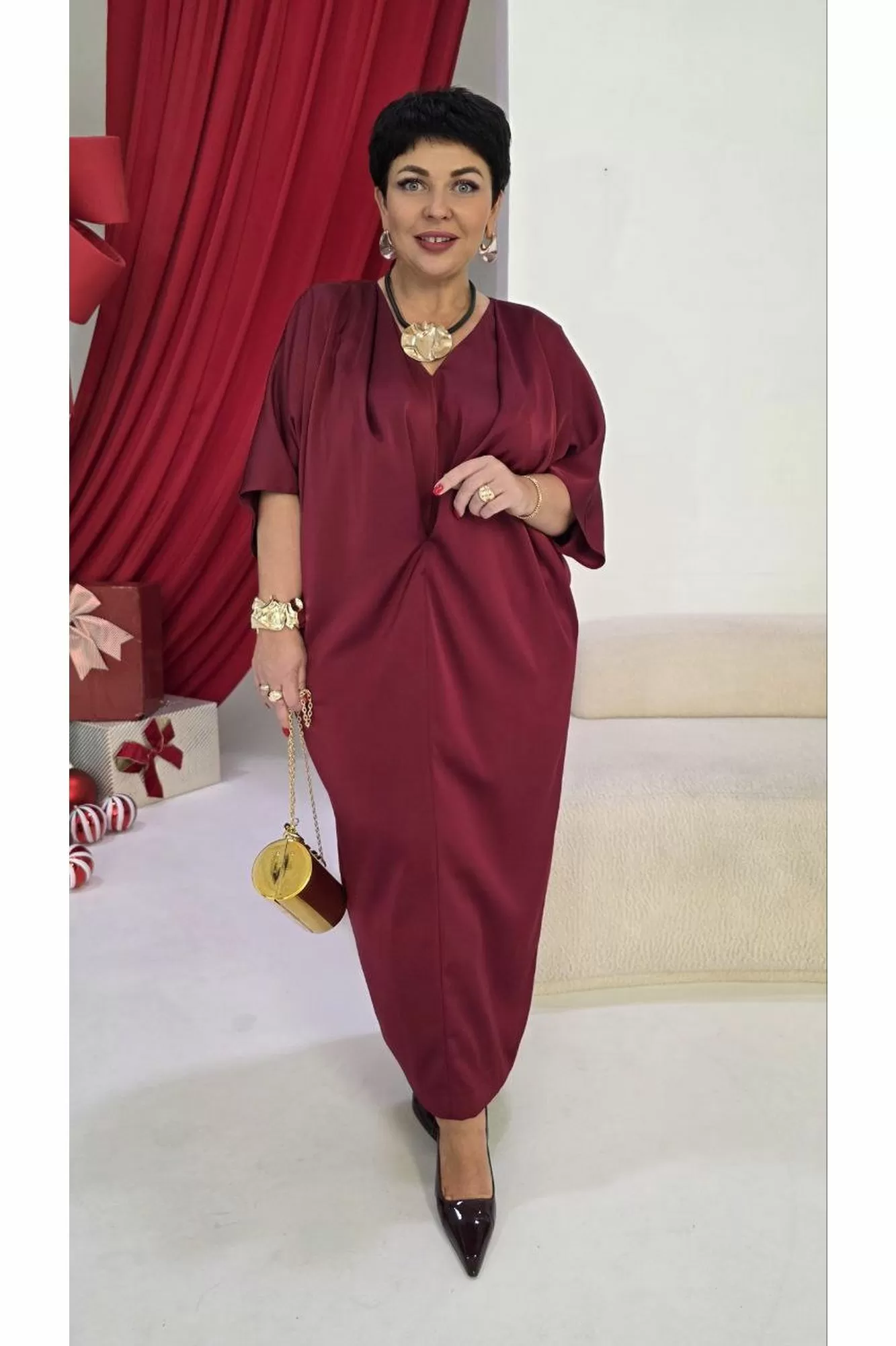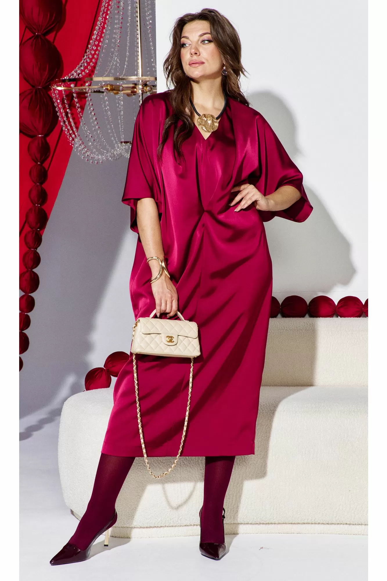 Это платье — олицетворение силы и изящности: ярко, но не кричаще. Уверенный, волнующий наряд для торжественных мероприятий и важных встреч. Силуэт «летучая мышь» мягко обтекает фигуру, создавая плавный переход между линией плеч и линией талии, затем свободно распускается по бокам, позволяя ткани играть волной при каждом движении. Вырез горловины V-образной формы подчёркивает изящную шею, а рукава добавляют образу лёгкую драматичность и женственность. По переду платья средний шов, с застроченной складкой выше уровня талии переходящую в складку по плечу. Спинка в платье со средним швом с разрезом от низа. Рукав в платье цельнокроеный со щеловидным вырезом проймы. Длина платья 123 см, длина рукава 48 см (р 52-56), 48,5 см (р 58-62).