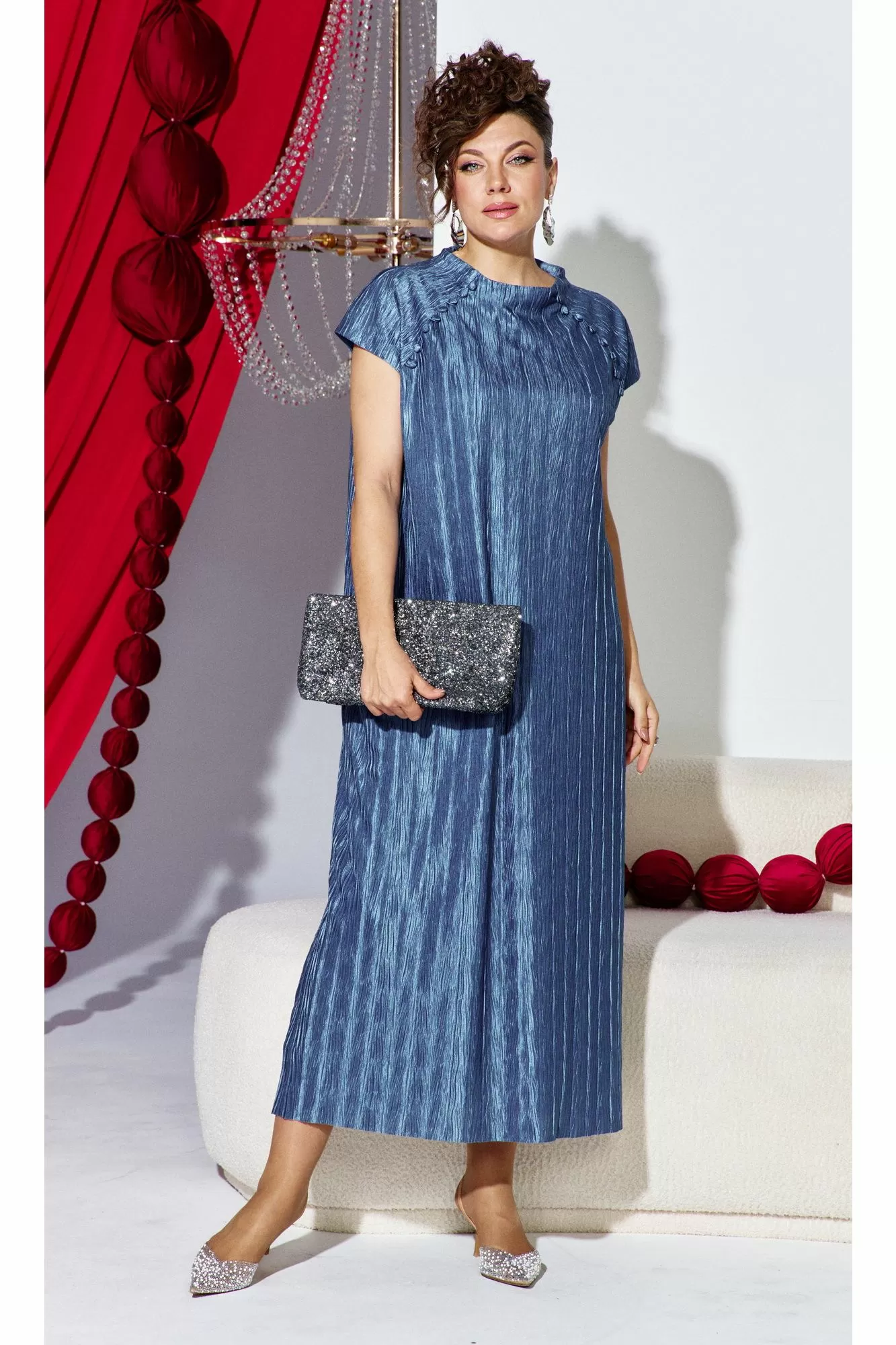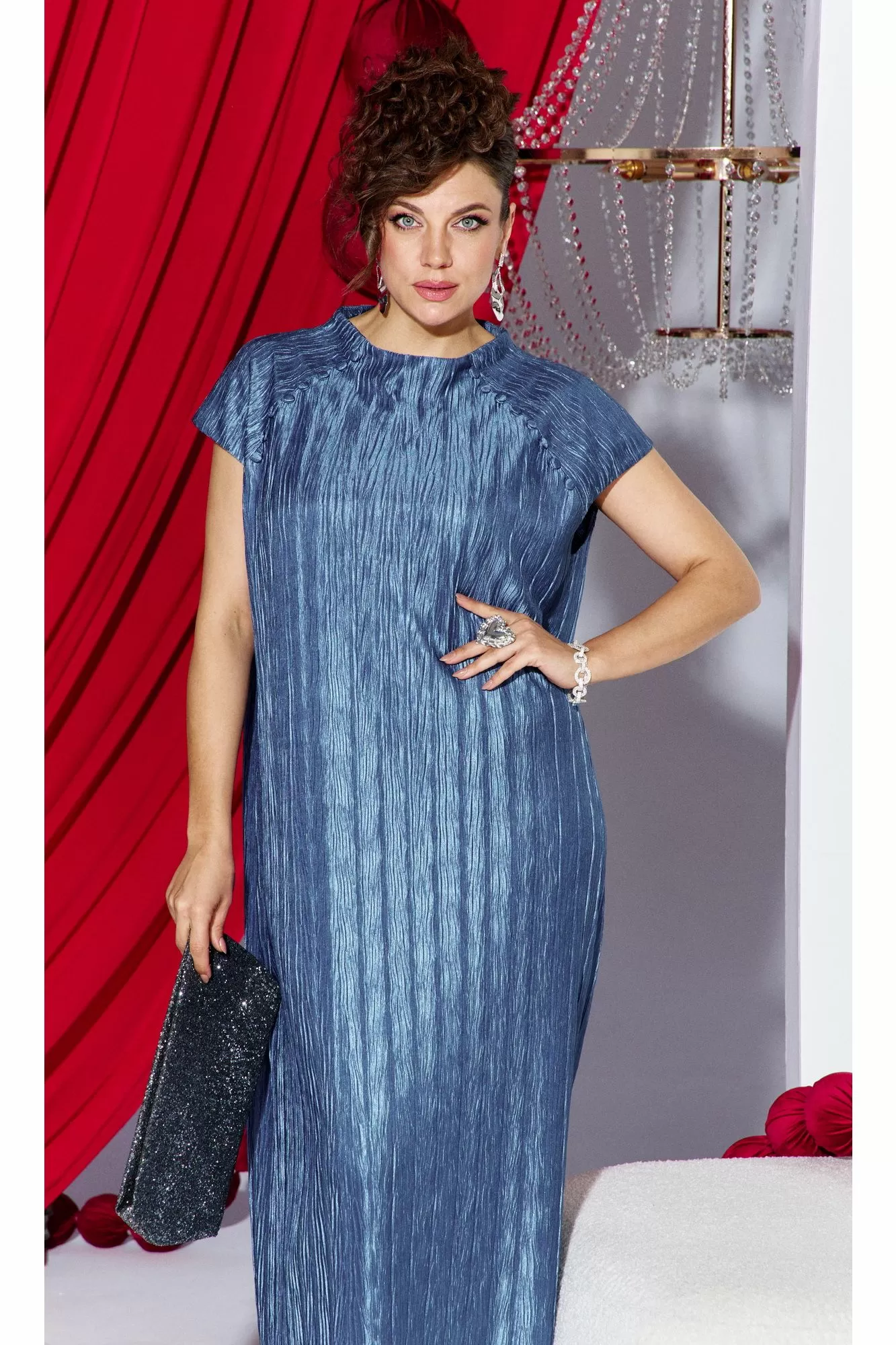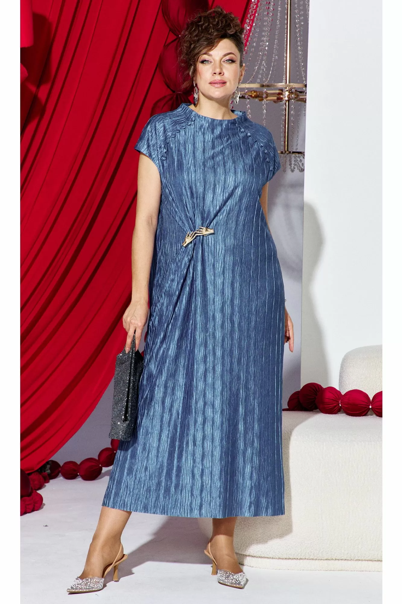 Платье прямого силуэта из фактурной ткани с крэш-эффектом, который создает в силуэте вертикальные заломы визуально вытягивающие фигуру и придает модели выразительный образ. Короткий рукав-реглан с навесными петельками и пуговицами, обтянутыми основной тканью рисует линию рельефа по переду и спинке сужая плечевой пояс. Платье на подкладке мягкое и удобное в движении. По спинке в среднем шве короткая потайная молния.