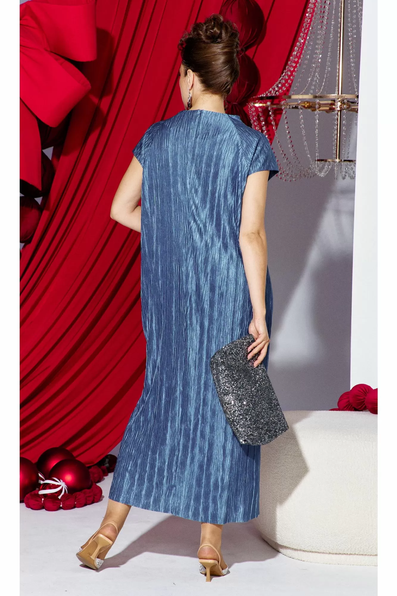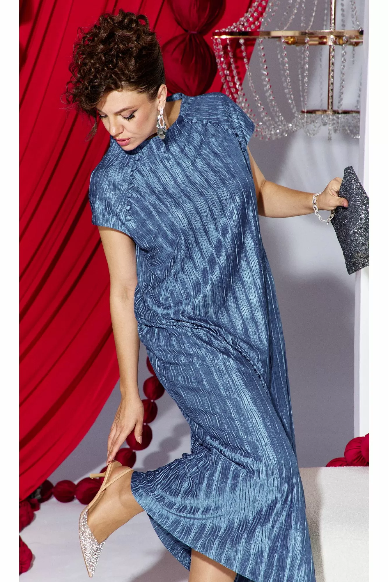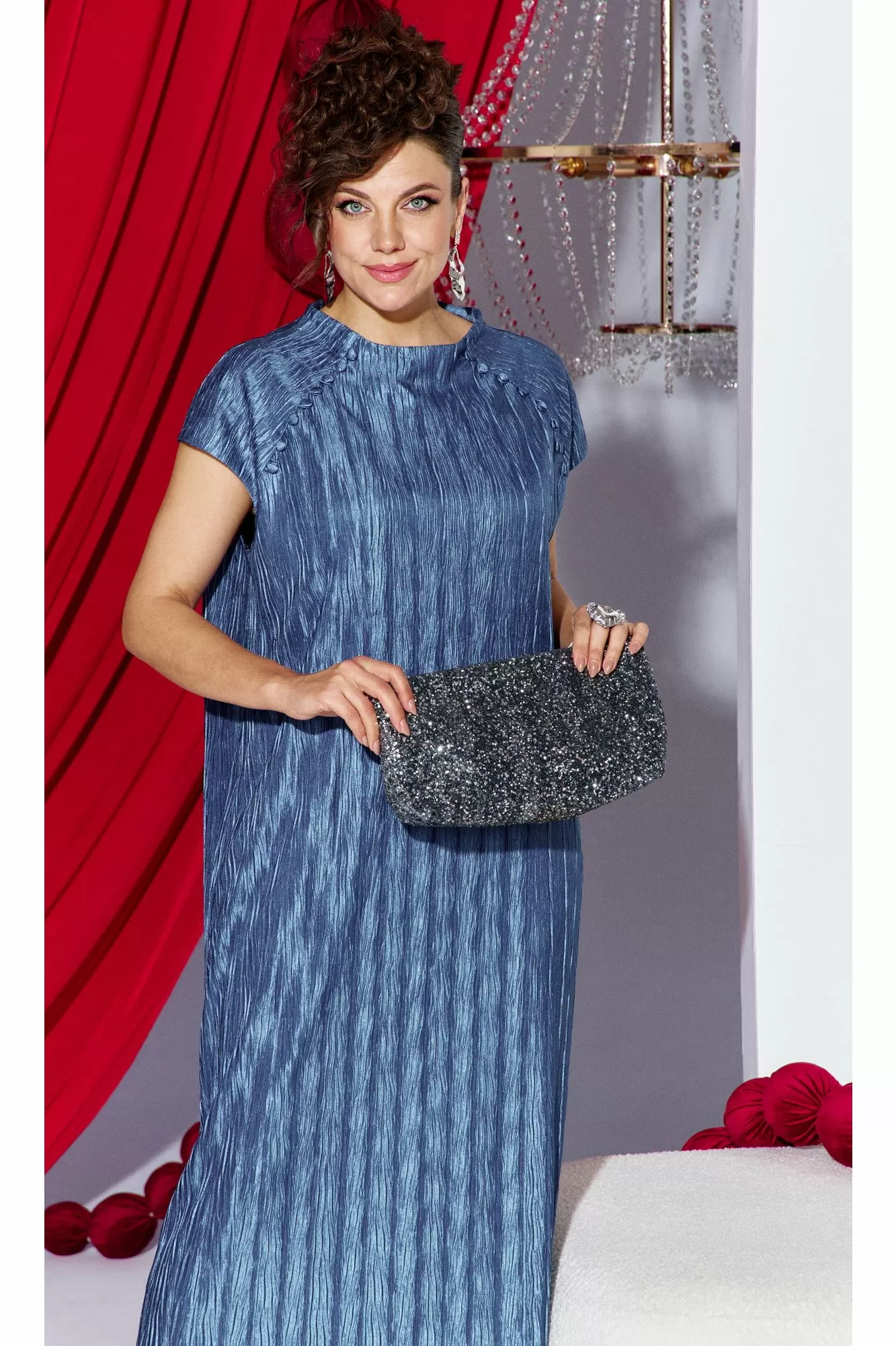 Платье прямого силуэта из фактурной ткани с крэш-эффектом, который создает в силуэте вертикальные заломы визуально вытягивающие фигуру и придает модели выразительный образ. Короткий рукав-реглан с навесными петельками и пуговицами, обтянутыми основной тканью рисует линию рельефа по переду и спинке сужая плечевой пояс. Платье на подкладке мягкое и удобное в движении. По спинке в среднем шве короткая потайная молния.