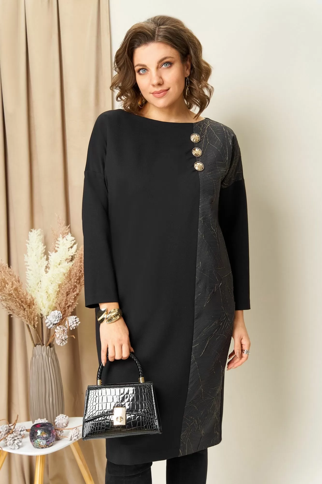 Эффектное платье полуприлегающего силуэта, сочетающая в себе лаконичность и элегантность классического футляра с современным и стильным декором. Вертикальная вставка добавляет модели архитектурной четкости, , а декоративные пуговицы служат изящной деталью. Горловина платья выполнена в форме "лодочка". Для удобства в боковых швах плятья есть потайные карманы. Рукав слегка спущенный, 7/8. Длина платья- 102 см по центру спинки.