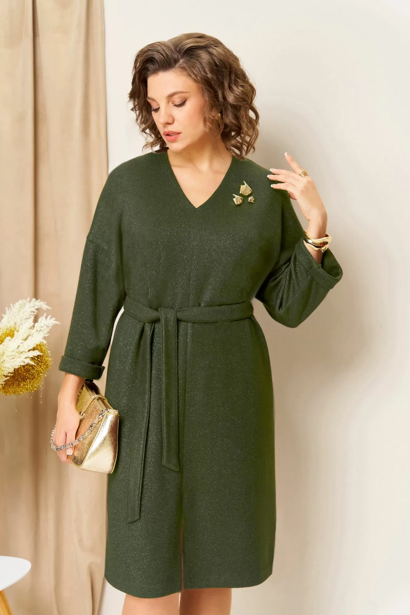 Нарядное платье из эластичного трикотажа с легким мерцающим эффектом, прямого полуприлегающего силуэта с акцентной V-образной горловиной. Рукава платья на цельнокроеной основе, длиной 7/8. Длина платья по центру спинки- 104см.. Спереди небольшой вырез для максимального удобства. Платье украшено пришивными геометричными пуговицами. Пояс- в комплекте изделия.