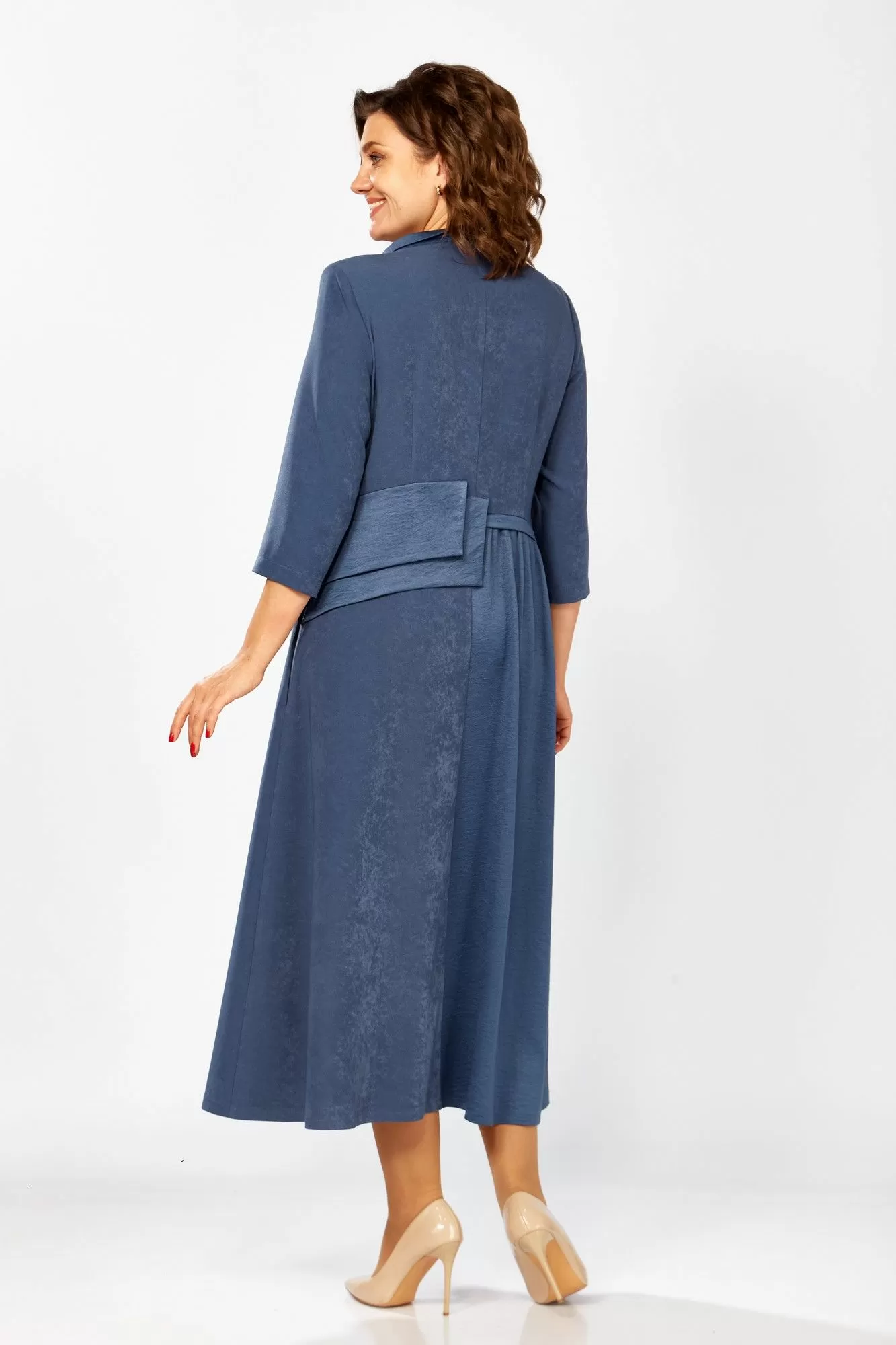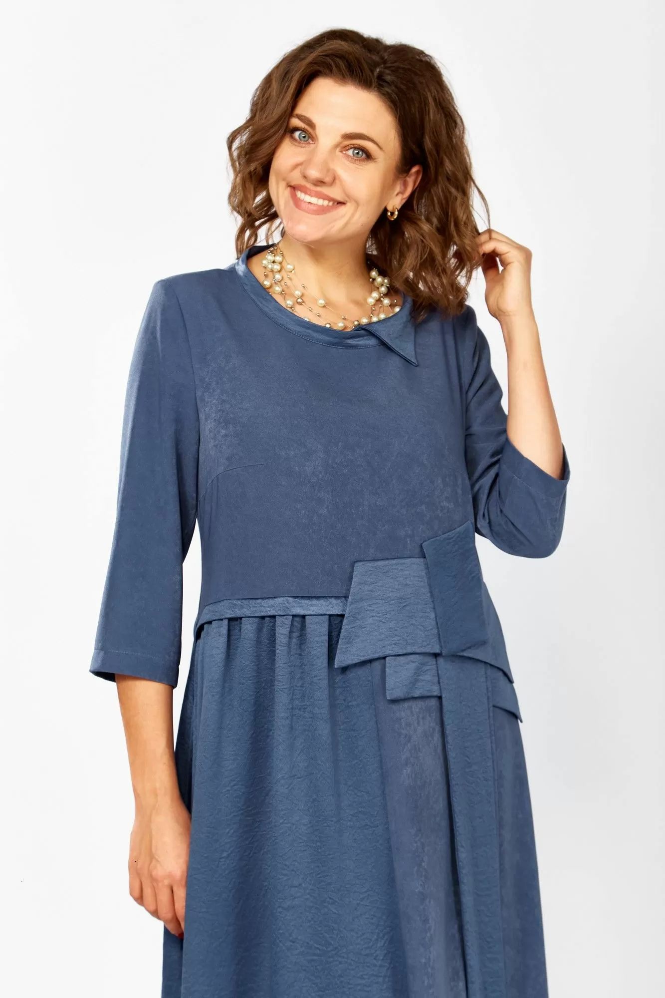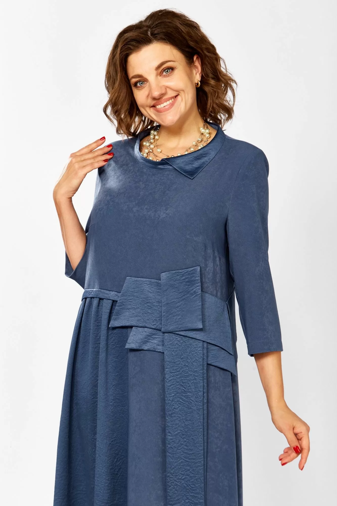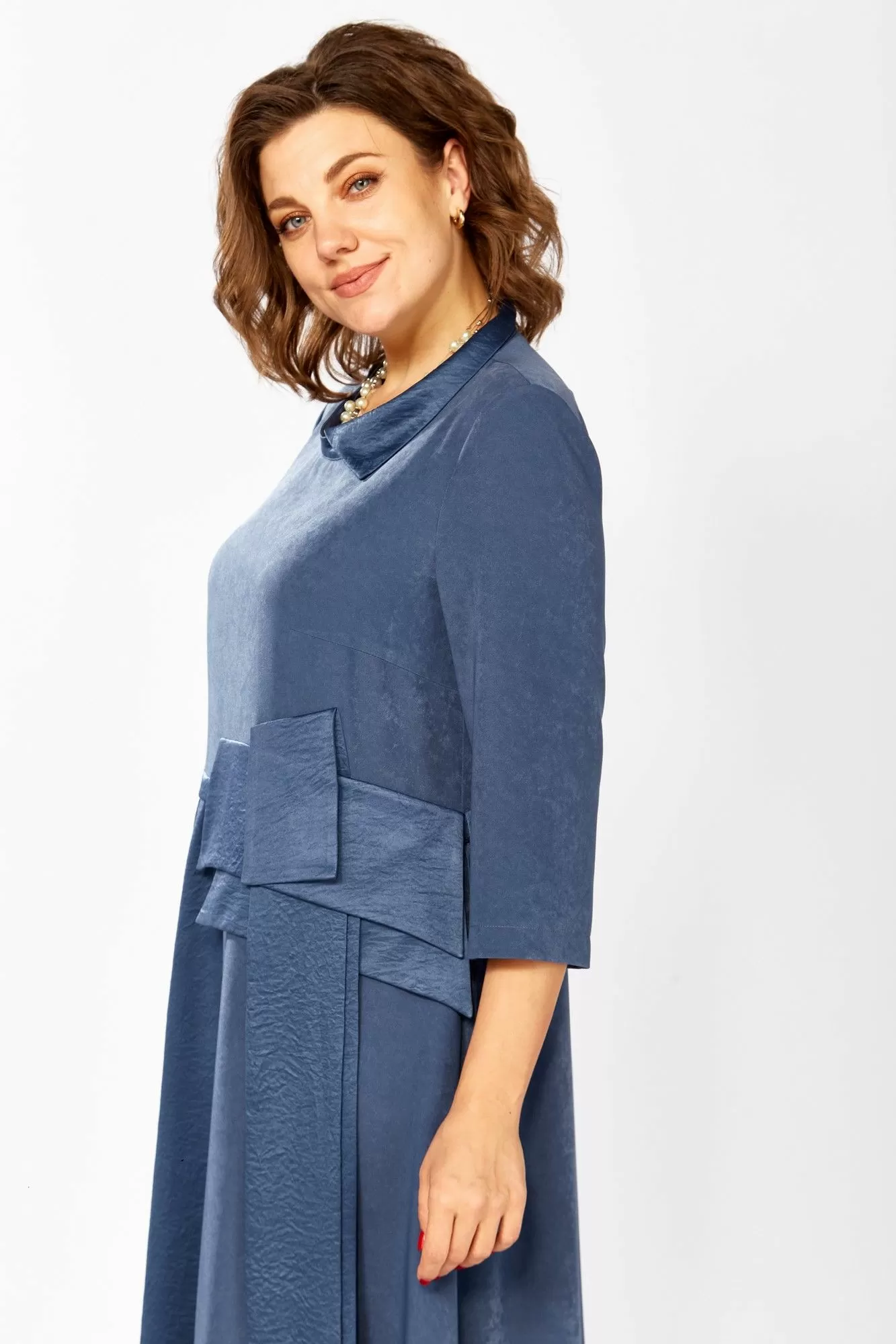 Нарядное платье изготовлено из двух видов ткани-бархатистой и блестящей текстурированной в красивом серенево-голубом оттенке.Полуприлегащий силуэт с отрезной, слегка завышенной, талией. Нижняя часть платья А-силуэта с одной стороны по линии талии со сбокой. Рукав 3/4, втачной. Вырез горловины округлой формы со стойкой и фантазийным воротником. Особенностью этой модели, которая предает образу торжественность, являются геометричные детали настроченные на пояс спереди и сзади по спинке и символизирующие нарядный королевский бант. Платье идеально подойдет на любое торжество-юбилей,свадьбу и многие другие мероприятия. Длина изделия по среднему шву спинки 128 см.