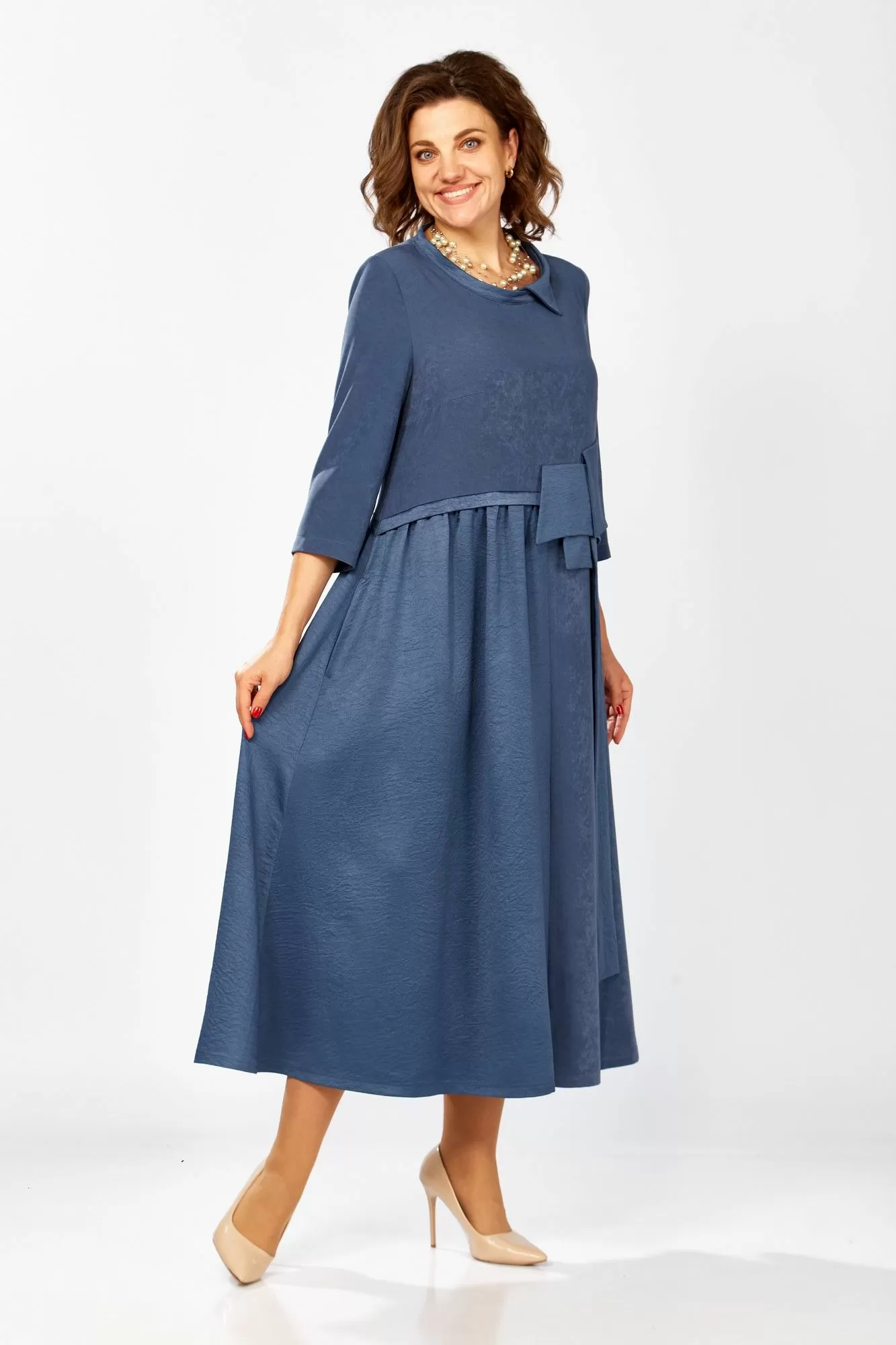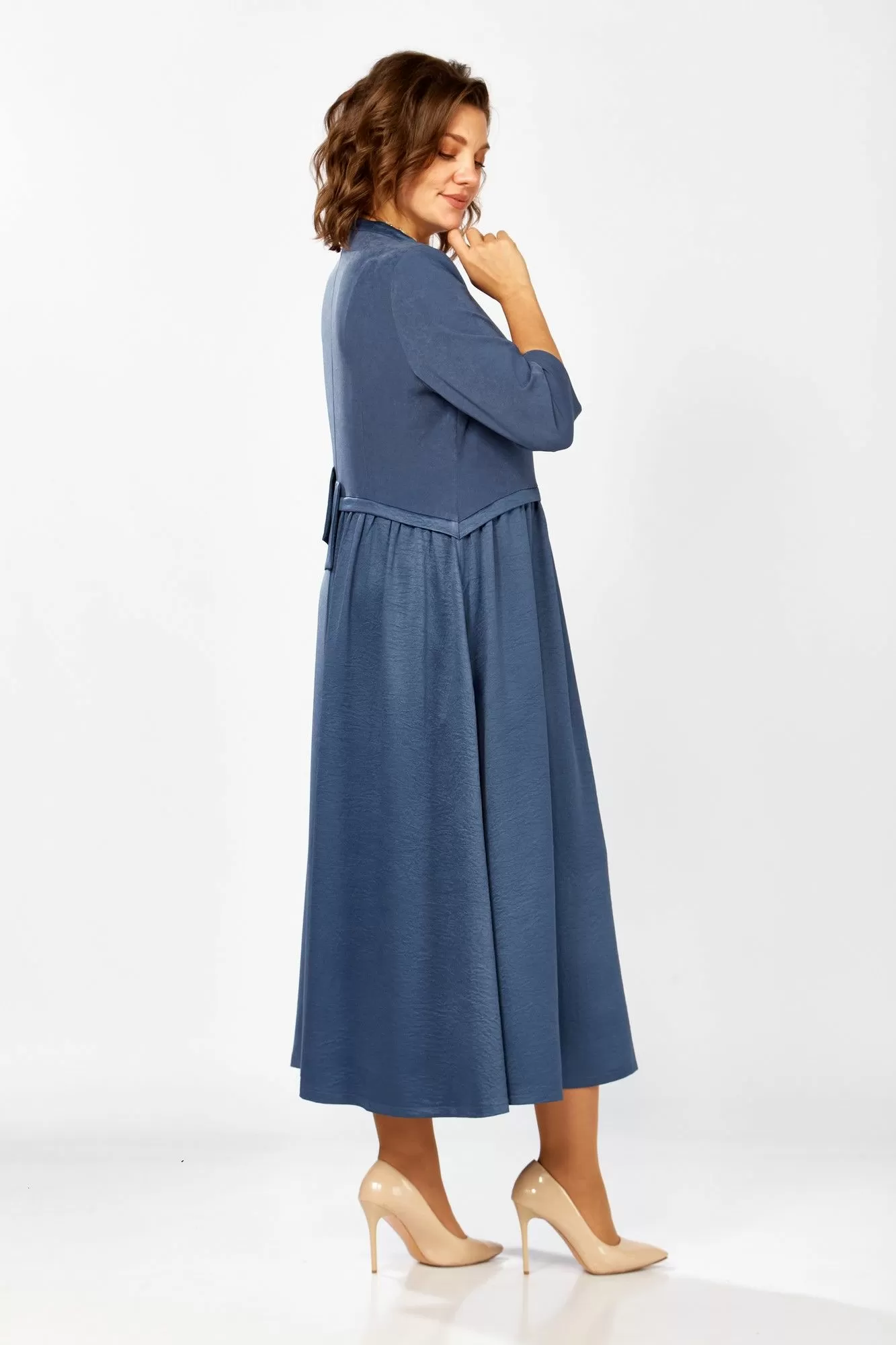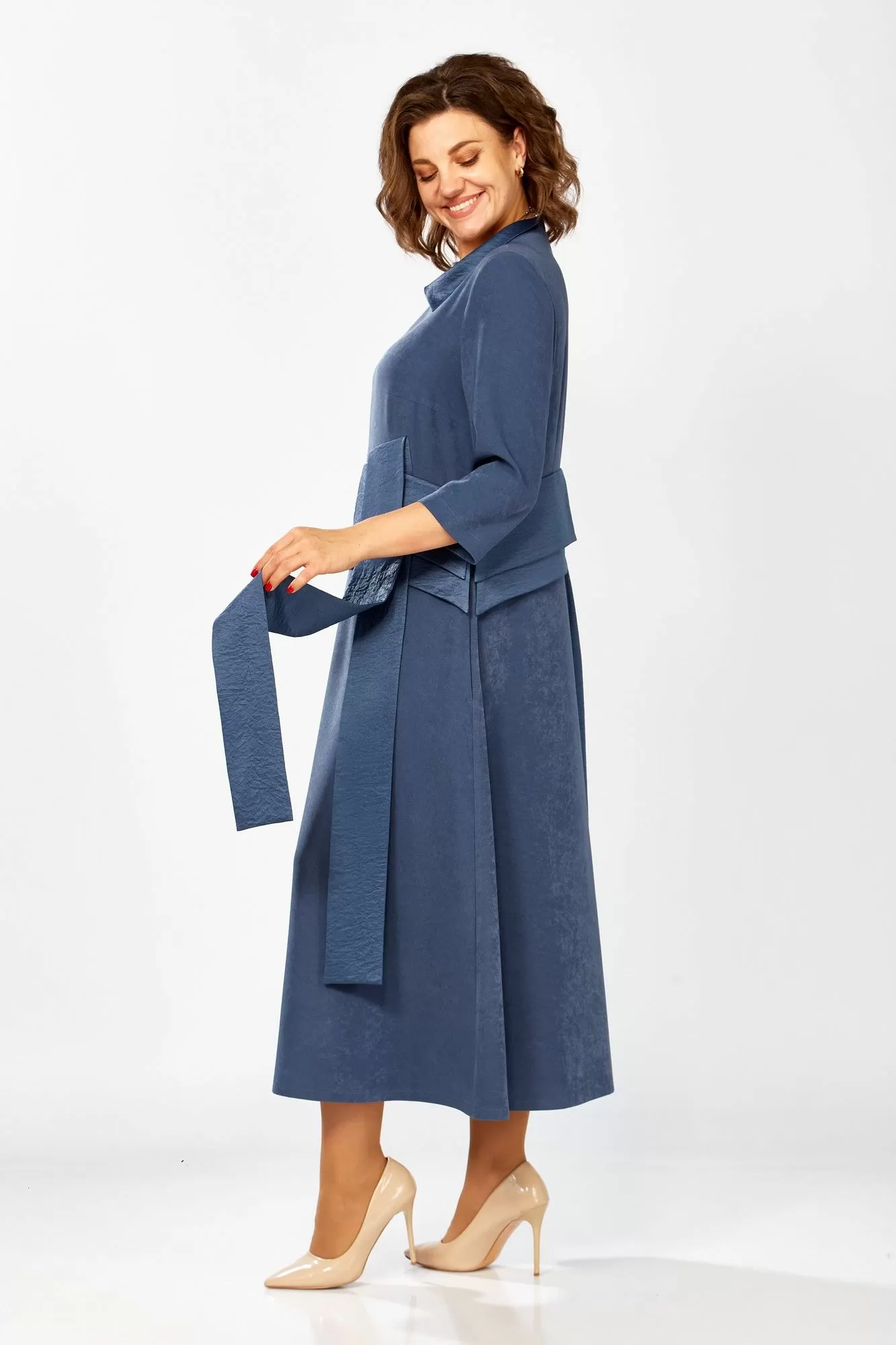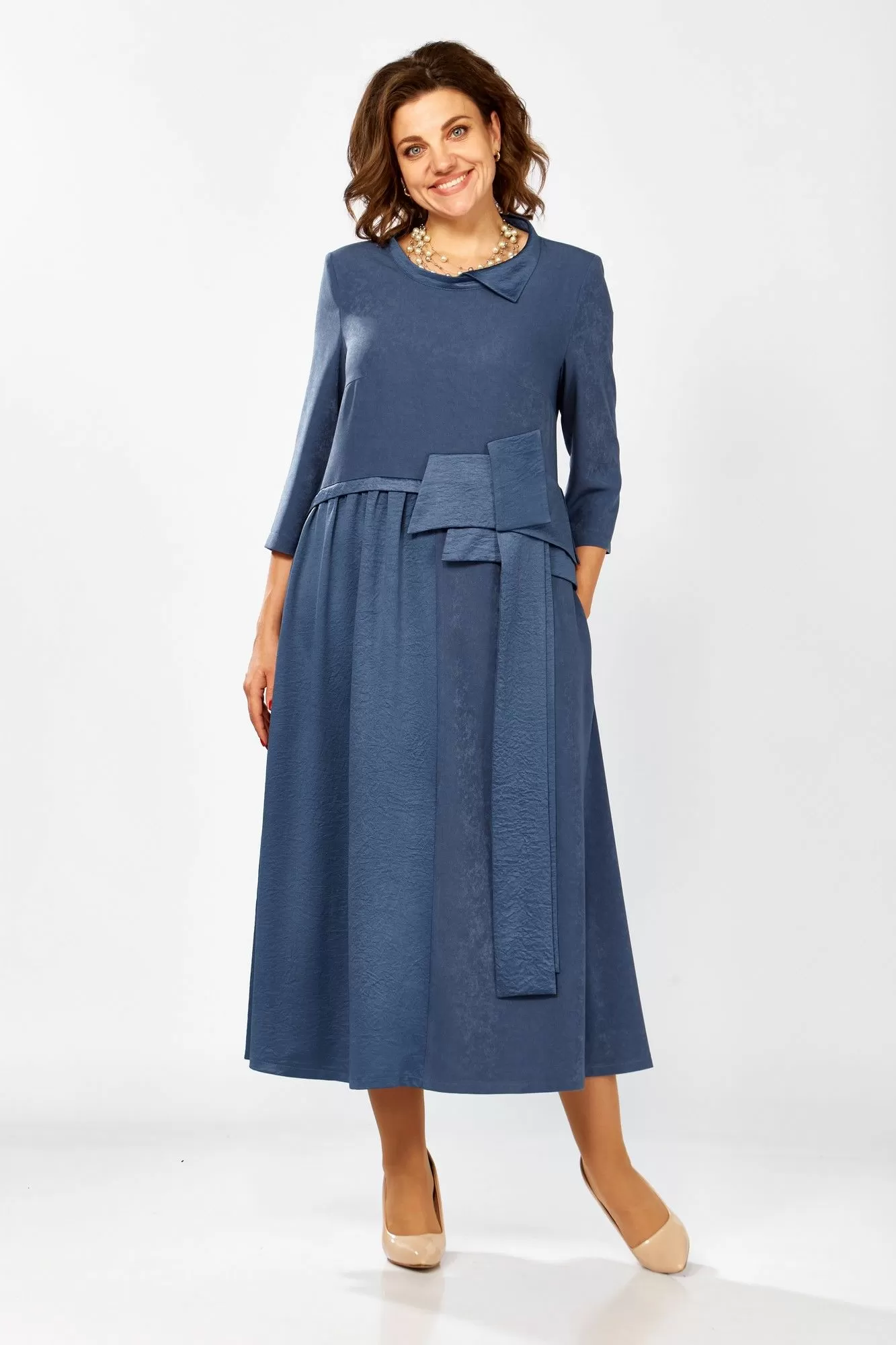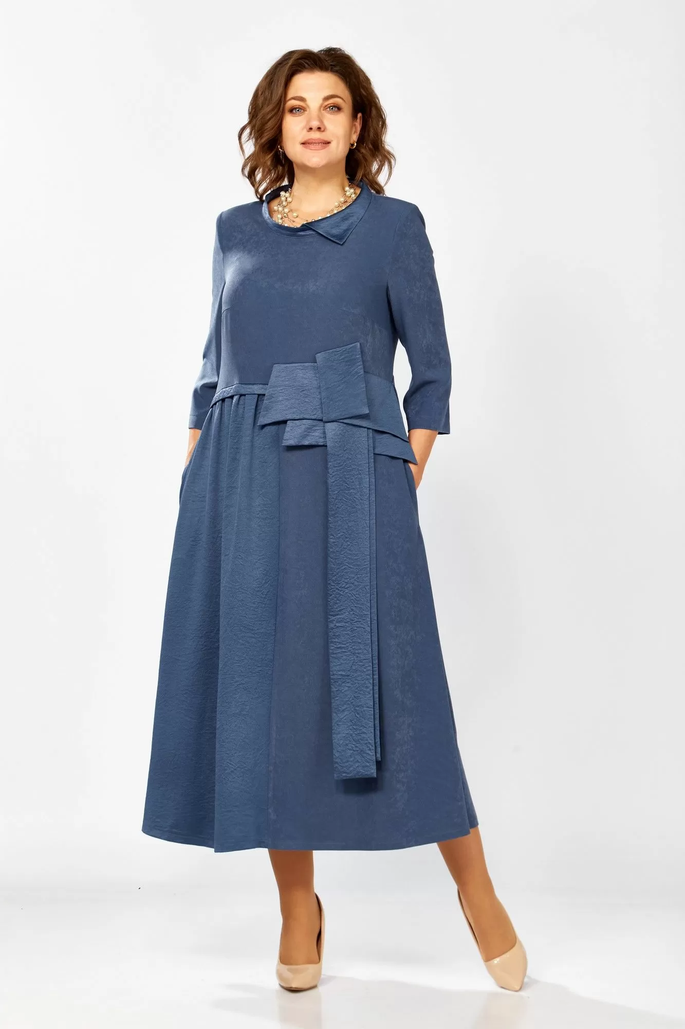 Нарядное платье изготовлено из двух видов ткани-бархатистой и блестящей текстурированной в красивом серенево-голубом оттенке.Полуприлегащий силуэт с отрезной, слегка завышенной, талией. Нижняя часть платья А-силуэта с одной стороны по линии талии со сбокой. Рукав 3/4, втачной. Вырез горловины округлой формы со стойкой и фантазийным воротником. Особенностью этой модели, которая предает образу торжественность, являются геометричные детали настроченные на пояс спереди и сзади по спинке и символизирующие нарядный королевский бант. Платье идеально подойдет на любое торжество-юбилей,свадьбу и многие другие мероприятия. Длина изделия по среднему шву спинки 128 см.