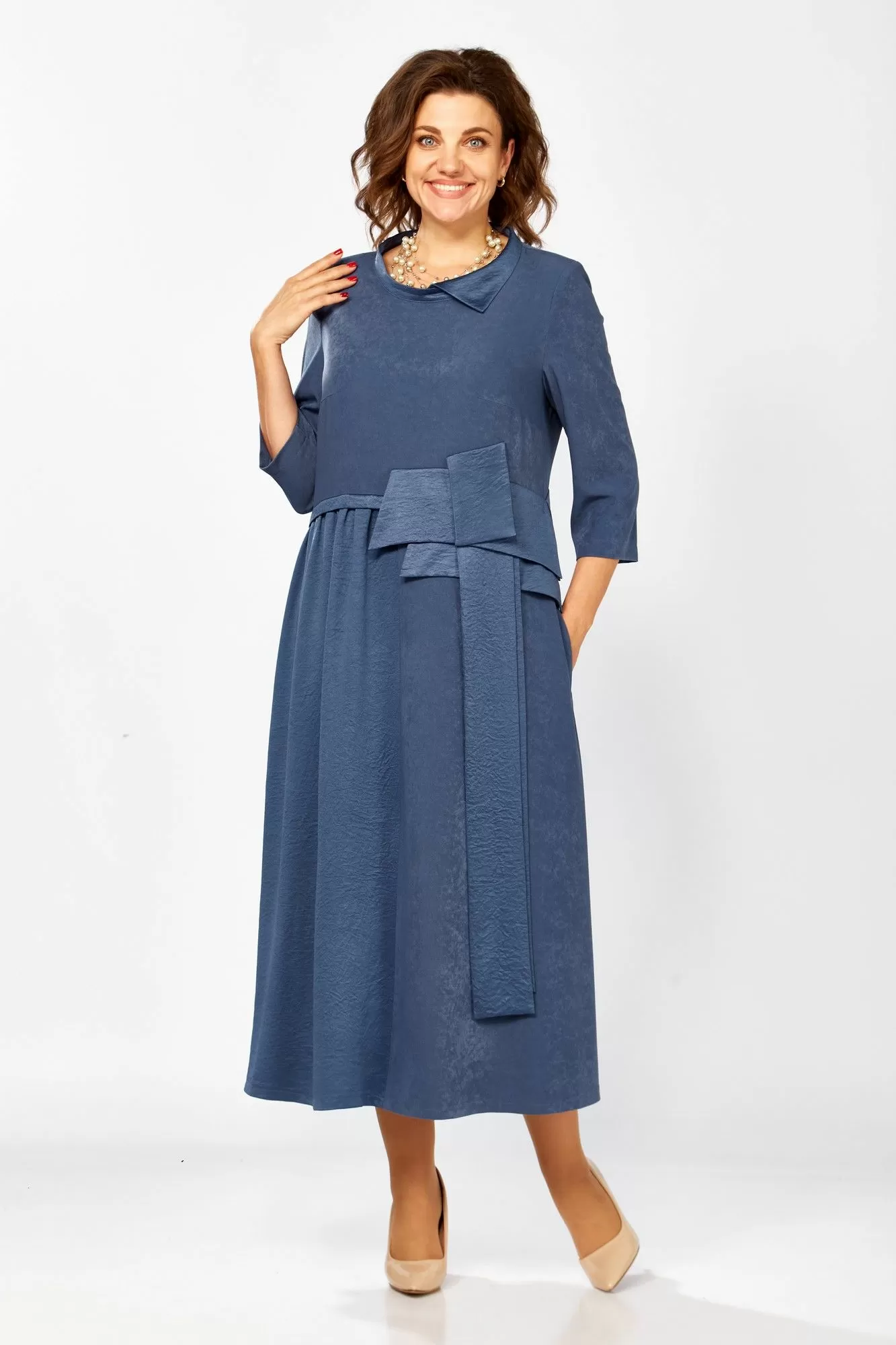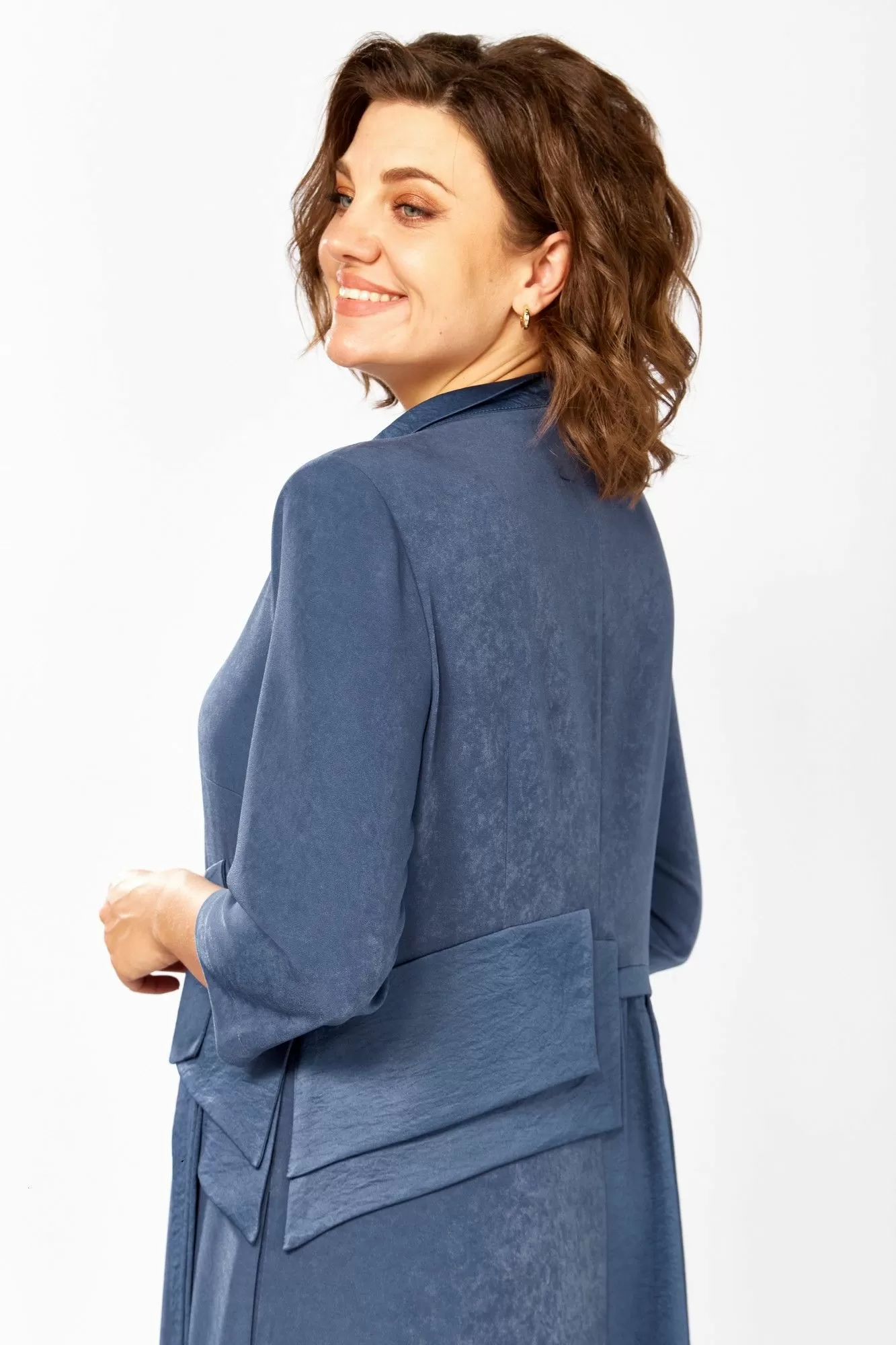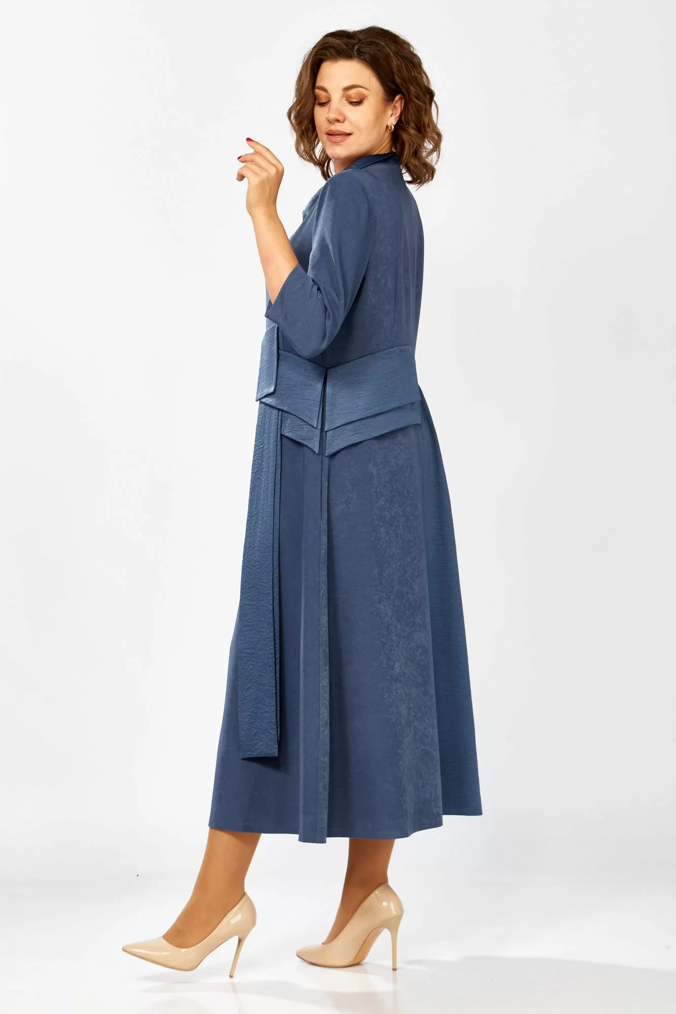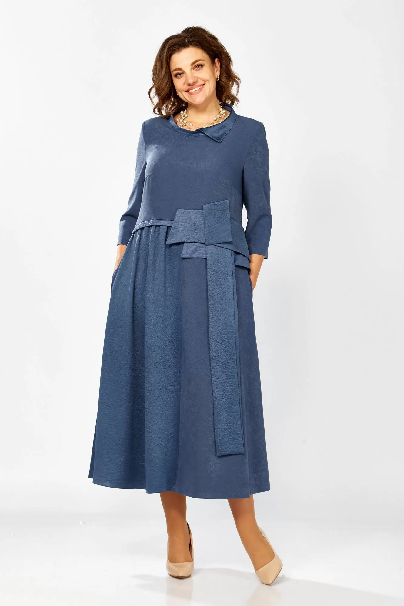 Нарядное платье изготовлено из двух видов ткани-бархатистой и блестящей текстурированной в красивом серенево-голубом оттенке.Полуприлегащий силуэт с отрезной, слегка завышенной, талией. Нижняя часть платья А-силуэта с одной стороны по линии талии со сбокой. Рукав 3/4, втачной. Вырез горловины округлой формы со стойкой и фантазийным воротником. Особенностью этой модели, которая предает образу торжественность, являются геометричные детали настроченные на пояс спереди и сзади по спинке и символизирующие нарядный королевский бант. Платье идеально подойдет на любое торжество-юбилей,свадьбу и многие другие мероприятия. Длина изделия по среднему шву спинки 128 см.